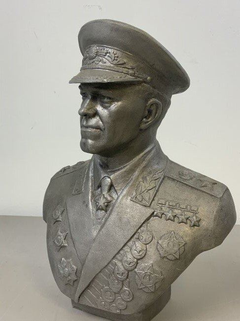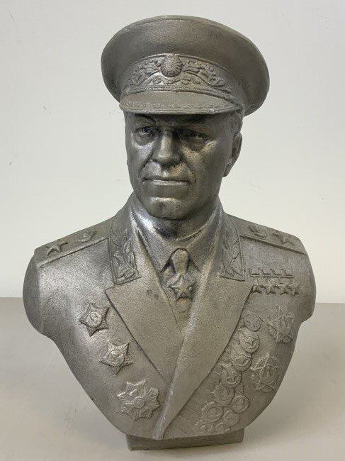 This 30 cm bust dates from the 1960s or 1970s and is made from metal. The detail work is fantastic and the awards are fully recognizable. Although not signed, the bust meet the standard of top contemporary artists of the Soviet Union. The bust depicts Marshal Zhukov wearing his M1954 Marshal of the Soviet Union parade uniform and among the awards can be seen the titles of Hero of Soviet Union as well as Zhukov's double awarded Order of Victory and Marshal star.