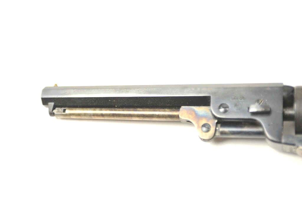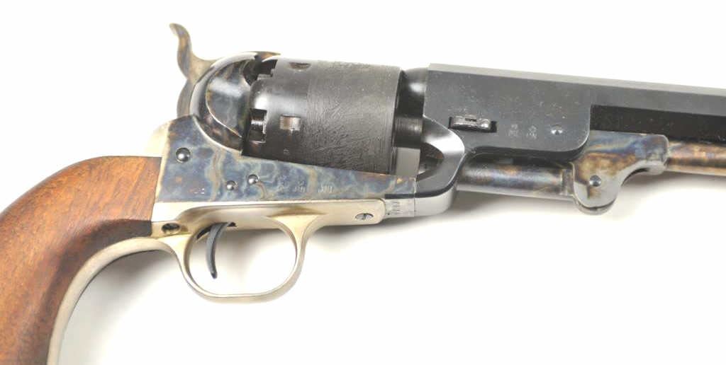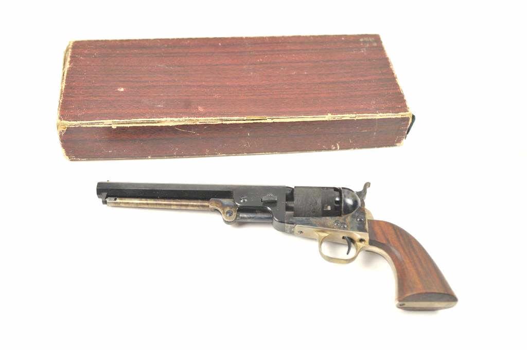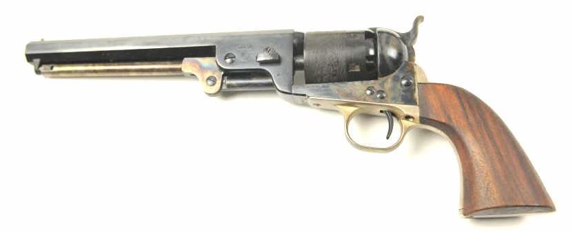 Uberti 1851 Navy black powder pistol, #7376, .36 cal., blue and color case hardened with brass trigger guard and back strap, brass bead front sight, with wood grips. Revolver is in near excellent condition, appearsunfired and unused. Vivid case colors and retains almost all it’s original finish. Action functions without issues. Includes the original box and paperwork. (Exempt) Est. $175-350