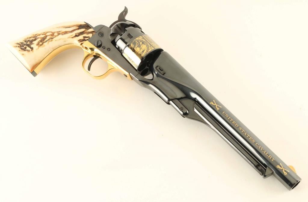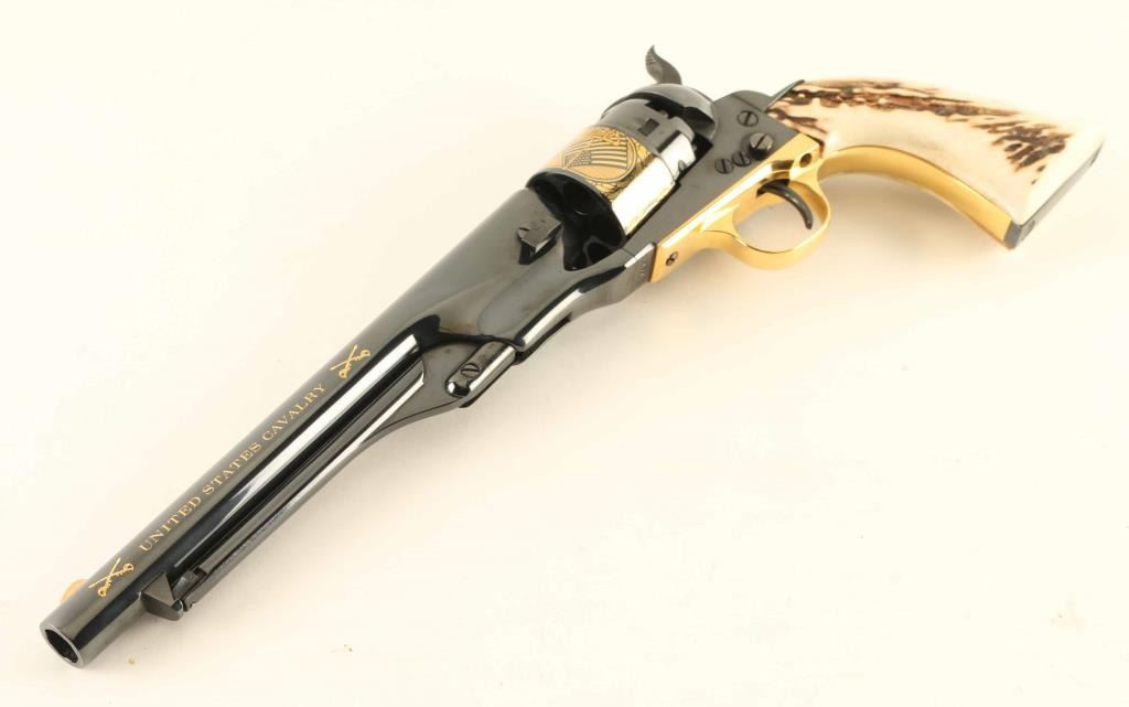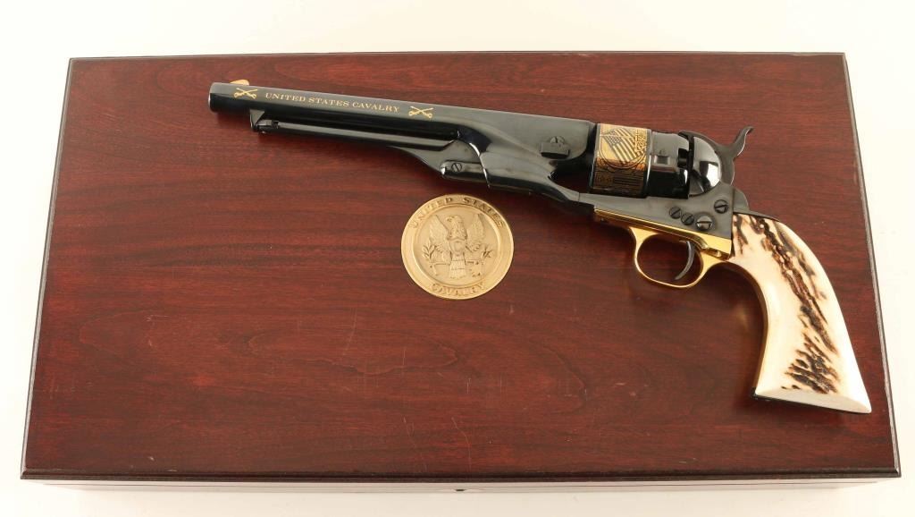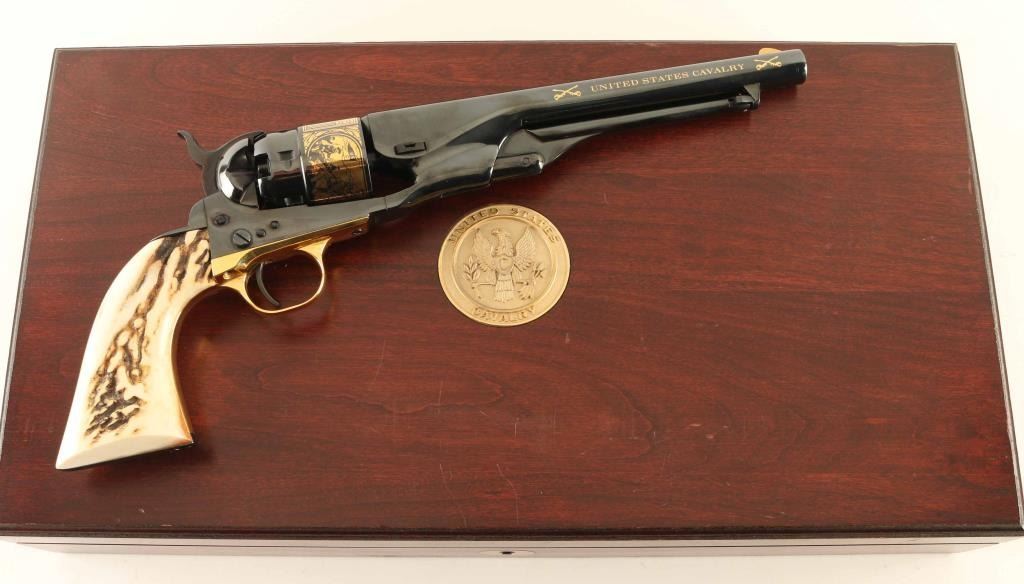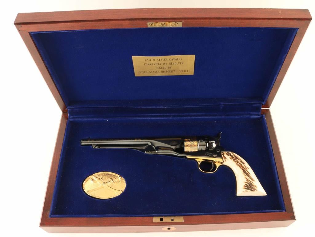 SN: 696 Commemorative revolver features high polish blued finish, stag or bone grips, gold colored triggerguard, gold colored decorative crossed sabers and "UNITED STATES CAVALRY" on both sides of barrel, and cylinder scene with cavalry soldiers and US flag. Overall condition is like new with few signs of handling. Includes brass colored crossed saber belt buckle, blue felt lined fitted walnut presentation case. Plaque inside case lid describes "UNITED STATES CAVALRY COMMEMORATIVE REVOLVER ISSUED BY UNITED STATES HISTORICAL SOCIETY". Box lid has inset coin type plaque with eagle emblem and "UNITED STATES CAVALRY". Condition is NRA Excellent - like new *** Antique Firearm ***