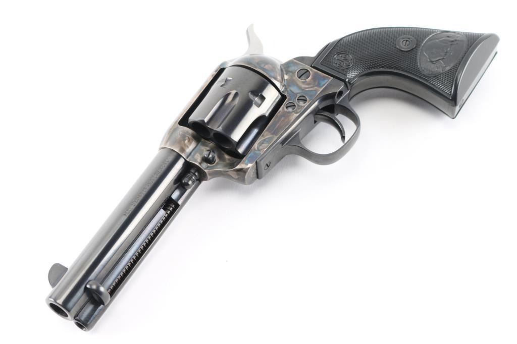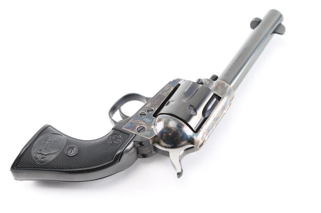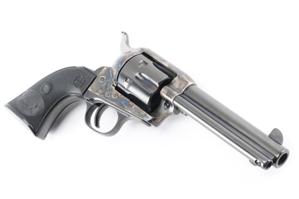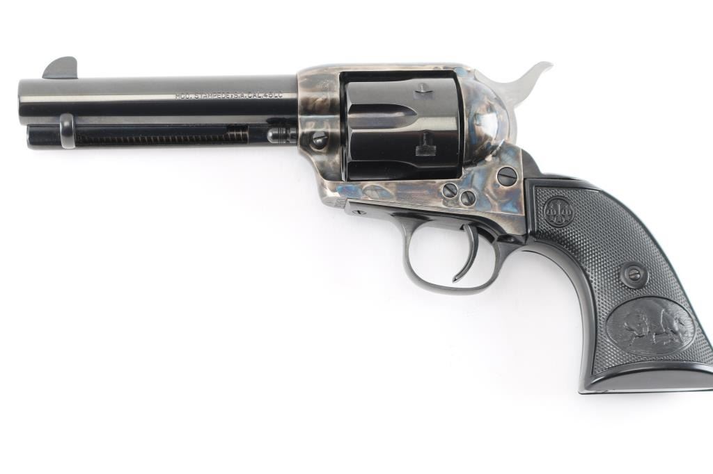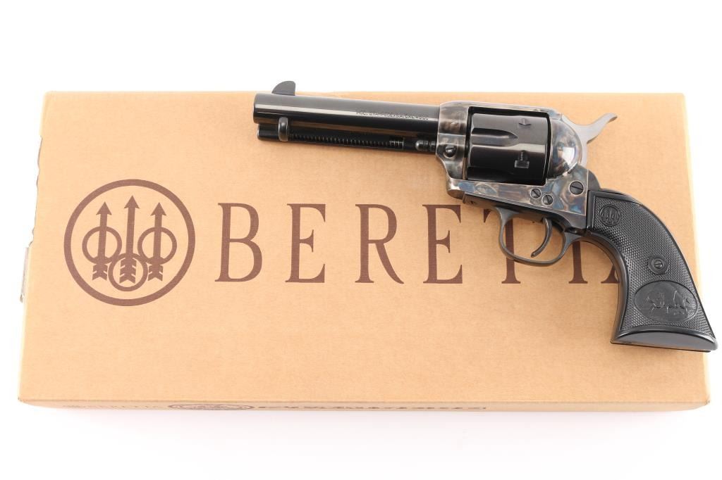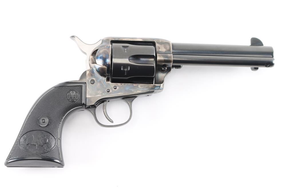 Single-action revolver, manufactured circa 2005, by Uberti in Italy, imported by Beretta USA, Accokeek MD. Blued/case hardened finish, 4 3/4" barrel, ejector rod, blade front sight, square notched rear sight, fluted six-shot cylinder, smooth wide trigger. knurled hammer spur and two-piece checkered black plastic grips w/ buffalo scene & Beretta decor. Overall condition is like new with few signs of handling. Includes factory cardboard box.