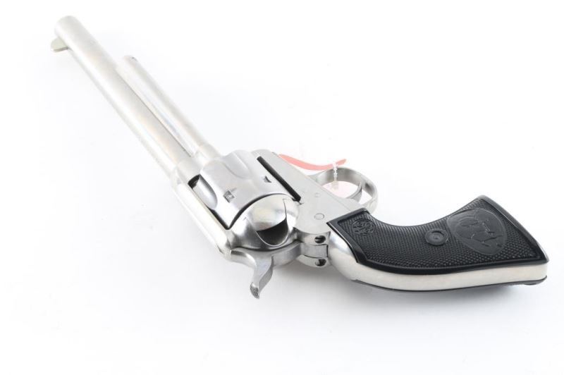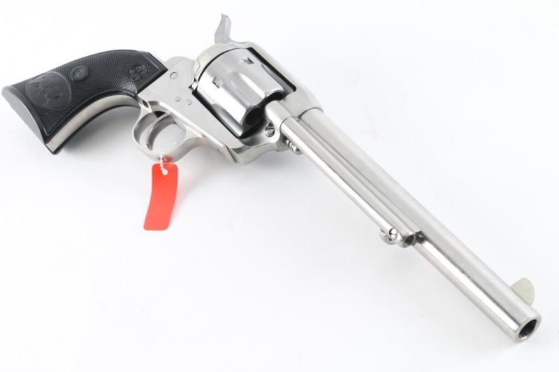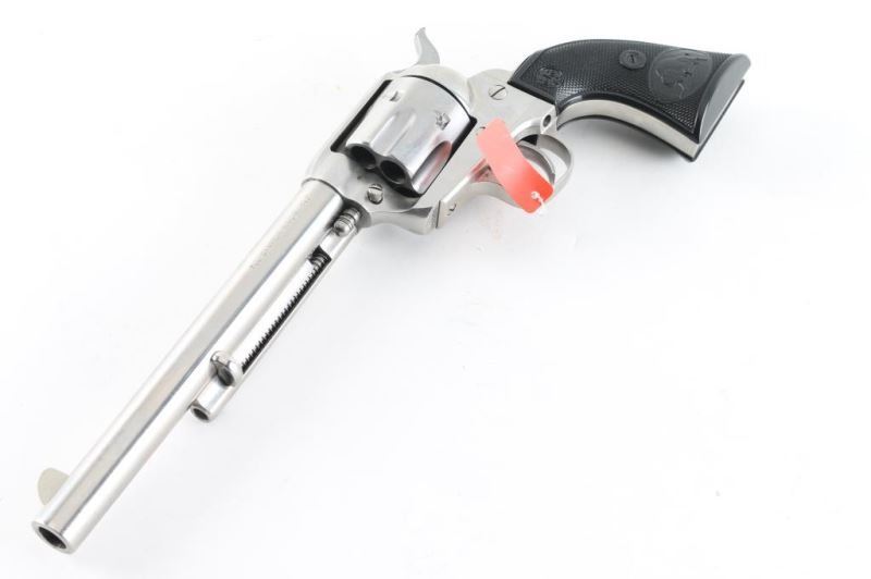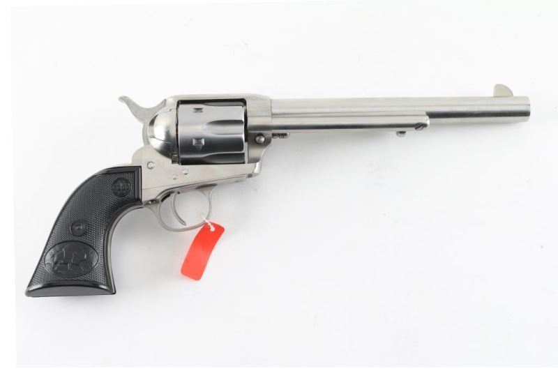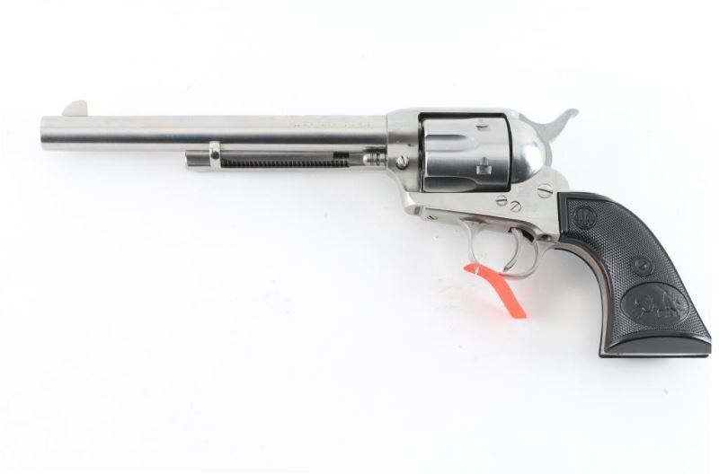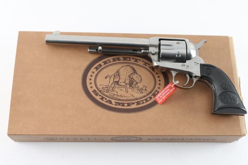 Single-action revolver, manufactured by Uberti in Italy, imported by Beretta USA, Accokeek MD. Stainless steel finish, 7 1/2" barrel, ejector rod, blade front sight, square notched rear sight, fluted six-shot cylinder, smooth wide trigger. knurled hammer spur and two-piece checkered black plastic grips w/ buffalo scene & Beretta decor. Metal has a few minor scratches. Grips are excellent. Bore/cylinders are excellent/bright. Action is smooth/tight. Serial number matched on frame, cylinder, and loading gate. Includes factory cardboard ,manual matched to the gun,Condition is NRA Excellent. Modern Firearm.