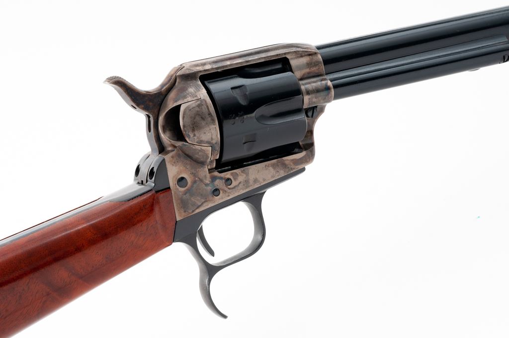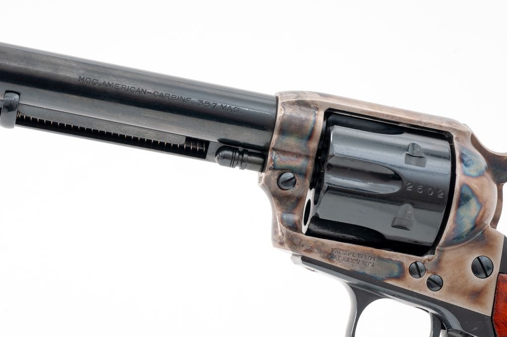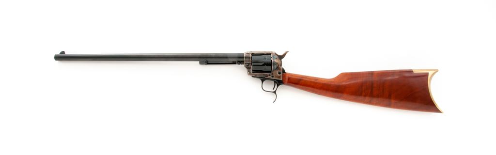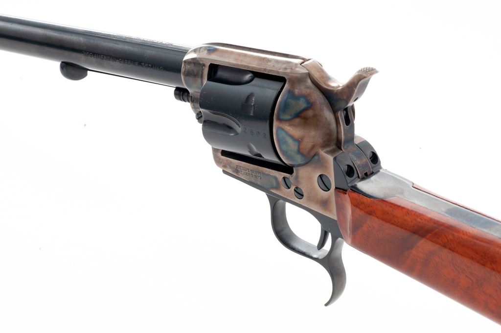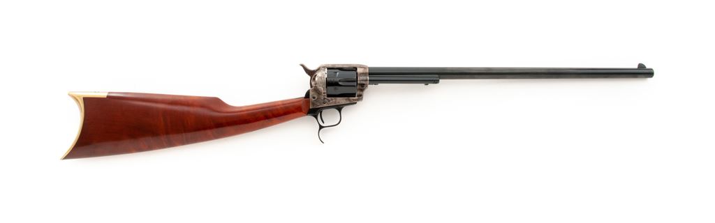 Uberti EMF American Revolving Carbine, #J82502, .357 mag. cal., 18'' barrel, blue and case hardened finish, hardwood buttstock, and brass crescent buttplate. Condition is excellent, lacking even an index mark to cylinder. Stock appears as new. Crisp action, bright bore. Est.: $400-$600. (Modern)(Sierra Sid's Casino, Sparks, NV.)