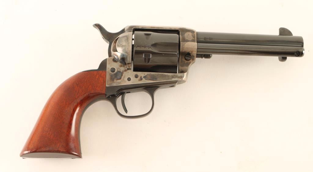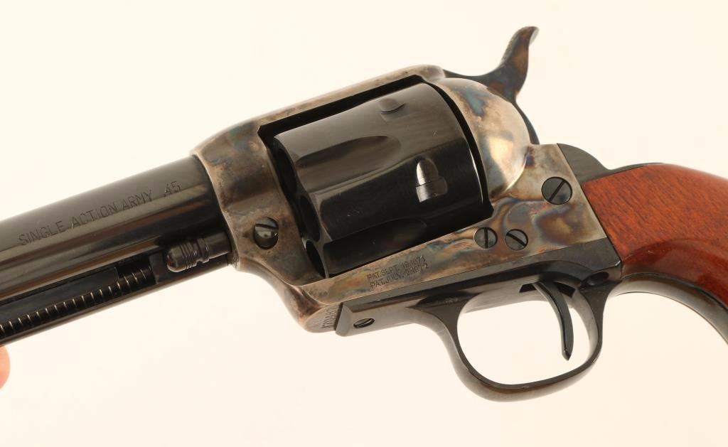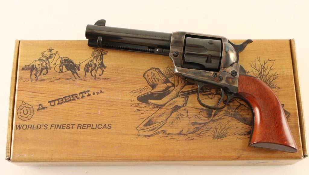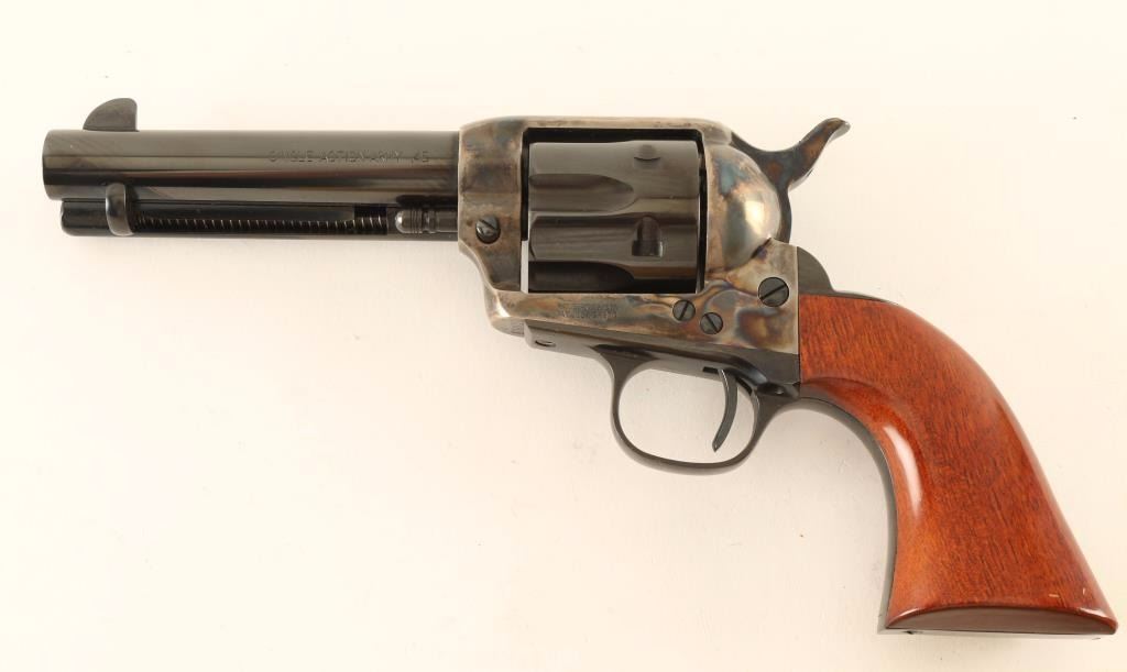 Fine Italian made single-action revolver chambered in .45 Colt, circa 2006. Features a blued/case hardened finish, 4 3/4" barrel, blade front sight, 'v' notched rear sight, ejector rode, fluted six-shot cylinder, smooth trigger, checkered hammer spur, and one-piece vanished walnut grip. Includes the original factory cardboard box with documents. Revolver exhibits approximately 99% of it's original finish showing little to no visible wear. Action is smooth with tight lock-up, bore is pristine and wood grip is fine. Condition is like new in box. ***Modern Firearm***