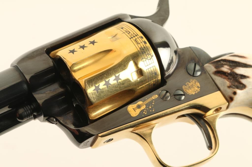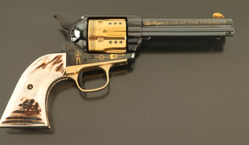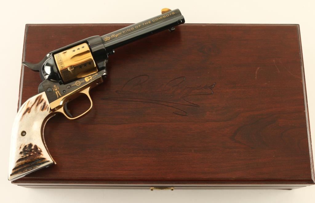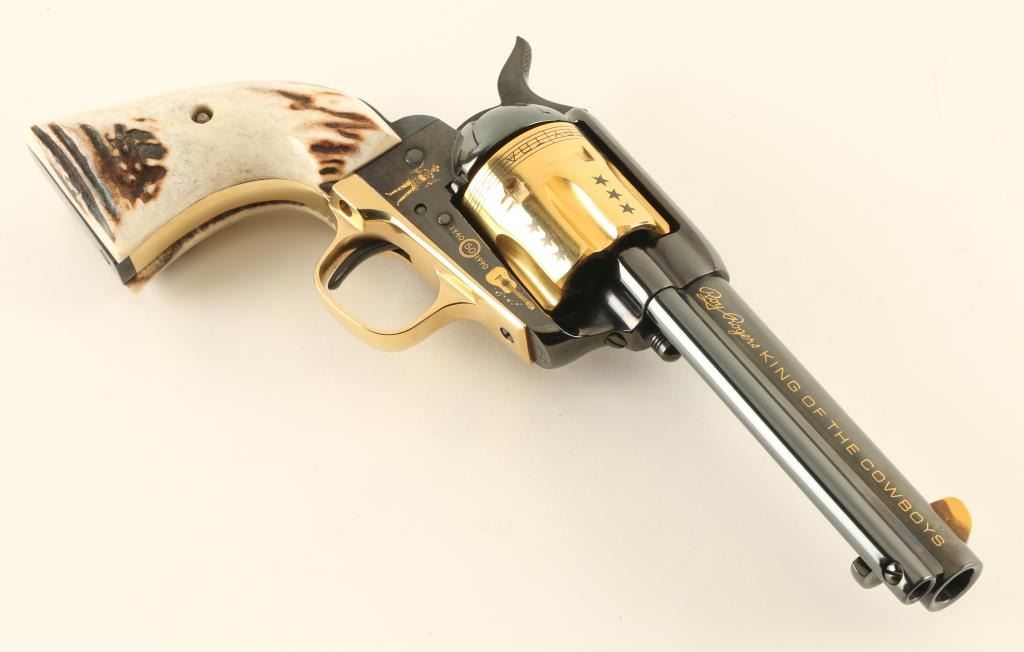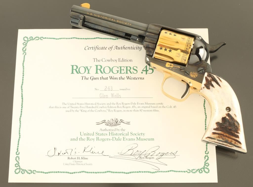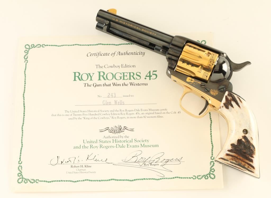 Italian single action revolver manufactured circa 1990, imported by Uberti USA, Lakeville CA. Features blued finish with gold plated accents, stag grips, 4-3/4" barrel, fixed sights. The cylinder is almost entirely gold plated, with contrasting dark colored stars, musical notes and lyrics "HAPPY TRAILS TO YOU" around the rear edge. Right side of the barrel features "ROY ROGERS KING OF THE COWBOYS", right side of frame features gold image of Roy Rogers, a guitar, and "1940 - 1990" , "50" in a circle. Left side of barrel has "US HISTORICAL SOCIETY" in gold text. Left side of frame features another guitar, and two eagles. Overall condition is almost like new, with cylinder drag line, and partial erosion of gold plating from front edge of cylinder. Includes a red cloth storage bag, wood jewelry type inlaid storage case with Roy Rogers signature engraved on lid, blue velvet interior lining, brass plaque. Box is very good condition with several scratches to lid. Paperwork from the US Historical Society and key to the box are also provided. Condition is near NRA Excellent *** Modern Firearm ***