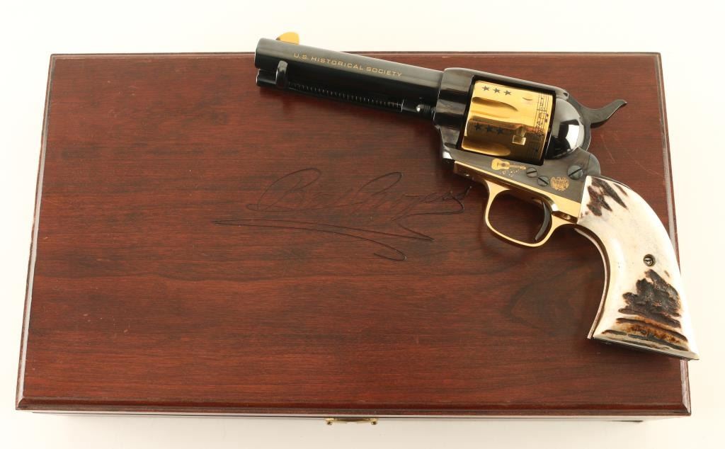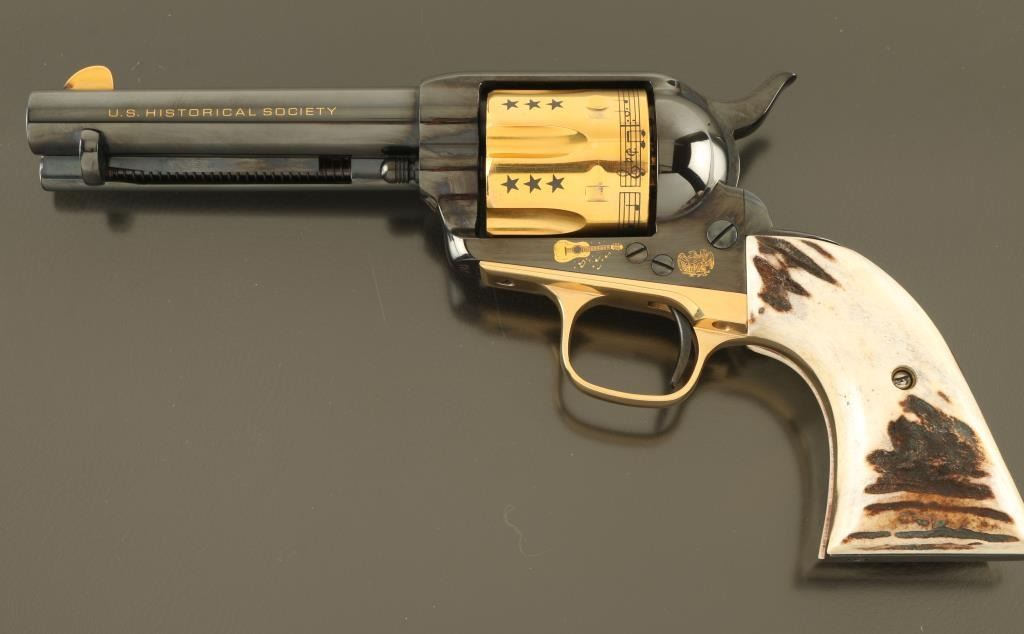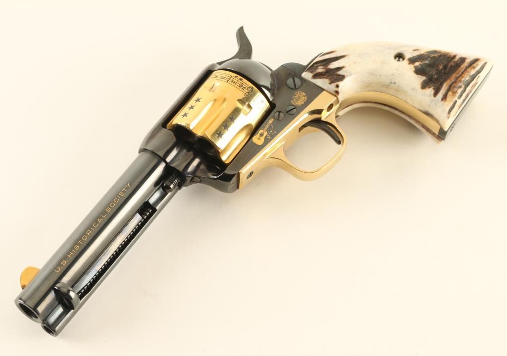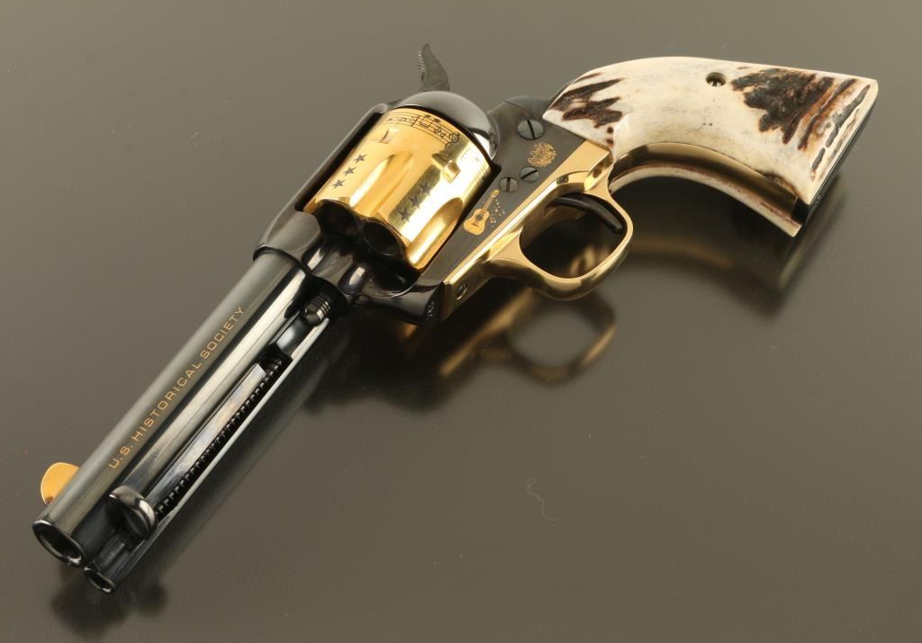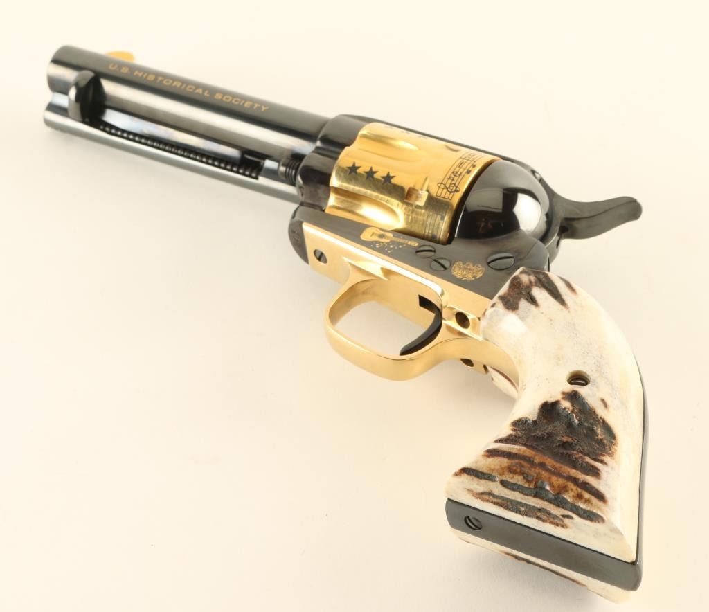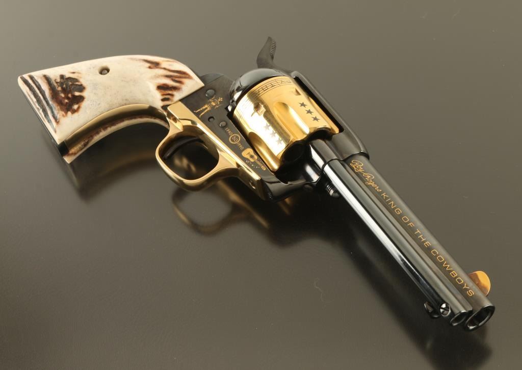 Italian single action revolver manufactured circa 1990, imported by Uberti USA, Lakeville CA. Features blued finish with gold plated accents, stag grips, 4-3/4" barrel, fixed sights. The cylinder is almost entirely gold plated, with contrasting dark colored stars, musical notes and lyrics "HAPPY TRAILS TO YOU" around the rear edge. Right side of the barrel features "ROY ROGERS KING OF THE COWBOYS", right side of frame features gold image of Roy Rogers, a guitar, and "1940 - 1990" , "50" in a circle. Left side of barrel has "US HISTORICAL SOCIETY" in gold text. Left side of frame features another guitar, and two eagles. Overall condition is almost like new, with cylinder drag line, and partial erosion of gold plating from front edge of cylinder. Includes a red cloth storage bag, wood jewelry type inlaid storage case with Roy Rogers signature engraved on lid, blue velvet interior lining, brass plaque. Box is very good condition with several scratches to lid. Paperwork from the US Historical Society and key to the box are also provided. Condition is near NRA Excellent *** Modern Firearm ***