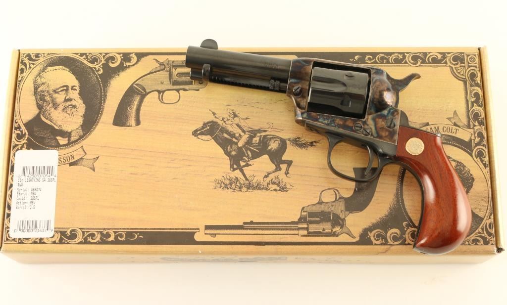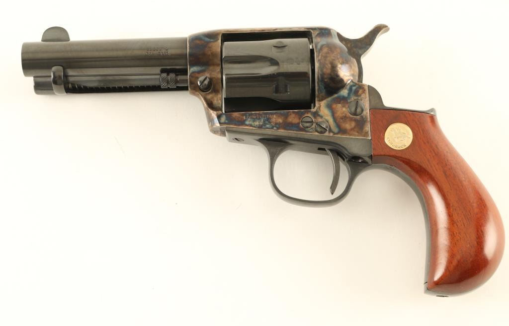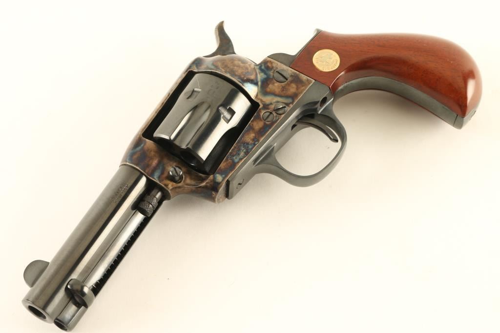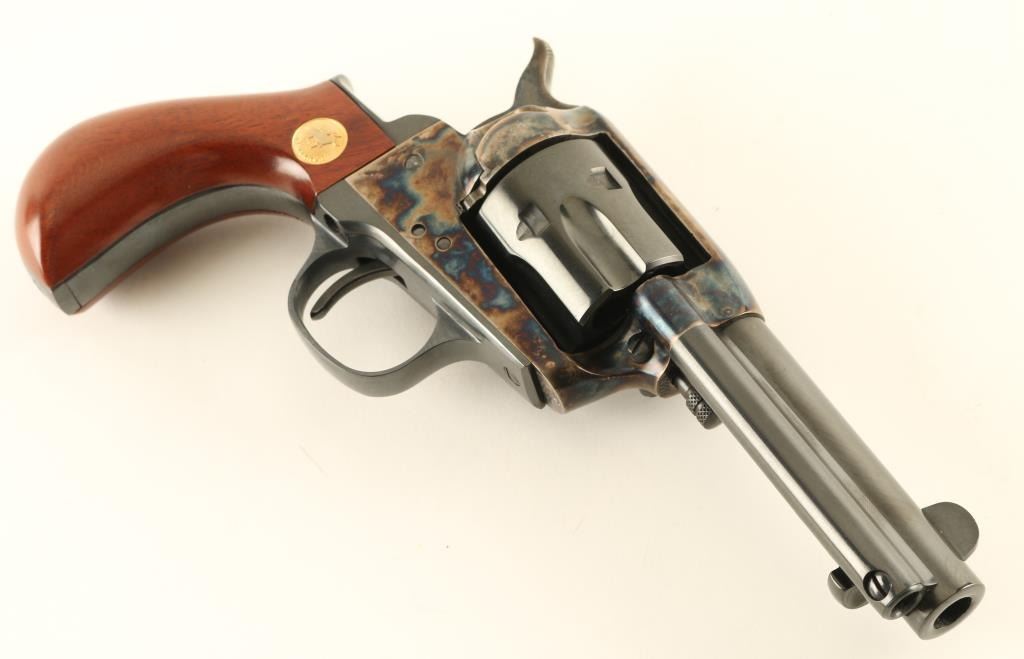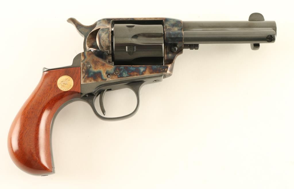 Italian single action revolver imported by Cimarron Firearms, Fredericksburg TX. Features blued finish, case color receiver, smooth wood bird's head grips with Cimarron medallions, 3.5" barrel, fixed sights, ejector rod under barrel. Bore is excellent. Overall condition is like new with few signs of handling. Cylinder does not rotate every time hammer is cocked. Includes factory box. Condition is NRA Excellent - Needs Repair *** Modern Firearm ***