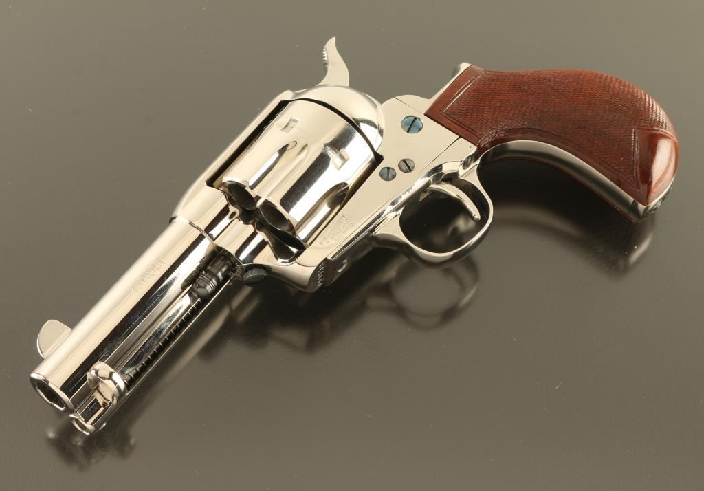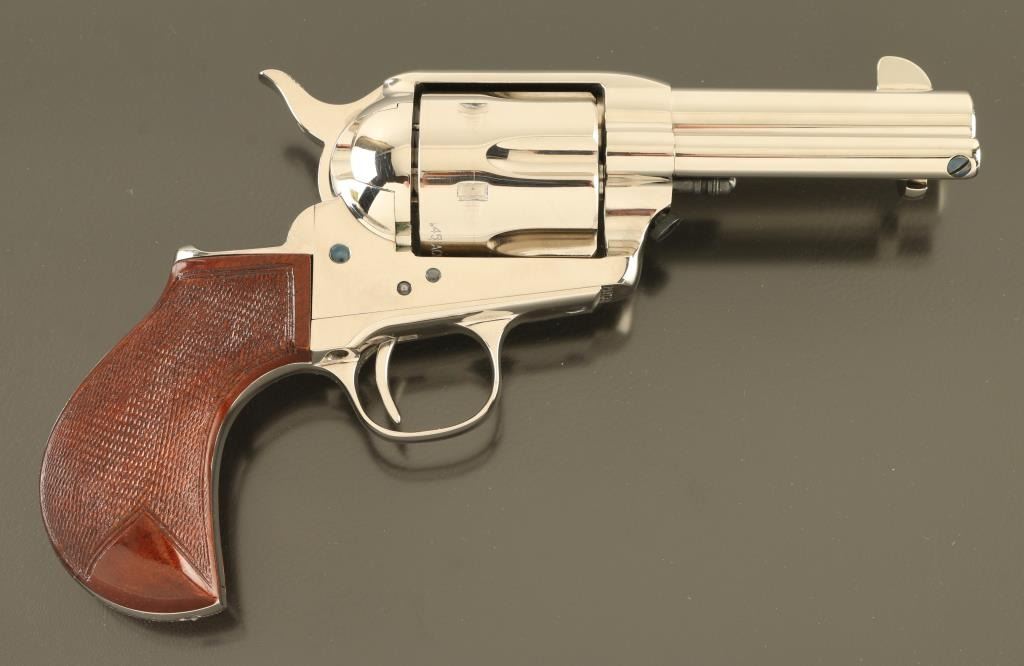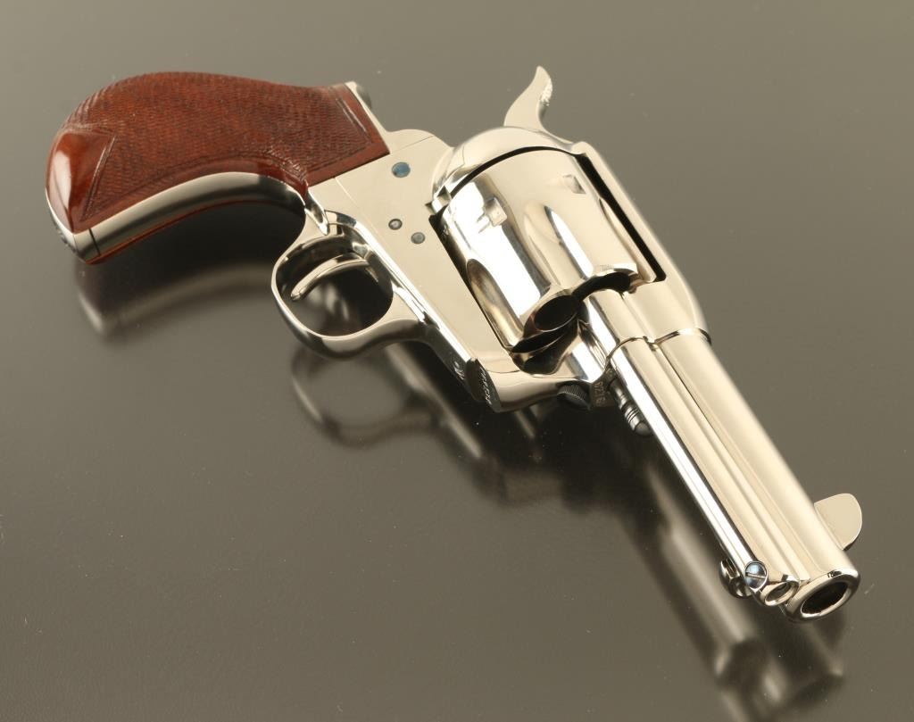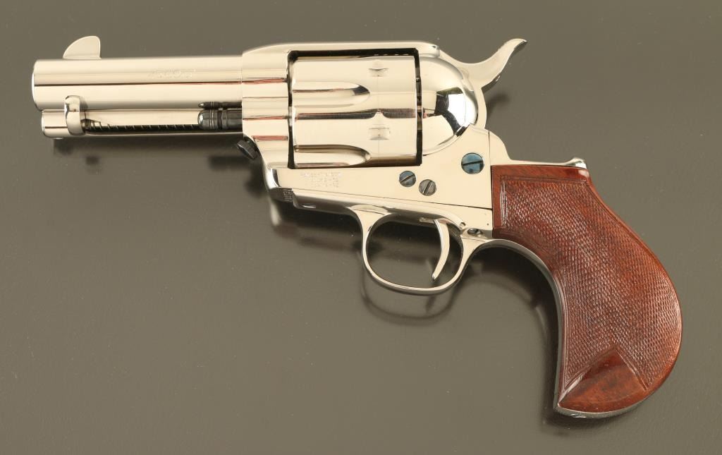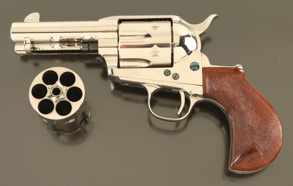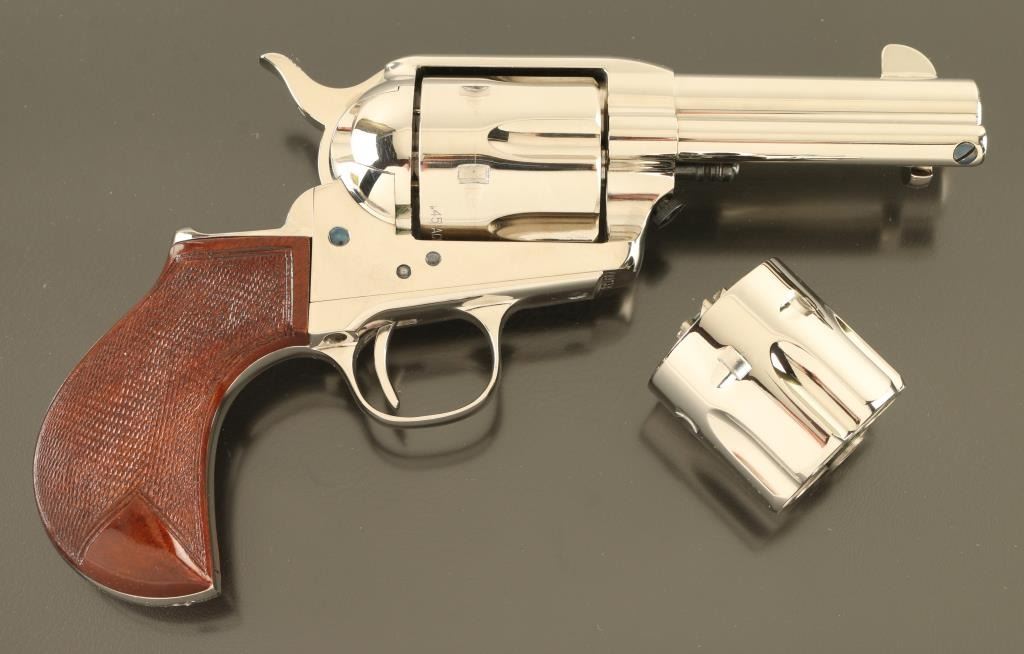 Italian single action revolver imported by Cimarron Firearms, Fredericksburg TX. Features bright nickel finish, checkered wood bird's head grips, 3.5" barrel, fixed sights, ejector rod under barrel, narrow checkered spur. Bore is excellent. Overall condition is like new with few signs of handling. Installed cylinder is 45 ACP, with mismatched number. Additional 45 Colt cylinder, numbered to gun, is included. Also included is a spare hammer with wide checkered spur. Condition is NRA Excellent - Like New *** Modern Firearm ***
