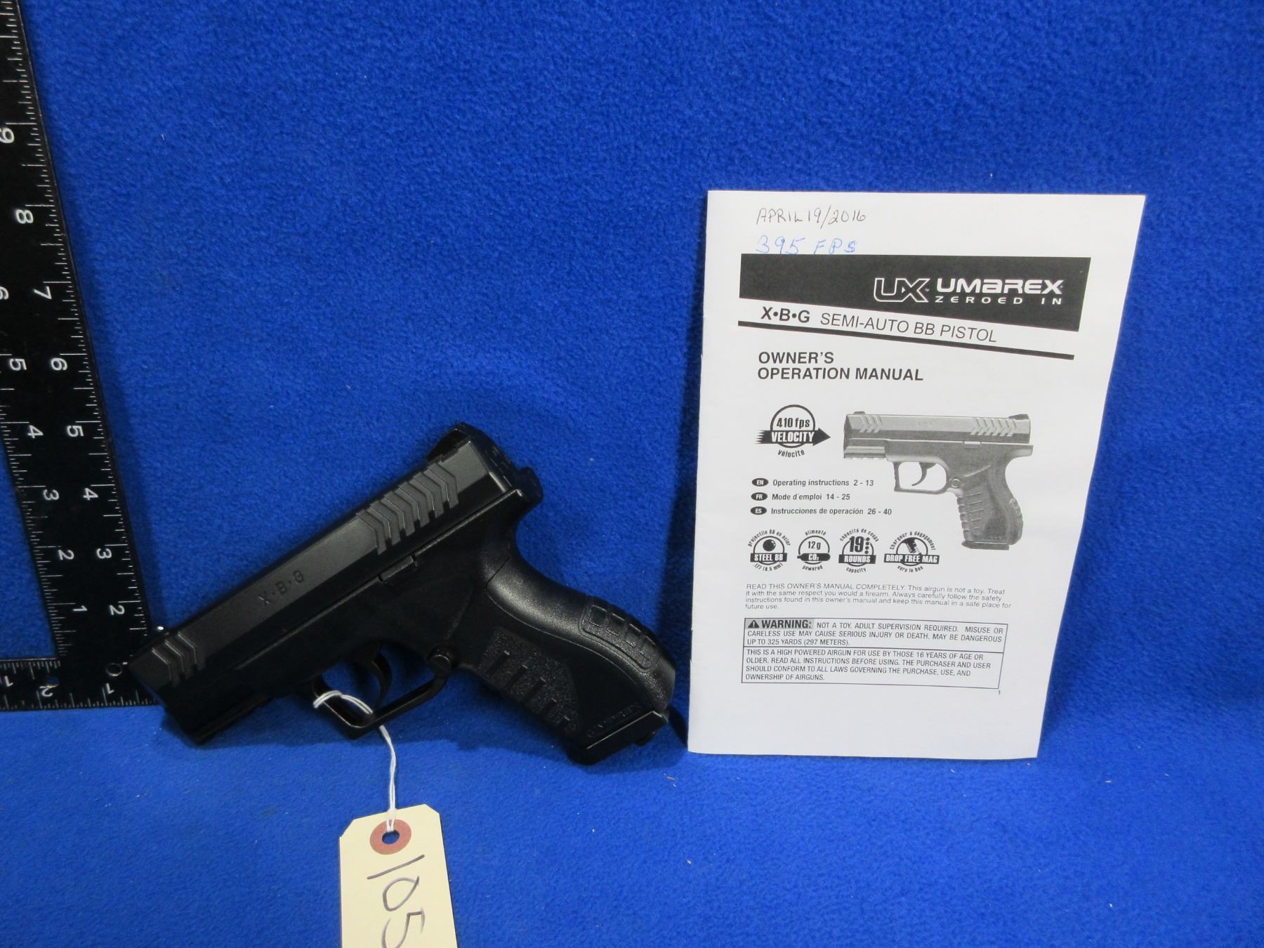 Umarex X-B-G Semi-Auto .177 Caliber BB Pistol - 410 fps using steel BB's, 19 round drop free magazine, smooth bore barrel is 4.25 inches. Ser. # 13E70129 - comes with owners manual