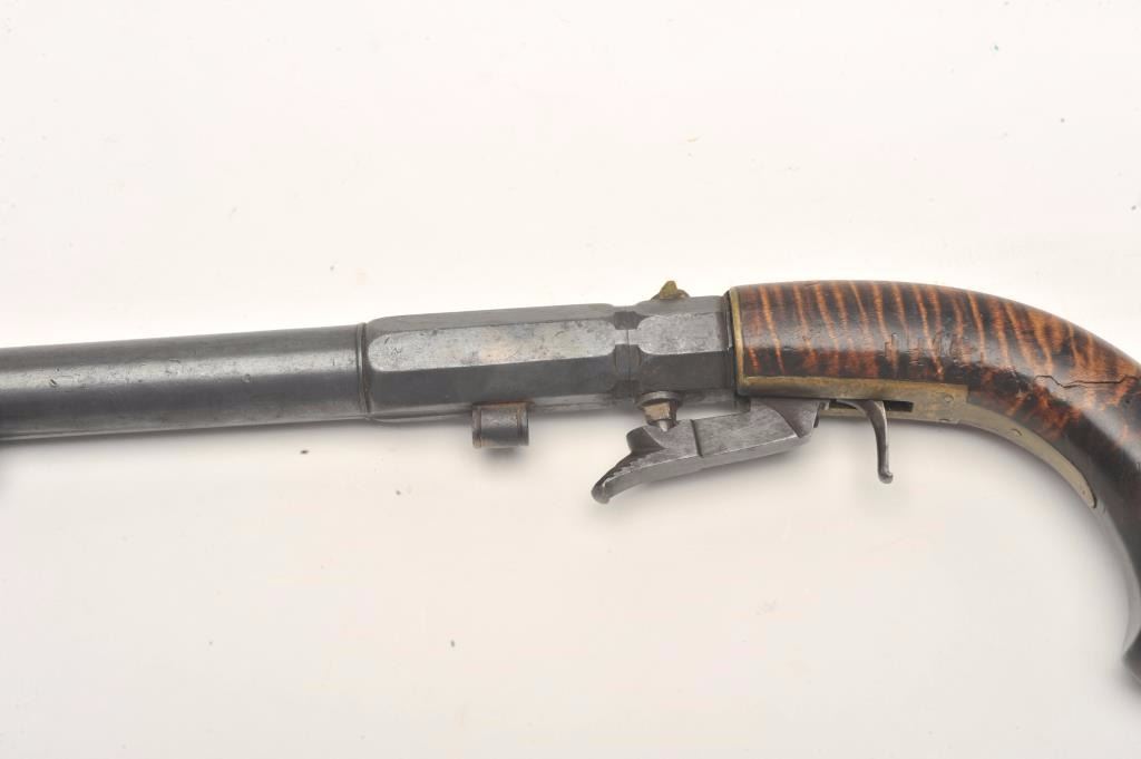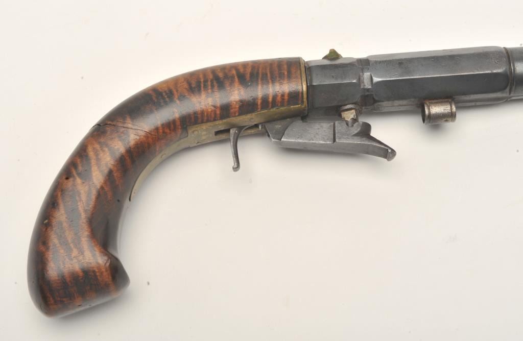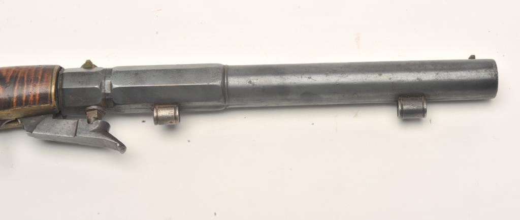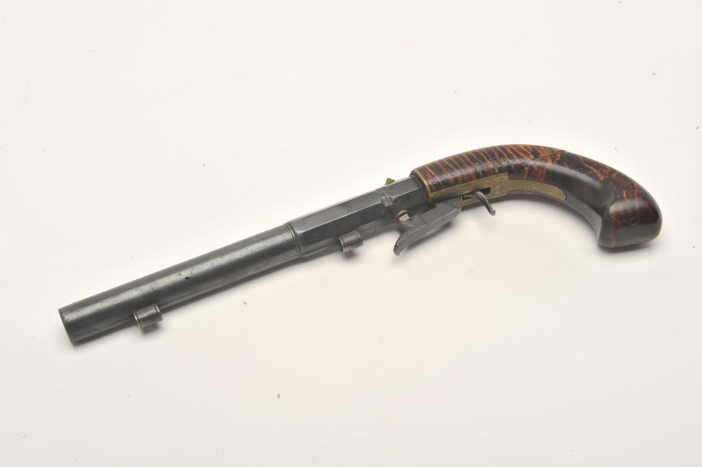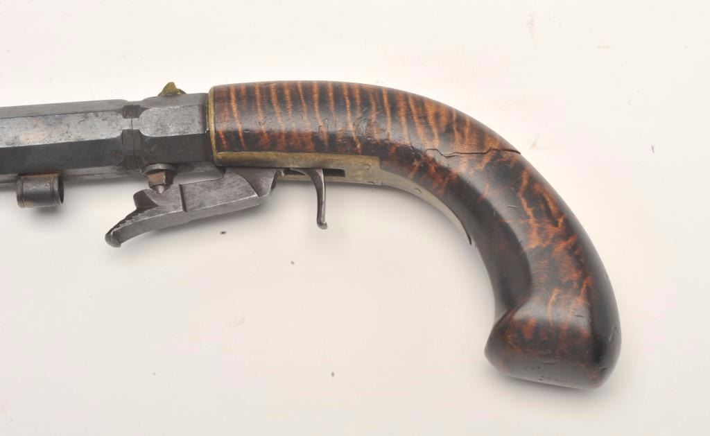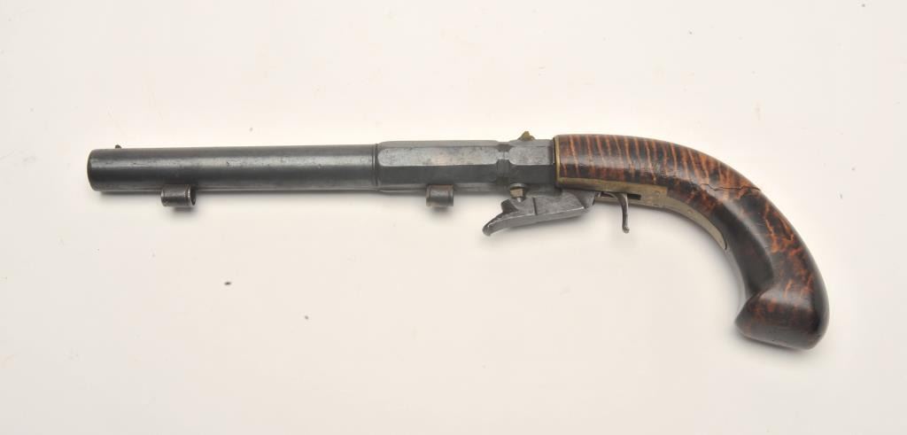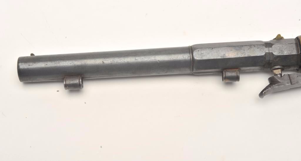 Underhammer American percussion pistol, .32 caliber, 7” barrel, blued finish, wood grips, missing ramrod; in overall good condition with good action, majority of blue finish remaining, grips show old break at wrist. (Antique). Est.: $350-$700.