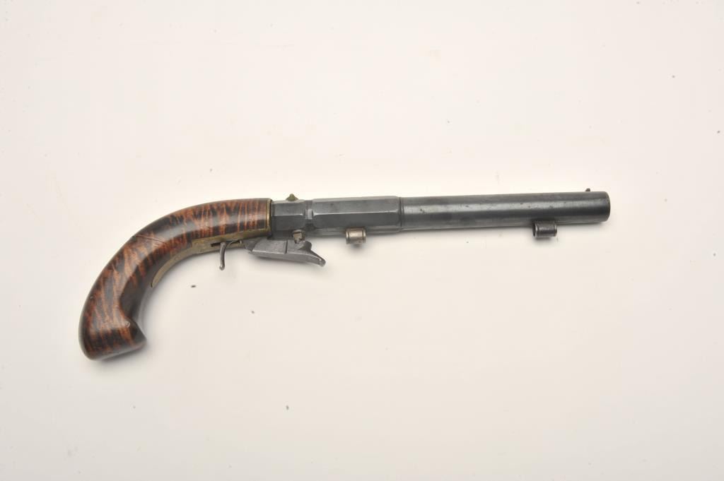 Underhammer American percussion pistol, .32 caliber, 7” barrel, blued finish, wood grips, missing