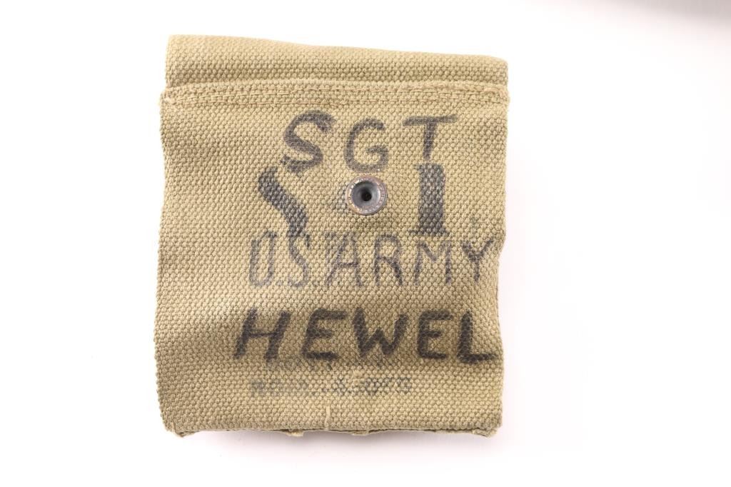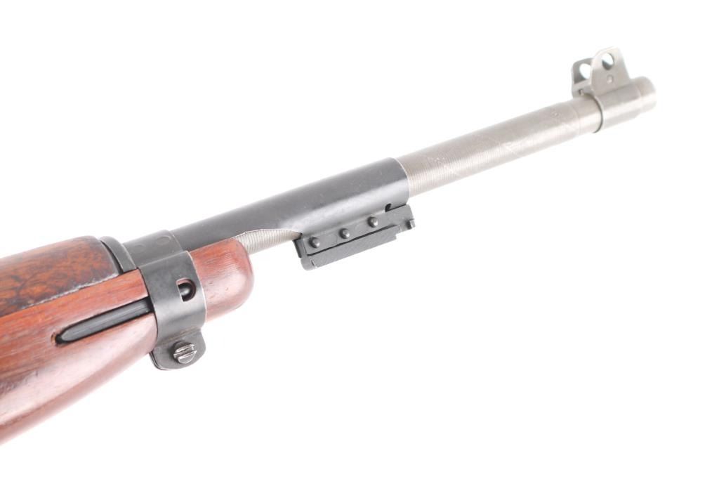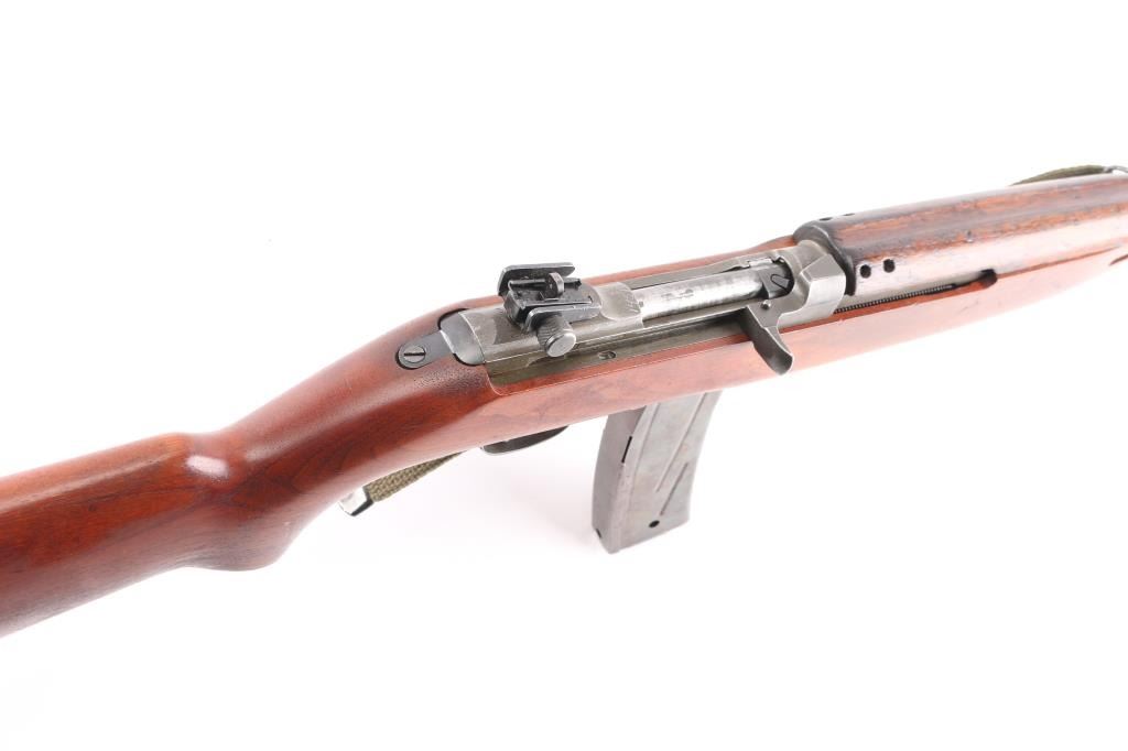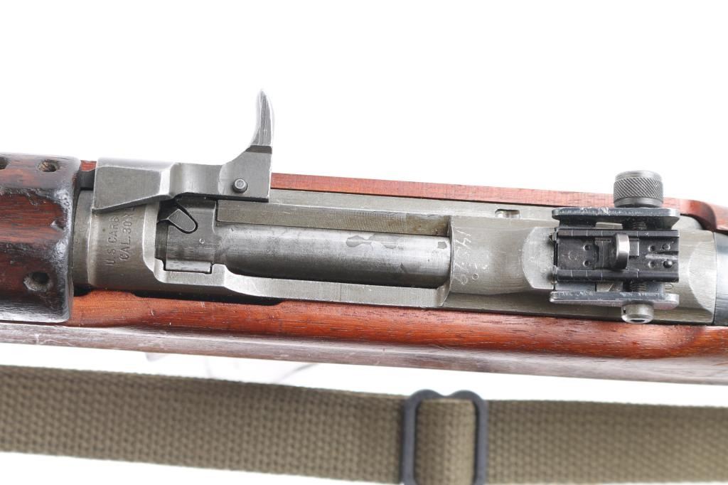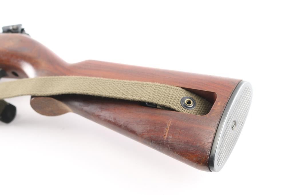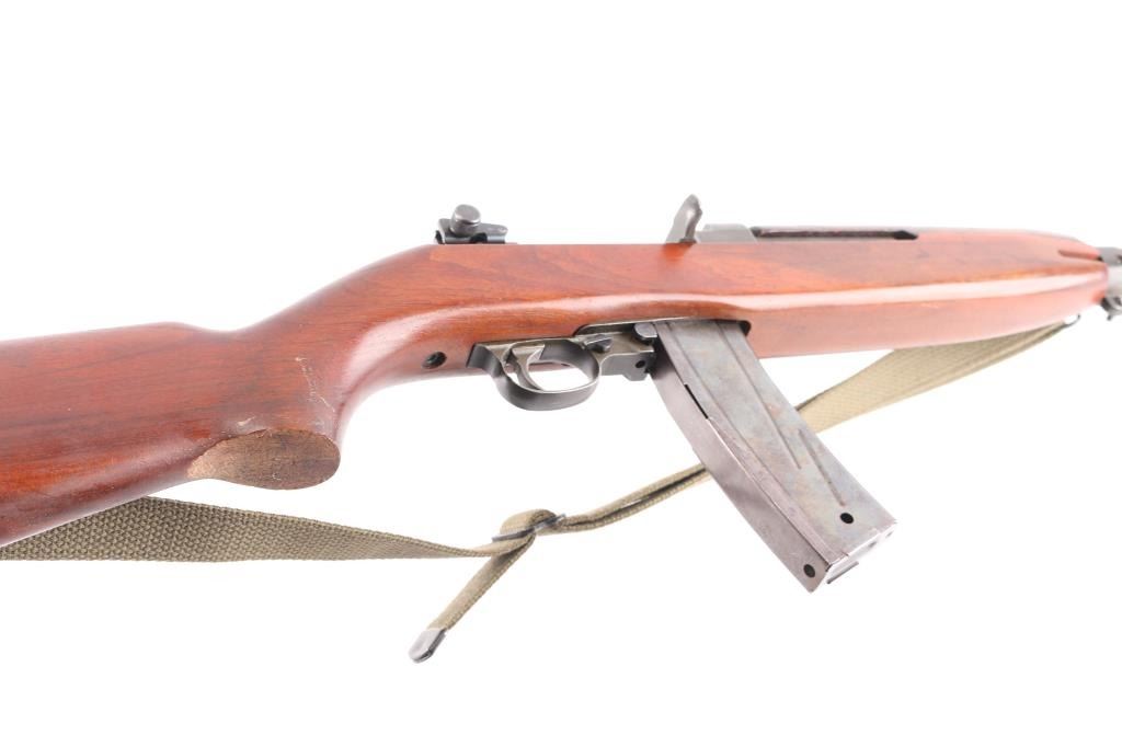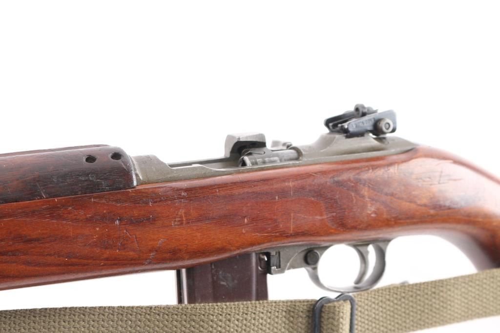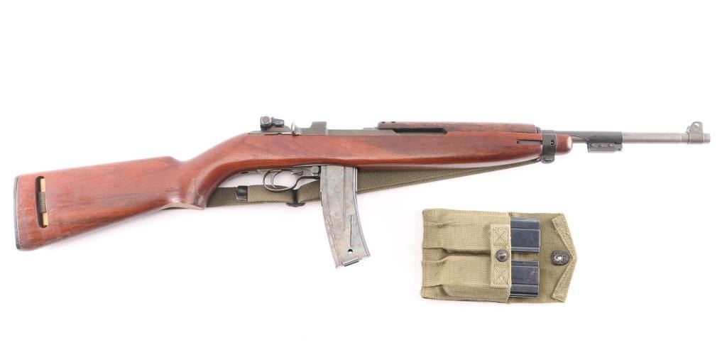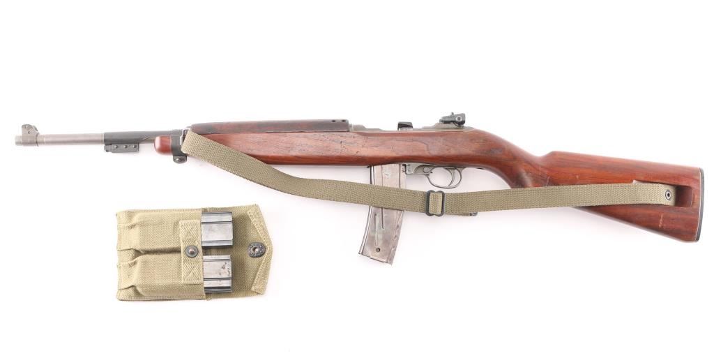 US military semiautomatic rifle manufactured during WWII. Features parkerized refinish, 18" barrel, protected "RIA" marked blade front sight, adjustable rear peep sight with range slide marked "507160060", front sling swivel, rear sling slot, walnut type II smooth low wood stock with oval cut and oiler, 4 rivet handguard with deep sighting groove, rotating manual safety. Blued type III barrel band/bayonet lug marked M.M.O. (Quality Hardware) Type IV magazine release marked "M WA". "WA" stands for the manufacturer Wadsworth Watch Company. This part was implemented as early as early as 1944. Stock has no cartouches, appears to have been lightly sanded at some point. Barrel is marked "Underwood" with flaming bomb" with a date that appears to be 3-4, with "P" underneath. Rear of receiver stamped with flaming bomb. Type III round bolt adopted in March, 1944. Bore is excellent/bright. Retains 90% medium gray color parkerizing, with edge losses & handling marks, friction wear on the bolt. Wood is very good condition. the bottom of the grip cap has been sanded down with a feint stamping of what appears to be "HPD" The Honolulu police dept was know to have used M1 Carbines in the past, also there is the number "14519" electropenciled on top of the receiver. Includes (1) good condition blued steel 30 rd magazine marked "IR", and correct USGI green canvass sling. No oiler, sling is held by wooden dowel. Also includes USGI ammo pouch containing two type I 15 rd magazines, one marked "U" (Union Hardware, and one marked "K.I.(Keeler Brass for Inland).NRA Condition-Very Good. C&R firearm.