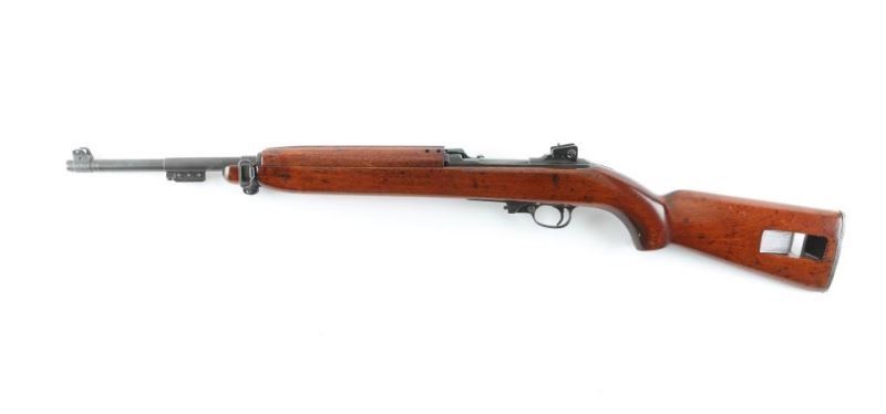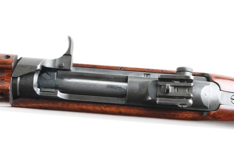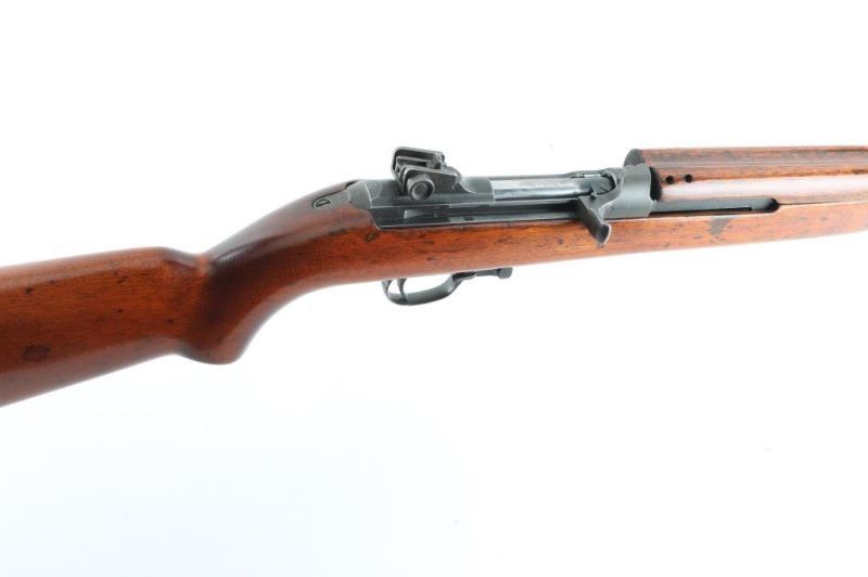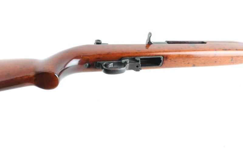U.S. military semiautomatic rifle. Features parkerized finish, walnut stock & 4 rivet handguard, protected blade front sight, peep rear sight with sliding elevator marked "PI" for Inland. 18" barrel, push button manual safety, round front sling swivel, front band with bayonet lug, marked "MMQ" (After Quality Hardware got the late war contract for Type III bands, they subcontracted to Muller manufacturing Co., thus the MMQ stamp). Sling slot in butt, accepts detachable magazine. Round bolt, magazine catch marked with underlined "M" (modified) making it a type IV. Barrel marked Underwood with what appears to be 4-44 (very feint) flaming bomb, and large "A". Bore is very good condition, needs cleaning. Retains 80% finish, appears a bit thin overall, with edge wear, and friction loss on the bolt. Wood is good condition overall , but has been sanded and refinished. No marks except a feint crossed cannon cartouche on the right buttstock. No importer marks observed. No magazine. Condition is NRA Very Good (Refinished stock) C& R Firearm.