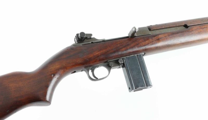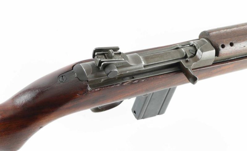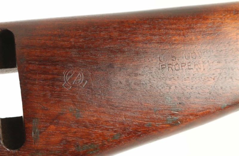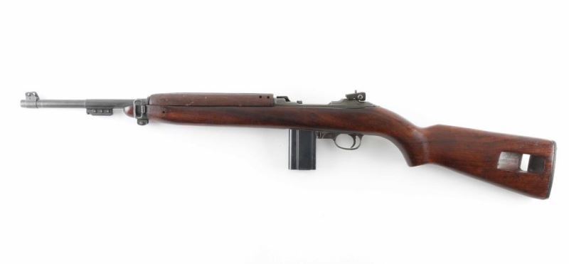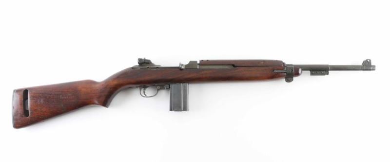 US military semiautomatic rifle manufactured circa late 1943. Features parkerized finish, walnut stock & handguard, protected blade front sight, peep rear sight with sliding elevator, 18" barrel, push button manual safety, front sling swivel, wide front band with bayonet lug, sling slot in butt, accepts detachable magazine. Flat top bolt, four rivet handguard. Bore is very good condition. Retains 85% finish, appears a bit thin and brownish overall, colors and textures consistent with US wartime finish, shows losses on edges and where moving parts rub. Wood is good condition overall with dents & dings, small gouges on handguard, visible crack to right rear of receiver, varnish added. Markings include "INLAND 11-43" on barrel, crossed cannons and "US GOVT PROPERTY" on right of butt, small "P" on front of grip. No importer marks observed. Includes one good condition blued steel magazine marked "AI", fair condition (light rust) "KT" (and flaming bomb) marked M4 bayonet with scabbard. Condition is NRA Very Good (arsenal rebuild) *** C&R Firearm ***
