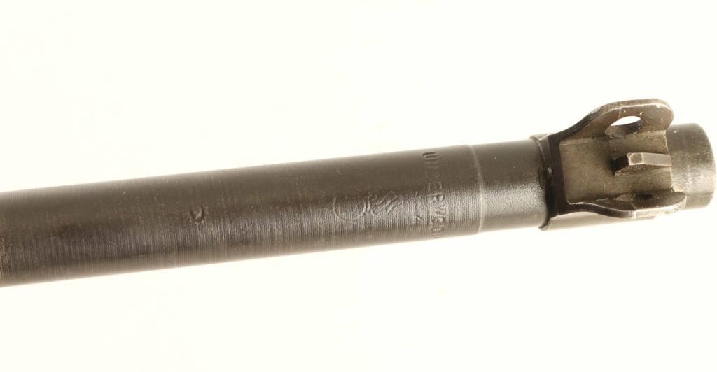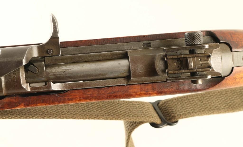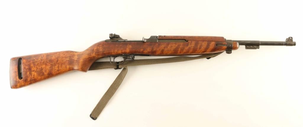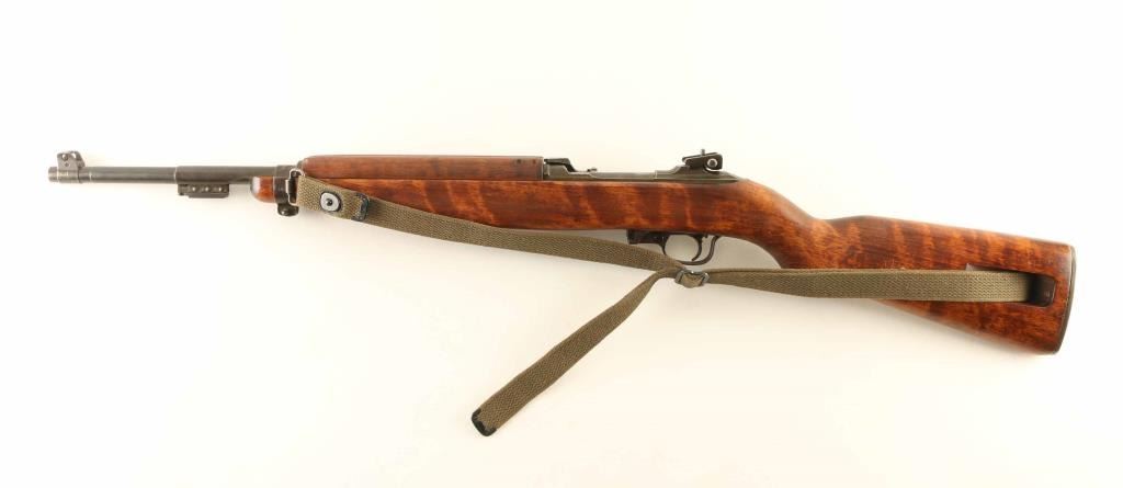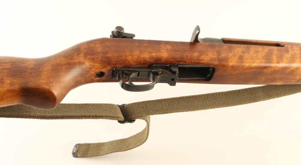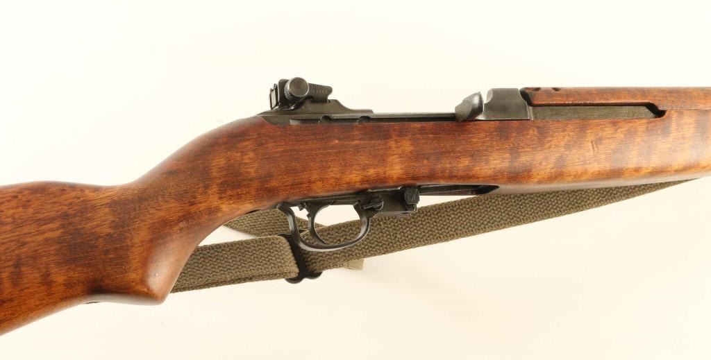 Rifle. Semi-Automatic. WW2 U.S. military issued Carbine. Produced 1942-1945. 18" round barrel, with rear adjustable aperture, and wing-protected front post sights. Fed from detachable box magazine. Gas-operated, Short-stroke piston. Rotating bolt. Underwood barrel, flaming bomb, 44 dated (Feint, can't read Month). RIA front sight. J.M.O. barrel band. bore appears excellent/bright. Action is smooth/tight. blued finis is about 40%, with the receiver turning mostly a dull gray patina. Wood is very good, with "P" proof behind the triggerguard, and "TE" stamped on the left stock. NRA Condition-Good. C&R Firearm.