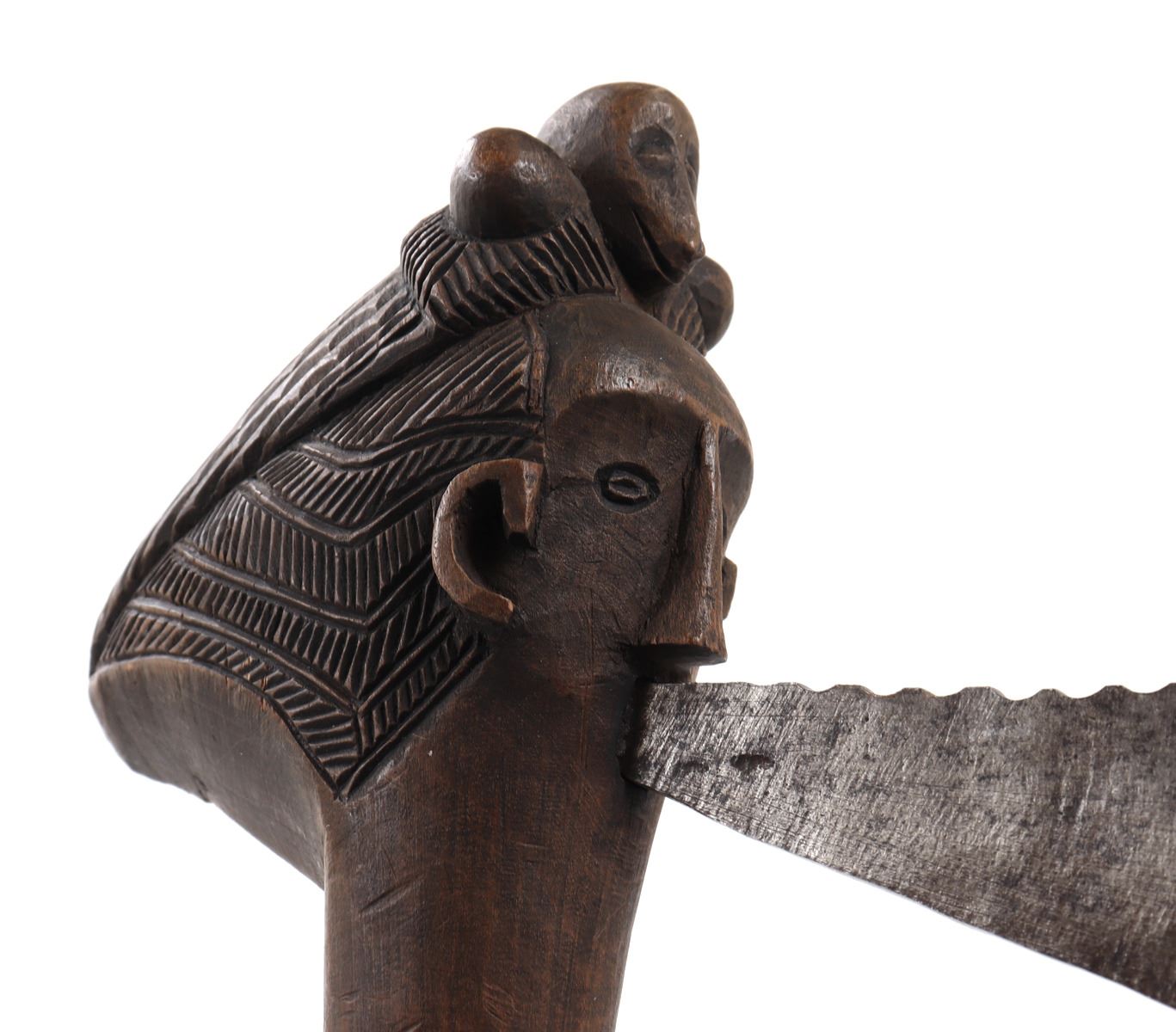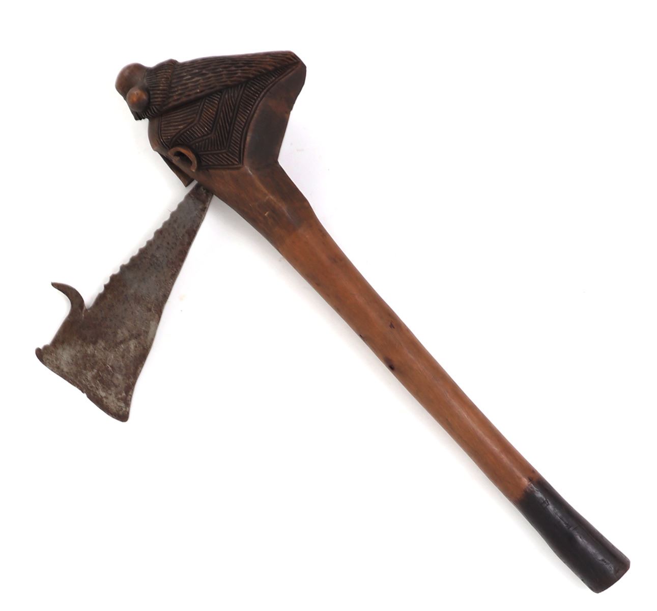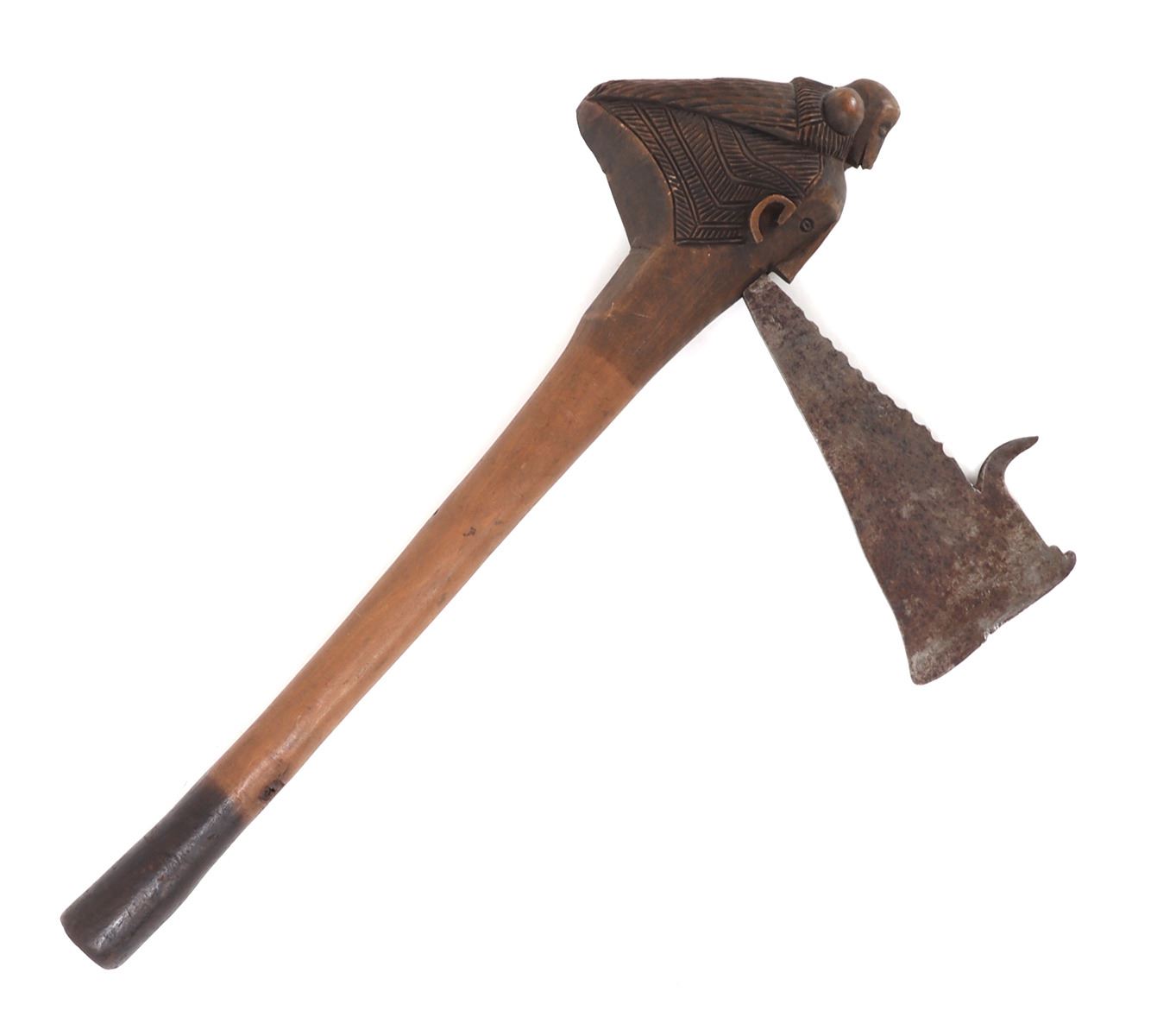 Very unique African wood and steel tribal axe. Smooth wood shaft with a male figures head as the axe holder, with a zoomorphic animal headdress. Steal axe head with serrations to the top ending in a menacing outward turned spike. Size blade 6" L, size overall 17" L. Condition: Good overall condition with natural patina throughout, one minor loss to the top of the wood axe head.