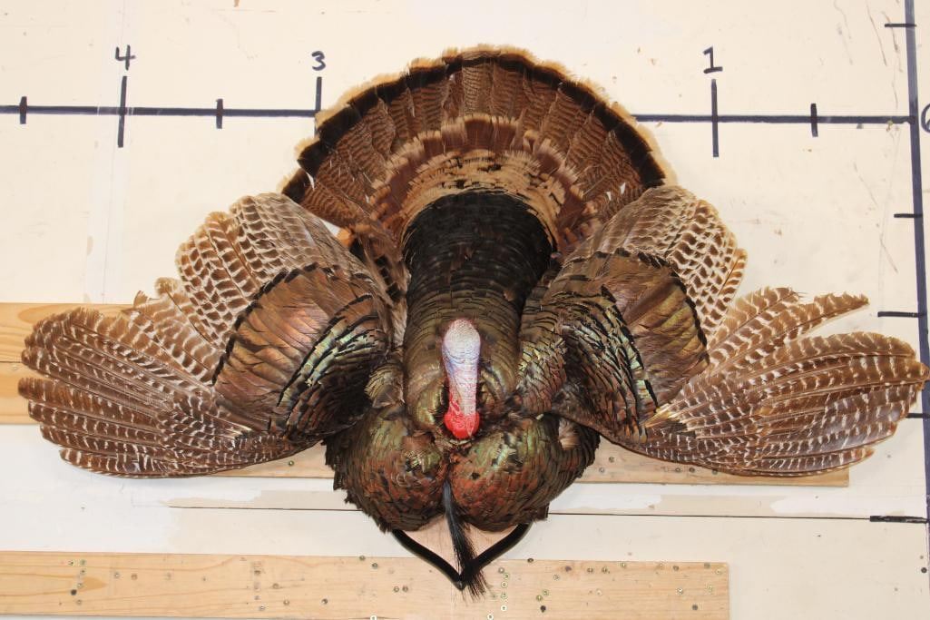 Very Unique Half Body or 1/3 Body TURKEY with its wings spread on a Wooden Plaque. The wing span is approximately 4.5' Wide and it is in Very Good Condition. TAXIDERMY