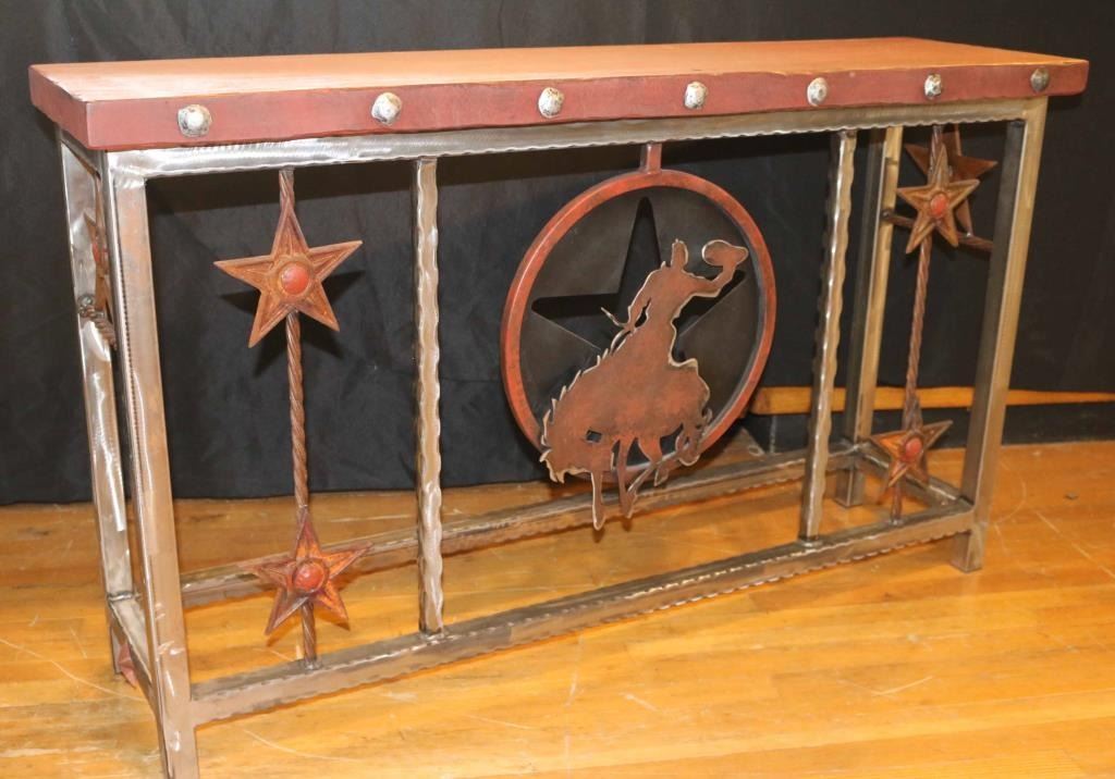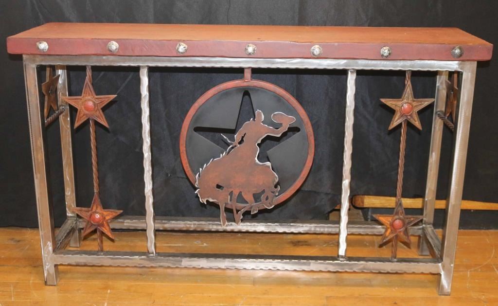 Western Motif with stars and bronc rider. Local artisan made by Jim Frank. Measures 32" x 54" x 15".