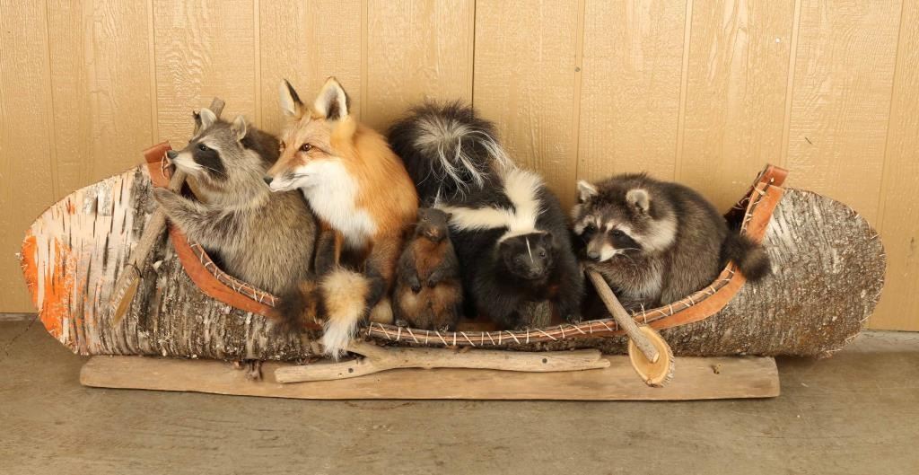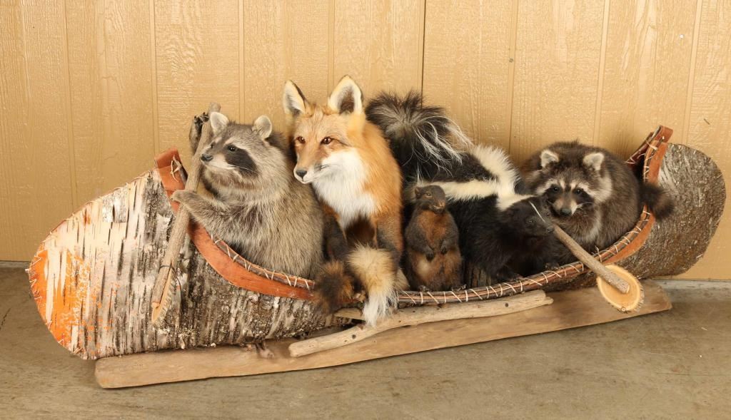 Adorable canoe with raccoon, fox, mole, skunk, and second raccoon mounted on wooden log. Measures 61" long x 23" tall.