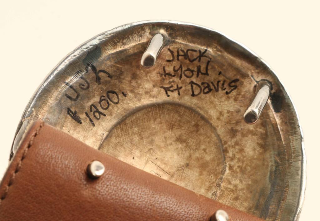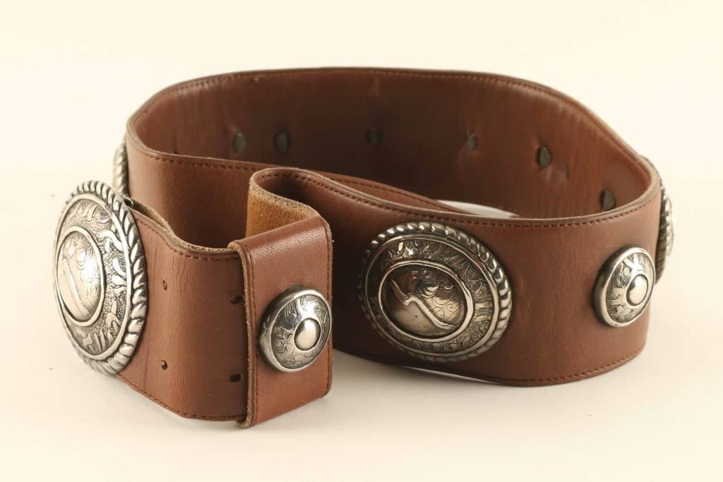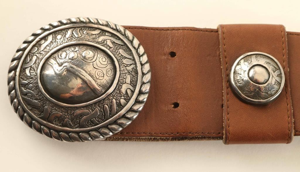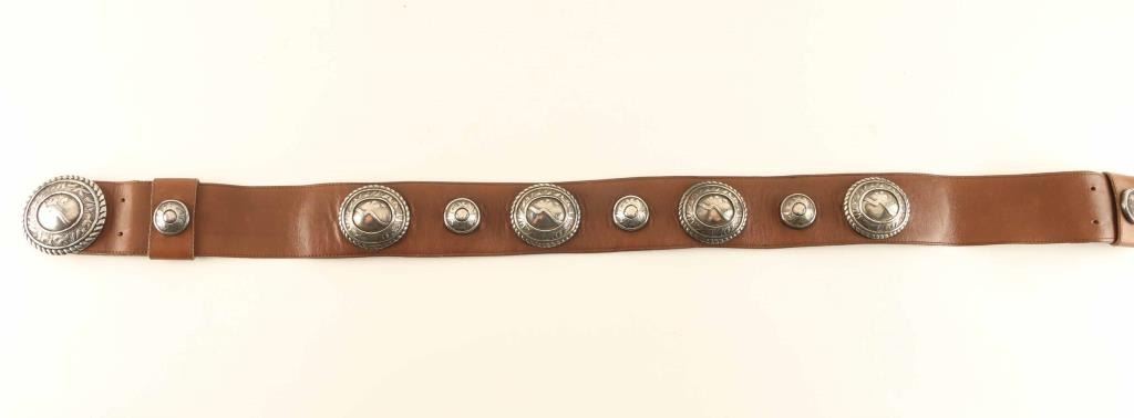 by silversmith Jack Lyon depicting the story of the Rio Grande, 10 conchos, 33"long on a thick brown belt.