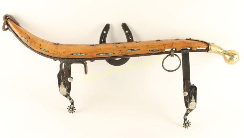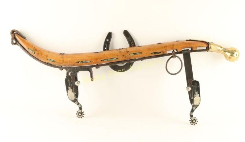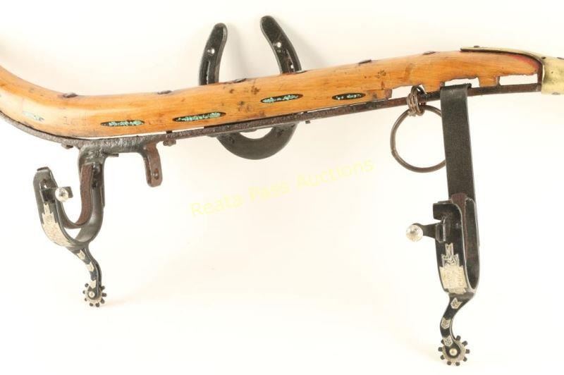 Wood construction with turquoise stone inlays, brass horse collar ball, and spur holders for a long gun. Horseshoe on back has holes on tips for hanging. Measures 32" long. Hand crafted by local artist.