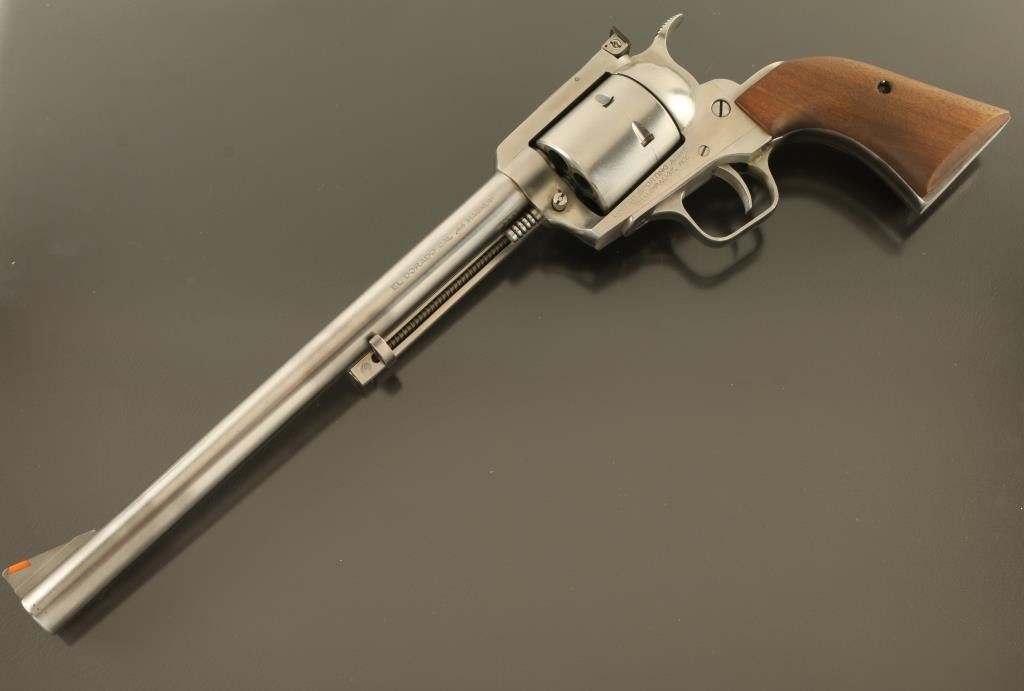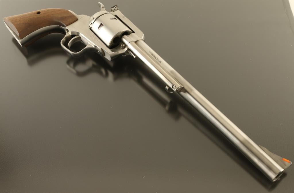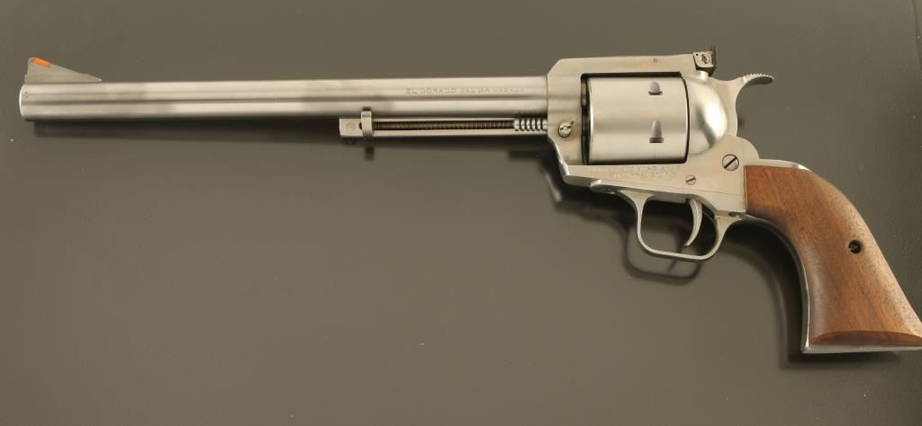 SN: 44S-1580 Single action revolver features stainless steel construction, smooth wood grips, 10.5" barrel, adjustable sights (orange insert in front sight ramp), grooved oval hammer spur. Bore is excellent. Condition of metal surfaces is like new with few signs of handling. Grips are very good or better condition, fit to frame is good at top but show some of the frame in the butt area. First commercially produced stainless steel single action 44 mag revolver available to the public in the USA. Condition is NRA Excellent *** Modern Firearm ***