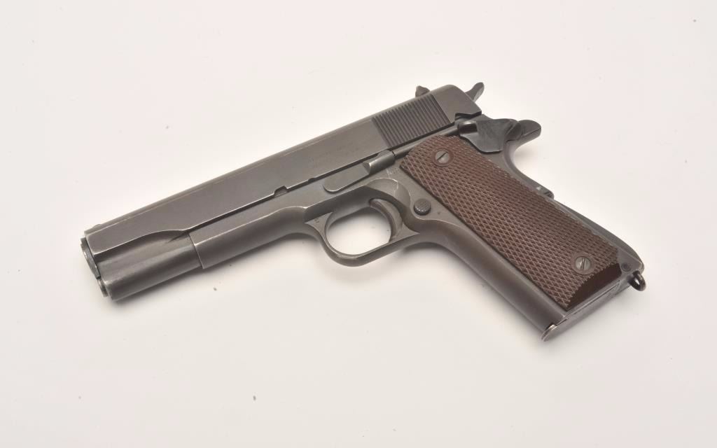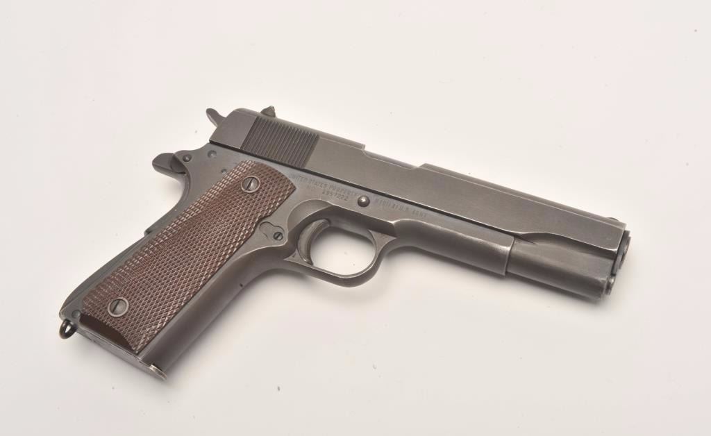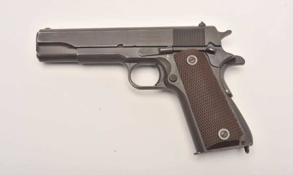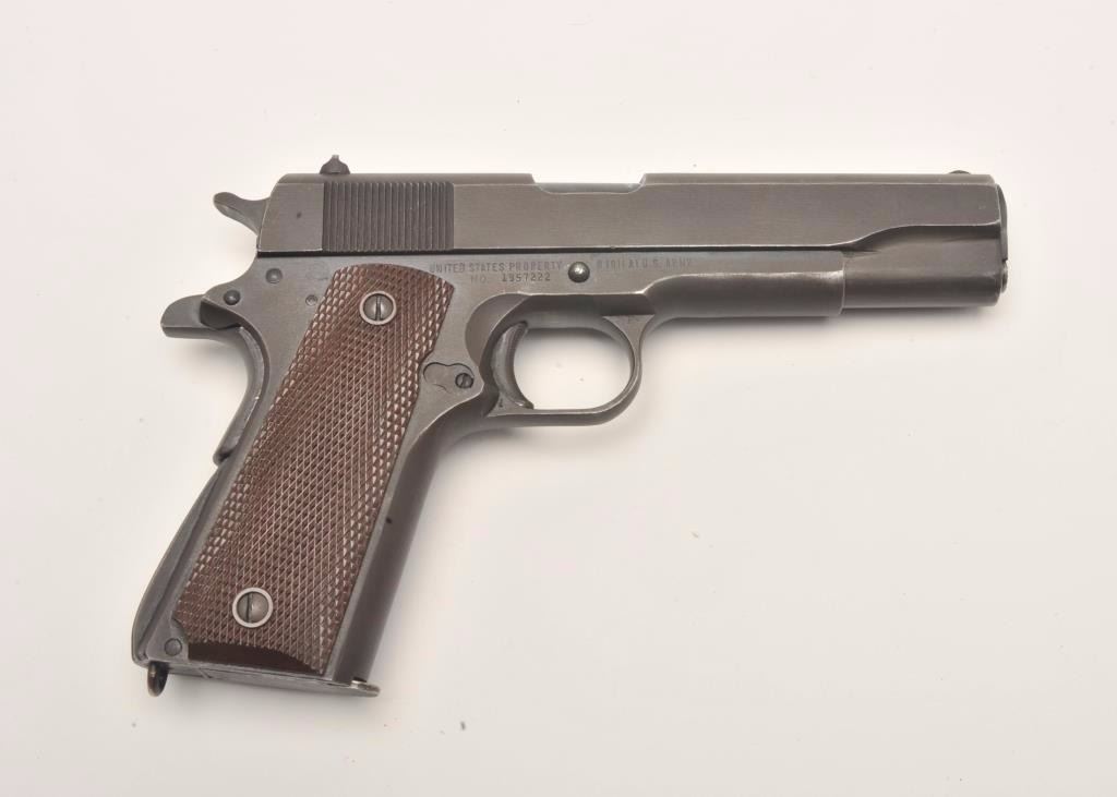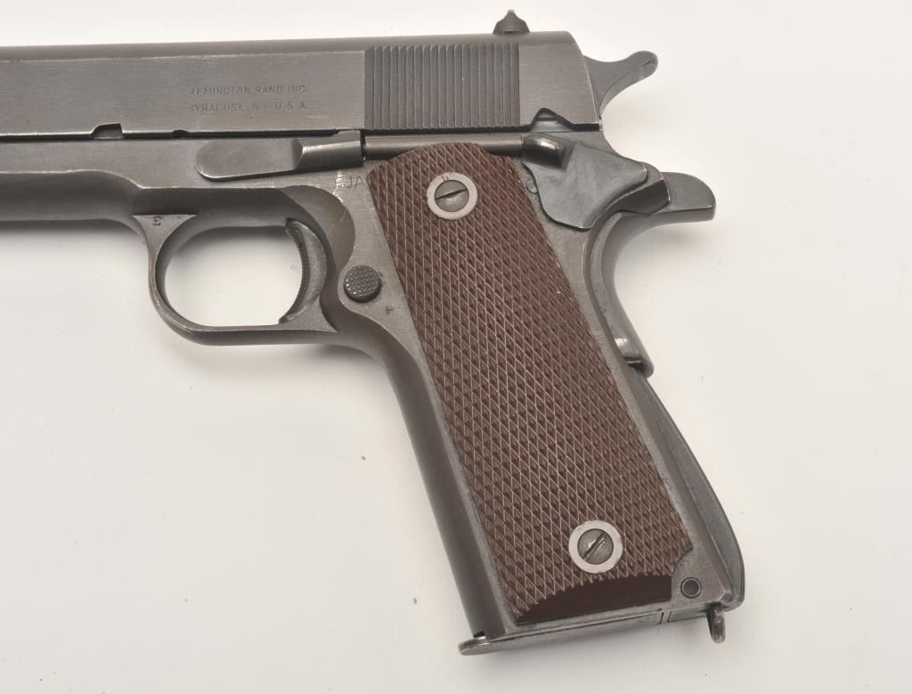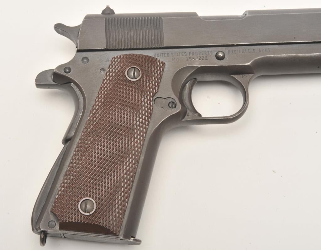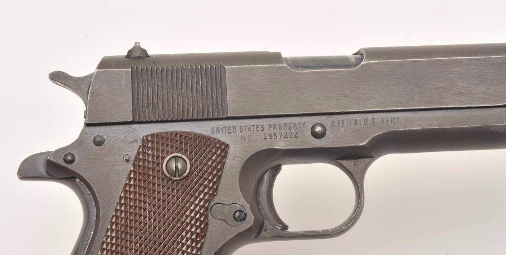 United States Property marked Model 1911A-1 semi-automatic pistol by Remington, .45 caliber, 5” barrel, parkerized finish, checkered maroon grips, S/N 1957222. This pistol is in overall fine conditiondisplaying the majority of its military finish, some high point wear, fine bore, crisp action sharp markings and fine grips. (C&R/PPT). Est.: $1,500-$3,000.