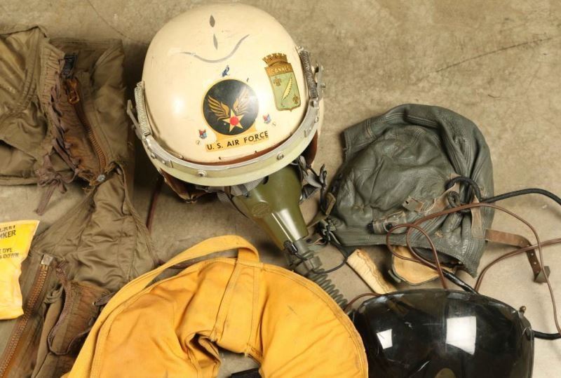 1950s Korea, including; US Air Force and Cannes decal helmet with mask,flight suit, lace up leather boots, anti-G suit, US Air Force leather mittens, leather helmet with headset, and life vest.