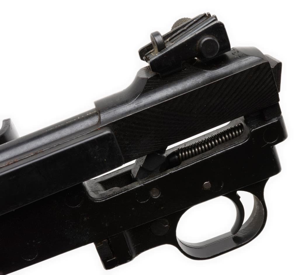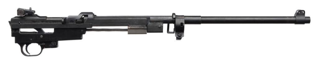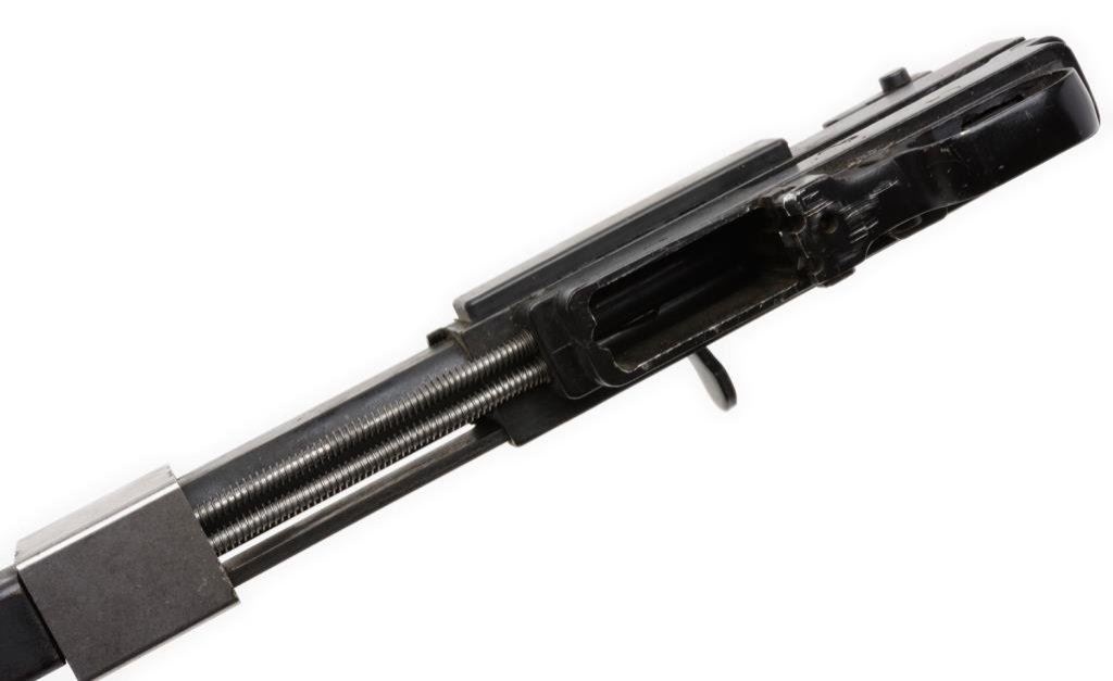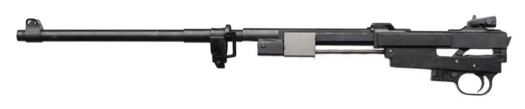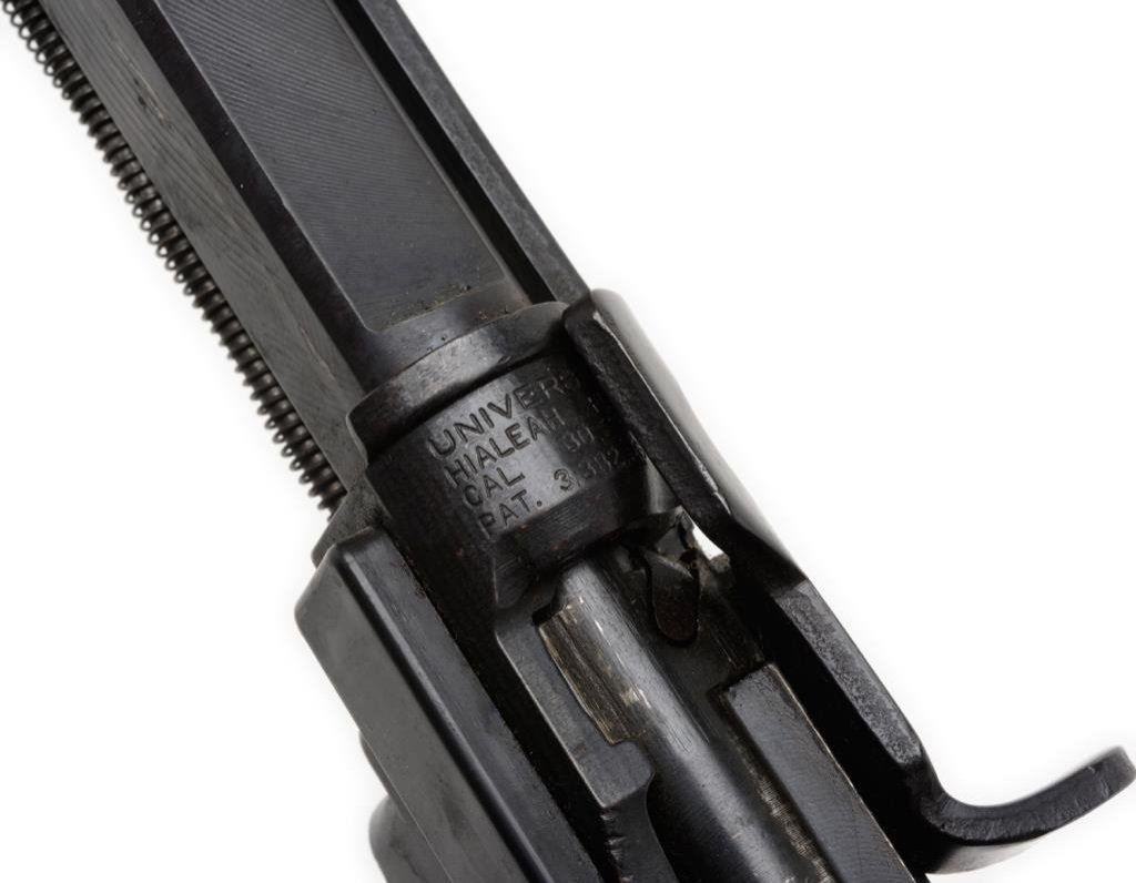 ++Universal (Hialeah, FLA.) Commercial M1 carbine, .30 caliber, 18” barrel, S/N 434278, blued finish, NO STOCK. This modern copy of the famous WW II M1 carbine is in overall very good condition displaying the majority of its original finish, bore should clean to very good, crisp action, no magazine, front barrel band and sling swivel retained. Est.: $250-$500.