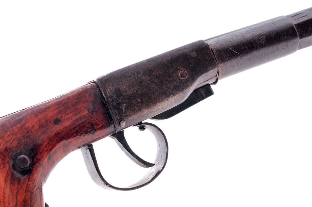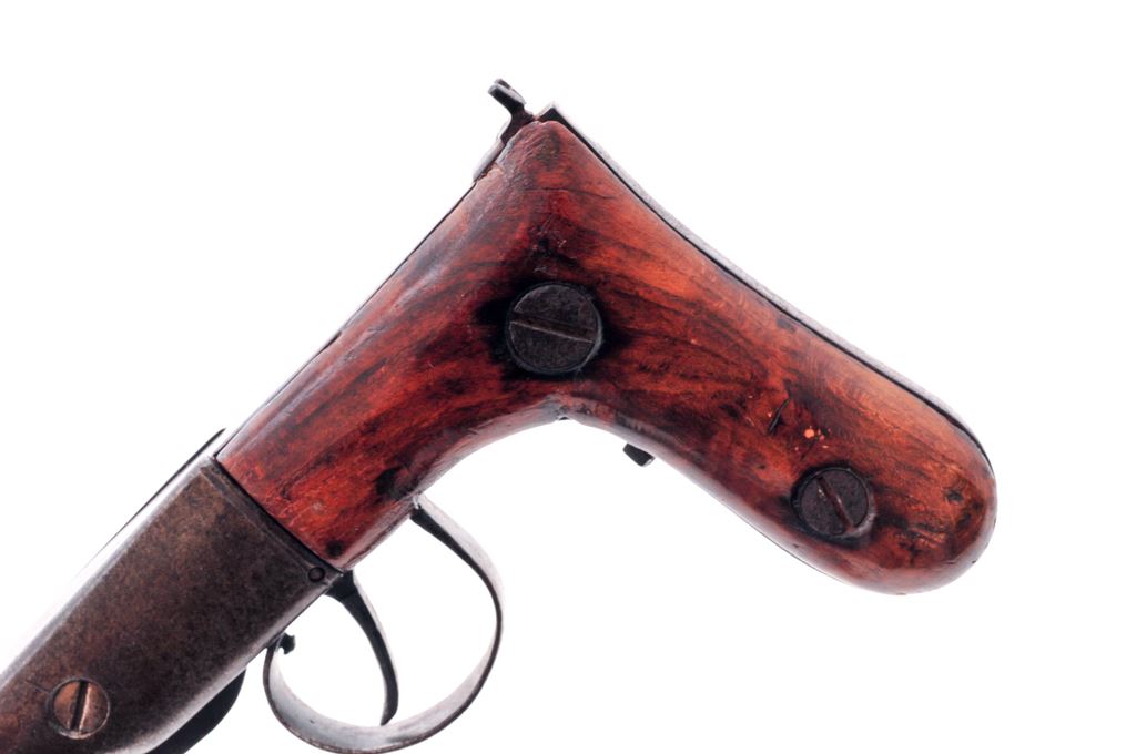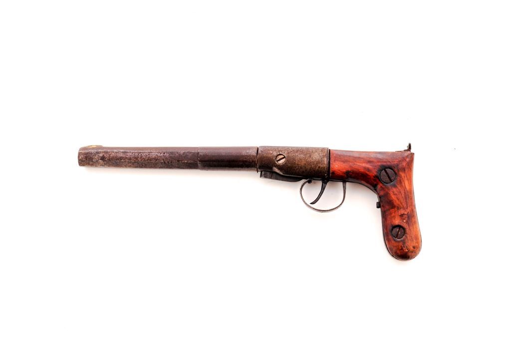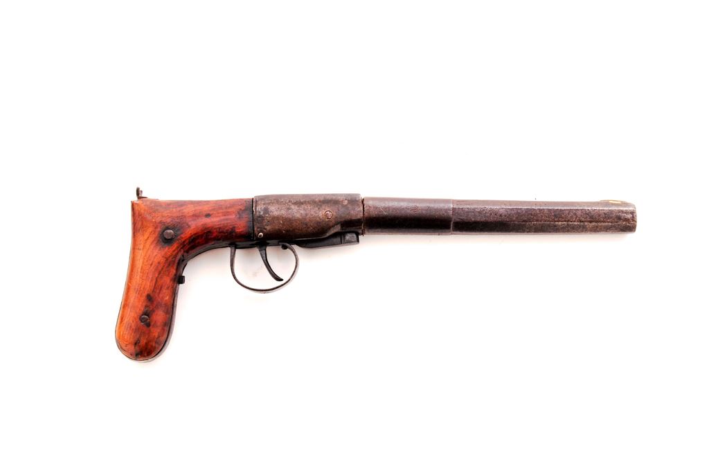 Unmarked American Underhammer Single Shot Percussion ''Bootleg'' Pistol, appears to be #477, .36 cal., 6'' octagon-to-round barrel with dovetailed German silver blade front sight, buckhorn type rear sight mounted at extreme top of saw-handle grip tang. Single ''star'' hand-cut on triggerguard loop. Hardwood two-piece grips. Condition is fair, showing an overall deep brown patina and scattered light erosion. Grips are good retaining most of their apparently original varnish. Action appears to work; bore is dark but shows rifling at muzzle. A distinctive style of concealable weapon circa the 1830s-1850s, popular primarily in New England. This one, though somewhat crude, is notable for its revolver-type triggerguard, and reverse barrel configuration (octagonal-to-round, from muzzle to breech). Est.: $200-$400. (Antique)(Joe Poyer collection)