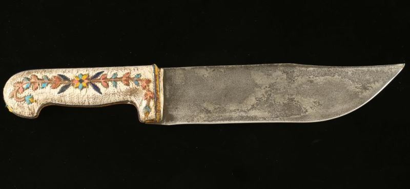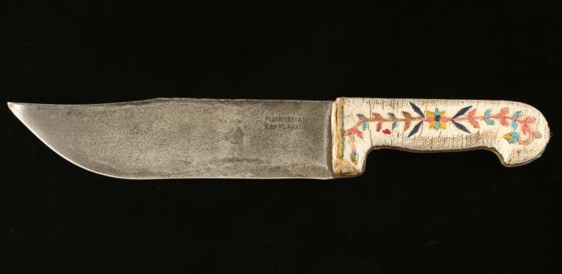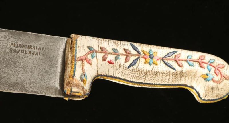 Large 9" handmade blade reads "Pedrocibrian Savulajal". Wood handle has been wrapped in rope or thread and painted white with a floral and vine pattern in colored thread on top. Shows use. Very unusual.