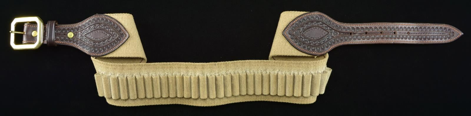 Approx. men's size 36 cloth belt w/ 30 cartridge loops. Brass buckle & embossed leather straps. CONDITION: very good w/ light wear & verdigris. (02-19356/MD). $50-100.