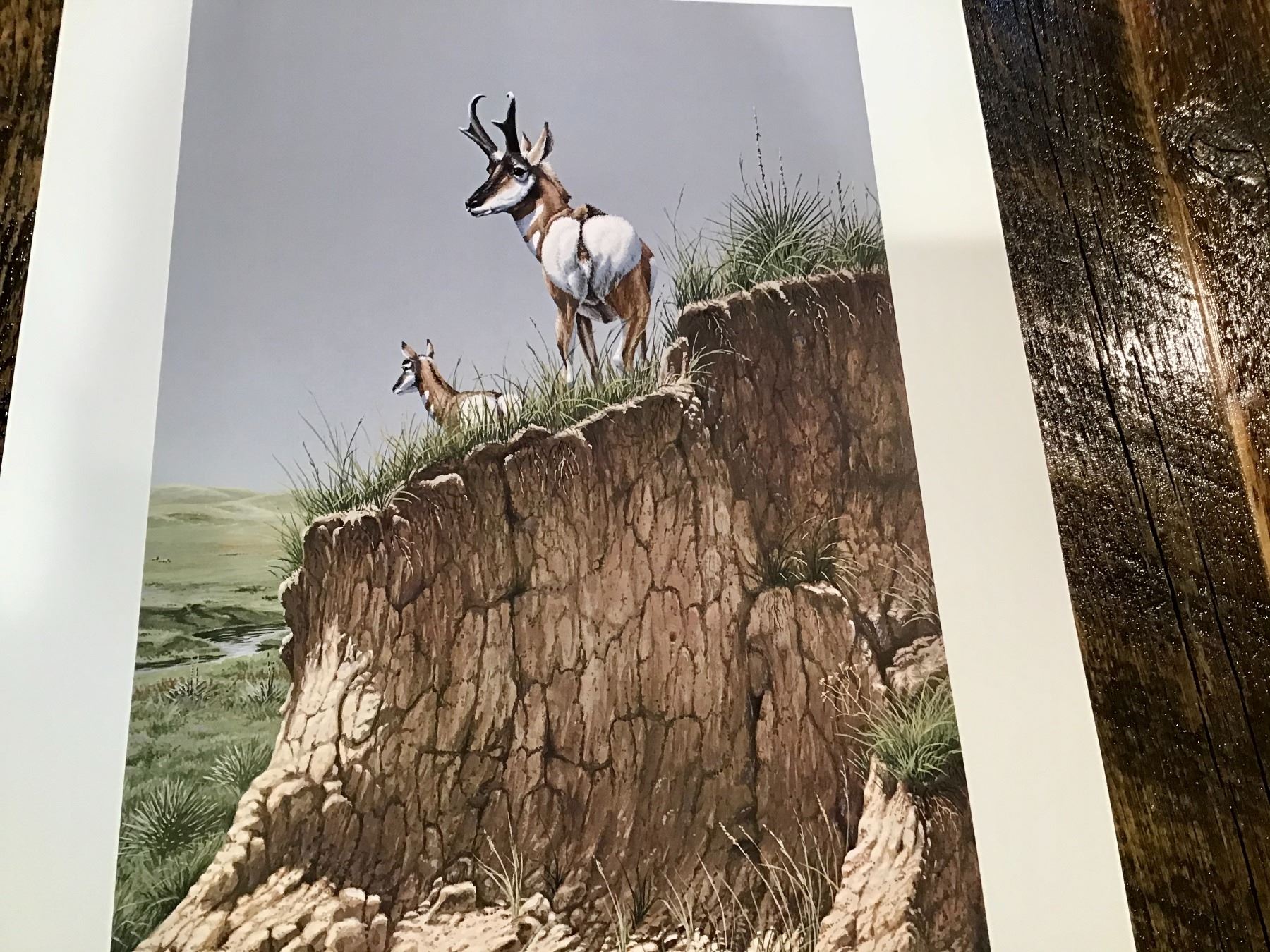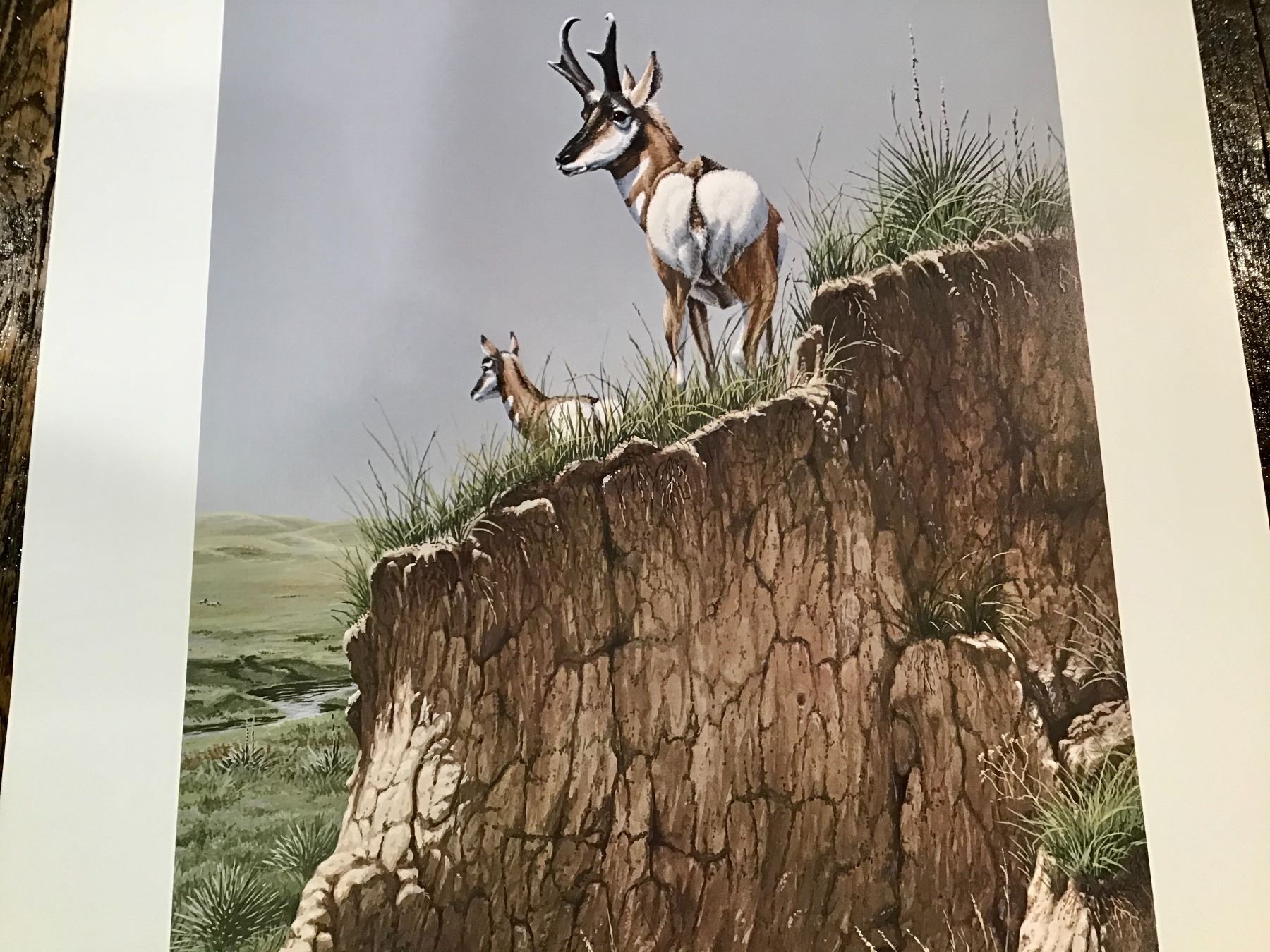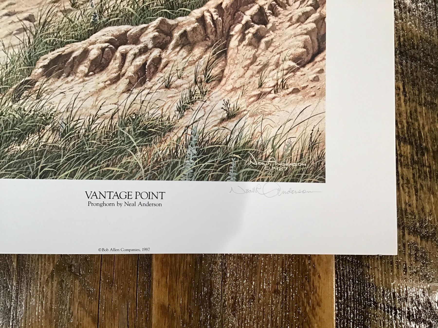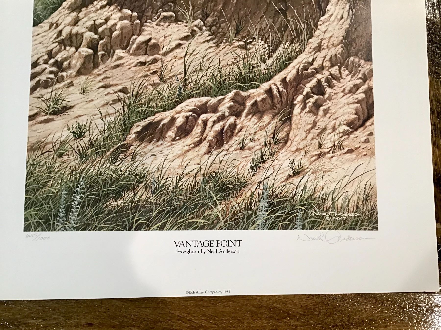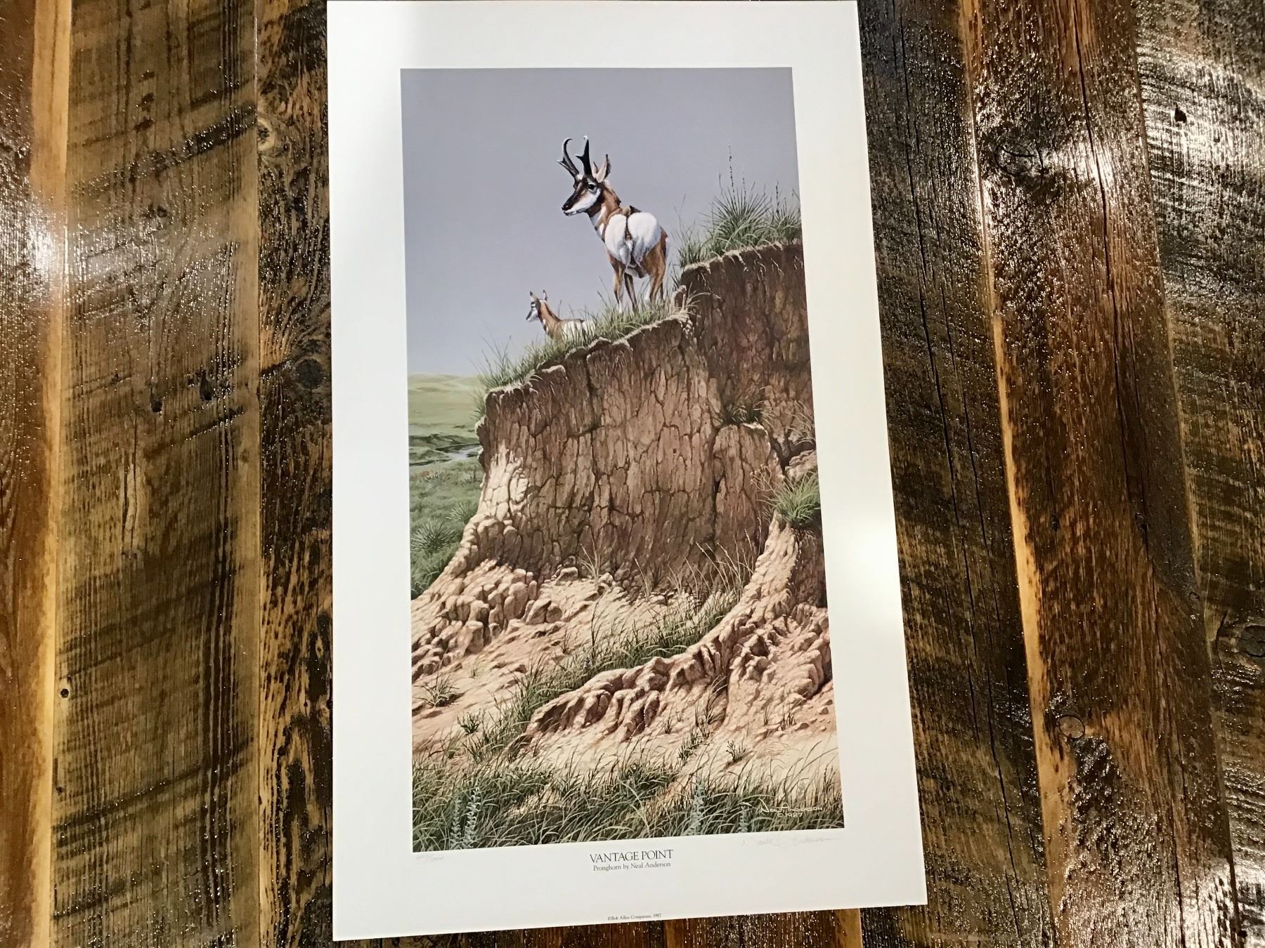 Ready for framing, signed and numbered print by wildlife artist Neal Anderson. This is number 625 of 1000 and features an antelope buck and doe on a cliff. It is a great vertical size and measures 25" tall and 15" wide as pictured.