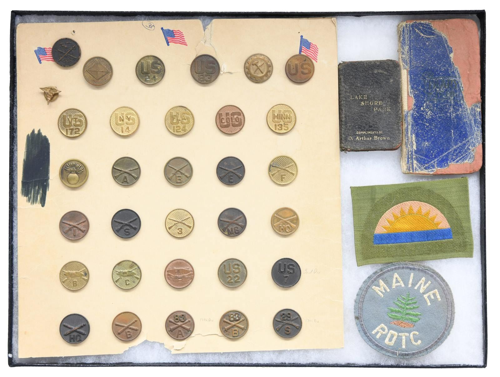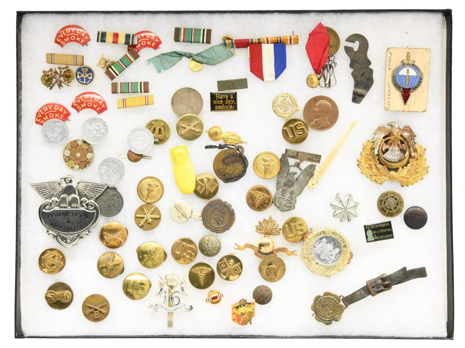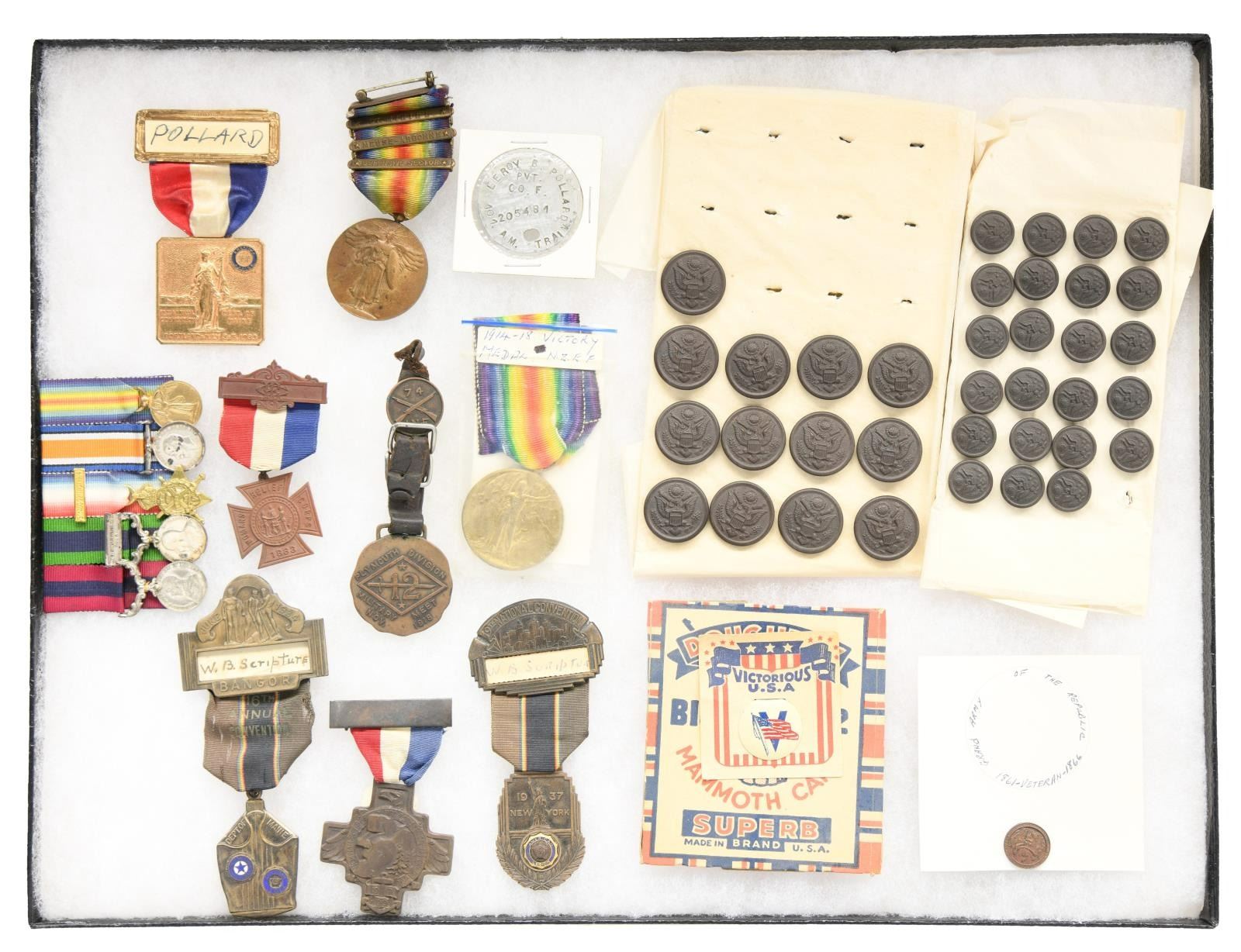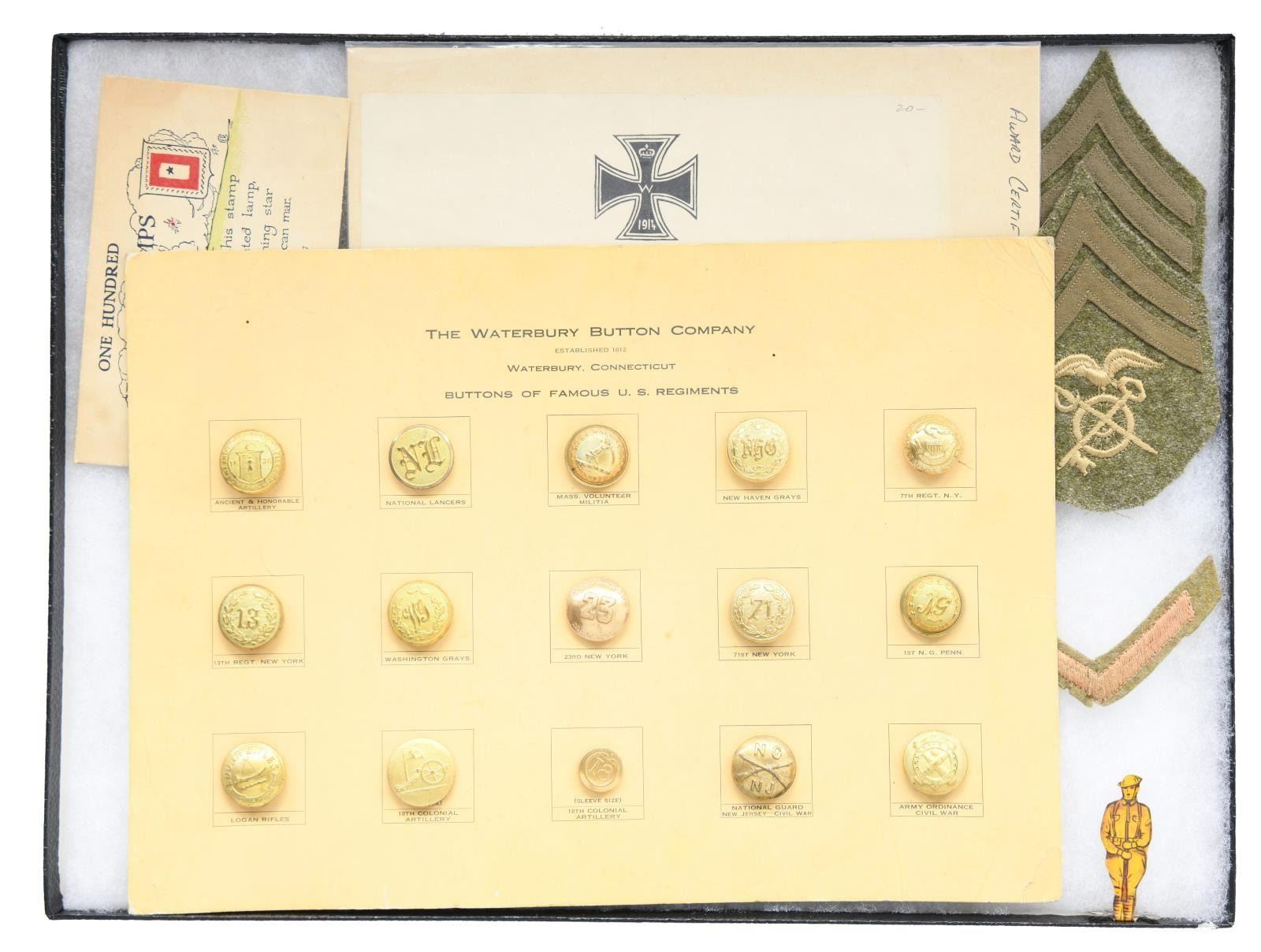 PIECES. This varied lot includes, but is not limited to, 1 WWI German Iron Cross award document. / 1 Package of WWI Sun & Service stamps. / 2 WWI Corporal stripes for a Quartermaster. / 1 WWI Overseas chevron. / 1 WWI tin toy soldier. / 1 Card of 15 military buttons from the Waterbury Button Company. / 2 Partial cards of WWI subdued buttons. / 1 WWI dog tag. / 4 WWI Victory Medals. / 1 Group of 5 British miniature medals. / 4 American Legion Medals. / 33 WWI collar discs. / Several WWII collar discs. / 1 US Reserve Faithful Service Medal. / 2 Army Good Conduct Medals. / Several cap badges from various foreign countries. / US ribbon bars. / 1 WWII Japanese should strap. / 1 Early balls & strikes counter. This lot further includes a variety of various military and related pins, badges, insignia & related material. Please see photographs for exact contents. CONDITION: generally all items show light wear with a few items showing heavier use. (02-19496-1/BF). $400-600.