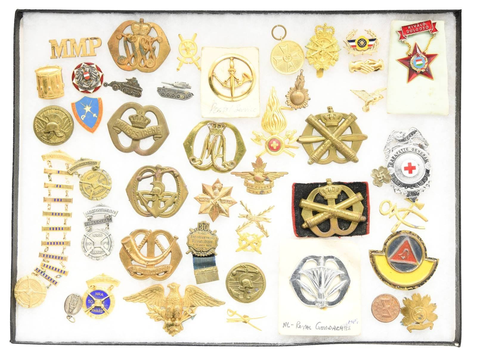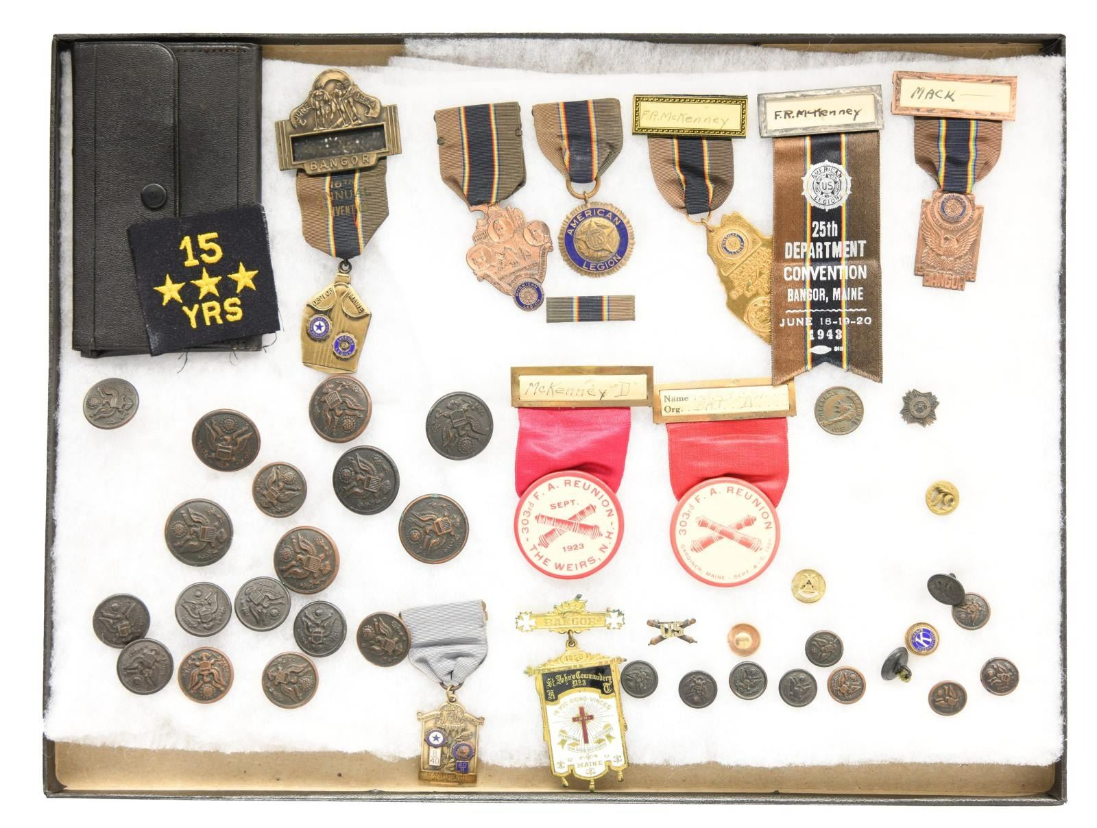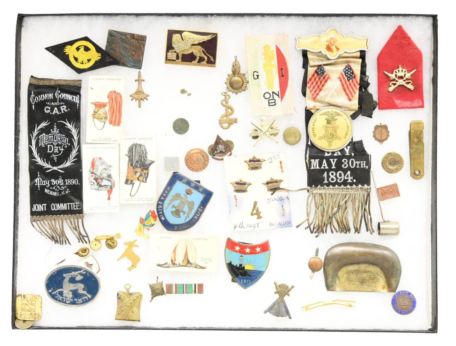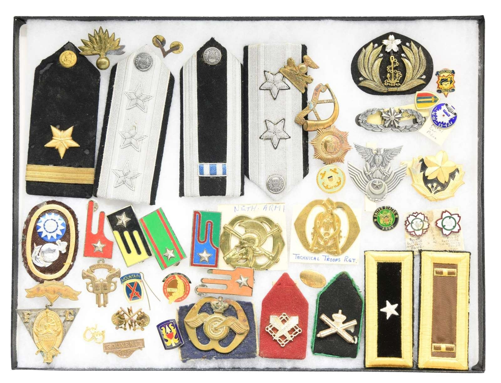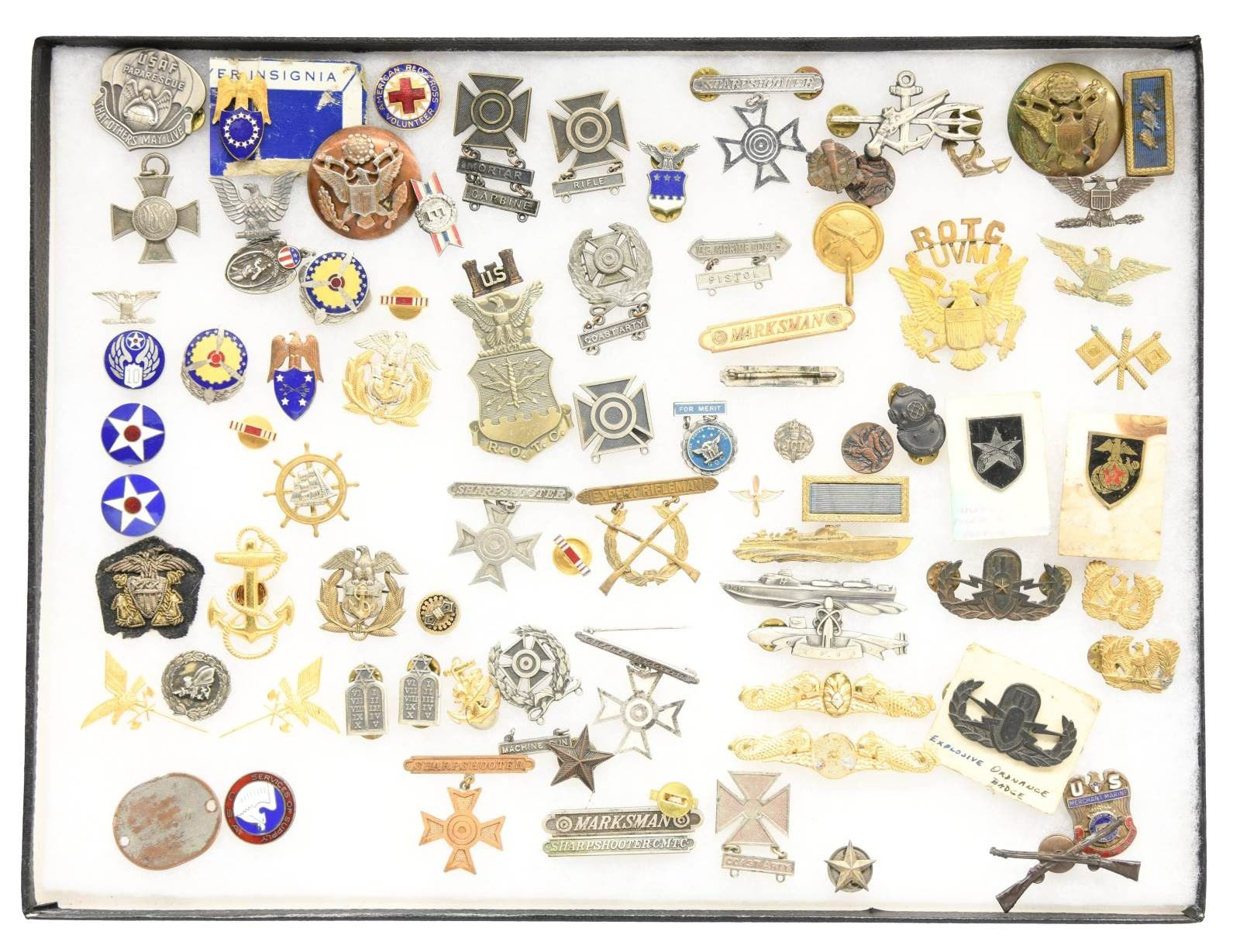 PIECES. This varied lot includes, but is not limited to, NRA Marksmanship Badges, foreign cap badges & insignia, an ambulance badge, Air Force Generals shoulder boards, Japanese badges & insignia, GAR ribbons, military head gear cigarette cards, political pins, WWI buttons, WWI specialty insignia, marksmanship badges, a Distinguished Service Cross, Civil Air Patrol rank insignia, military rings, dog tags, military buttons, shoulder straps & shoulder boards, American Legion Medals, Masonic Medals, Army & Navy qualification badges, Army Air Corps enamel pins, Sharpshooter Badges, ranger insignia & patches, rank insignia, an early CBI Patch, and many, many more interesting items. Please see photographs for exact contents of this huge lot. CONDITION: items generally show light wear, though a few items show heavy wear. (02-19496-2/BF). $800-1,200.