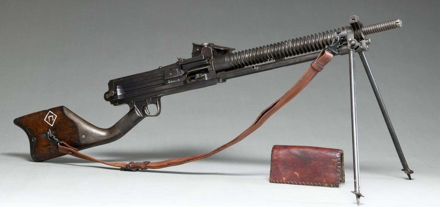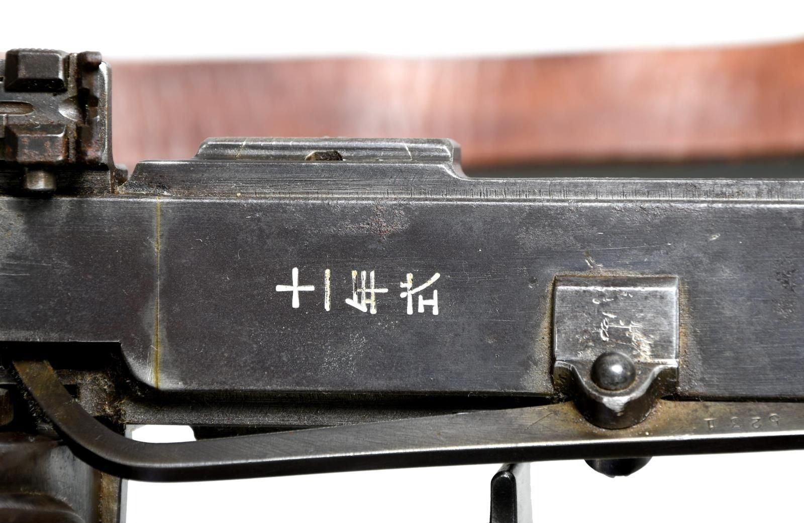Cal. 6.5mm. S# 35231. Bbl. 20". Mfg. Nov. 1939. First brought into service in 1922, this was the first light machine gun that Japan had designed for themselves. As odd as it may appear compared to other guns of the period, it had some equally unusual features specific to Japan. The left-side mounted feed hopper utilizes clips originally intended for the standard Arisaka rifle. This allowed any Rifleman to feed it, in case of an unexpected shortage. Another unique feature was their interesting oiling station as they were being loaded. While it had the ability to run their standard 6.5mm ammo, a slightly reduced load was designed for daily use. The Type 11 utilizes a gas operated, open bolt system w/ an adjustable gas port. The barrel incorporates enormous circular cooling fins as evidence of being heavily inspired in design by the early French Hotchkiss heavy machine gun. These heavy fins measure almost 2" in diameter for the first 12" of barrel, beyond the chamber, and are reduced to .86" in the last 3" to the muzzle. Aside from the unique, heavily finned barrel, the Type 11 may be easiest identified by its right side, angular stock, which protrudes from the bottom of the rear facing pistol grip in a tubular manner before returning to a more traditional shoulder stock shape. The front 7" is steel, integral w/ the trigger group, before utilizing wood construction, ending w/ a heavy steel buttplate. This offset design allows for both right & left hand operation & allows an easier disassembly without having to remove the stock. Just rear of the front sight is a rear folding bipod w/ 17" legs. Front sight is a protected blade, offset to the right side of the action, to coincide w/ the rear sight, adjustable from 200 to 1500 meters. Receiver markings include the Japanese characters "Ju Ichi Nen Shiki" translating to "11th Year Type" above the serial number, "35231"on top, as well as "14.11" on right, indicating Showa Era year 14, 11th month translating to the manufacturing date of November, 1939 & the Kokura Arsenal manufacture symbol. Numbers matching the receiver on several parts including receiver rear block which also holds the op rod spring guide, rear sight, op rod, barrel, & gas system. Several smaller parts have different numbers which isn't unusual. Brown leather sling which spans from the right side of the shoulder stock to the barrel, just rear of the front sight. One interesting piece that is seldom retained is the leather heat shield, constructed of leather & wire screen, swen together & retained w/ a small metal chain. UNATTACHED ACCESSORIES: Leather heat shield, photo copied operation manual in Japanese. CONDITION: Finish coverage on exposed metal surfaced is remarkably full. Some thinning on high spots & a gentle scattered patina. It has been dewatted primarily by welding a rod into the chamber of the barrel but were extremely gentle to the interior of the receiver, apparently removing it prior to plugging. Aside from the hopper cover which is a little sticky in some phases of operation, all fire control parts move freely and the fire control mechanism appears to function correctly when cycled by hand. NATIONAL FIREARMS ACT DEWAT MG REQUIRING BATF TRANSFER BEFORE TAKING POSSESSION. FULLY TRANSFERABLE.(03-1632/JZ). CURIO CLASS III. $5,000-8,000.