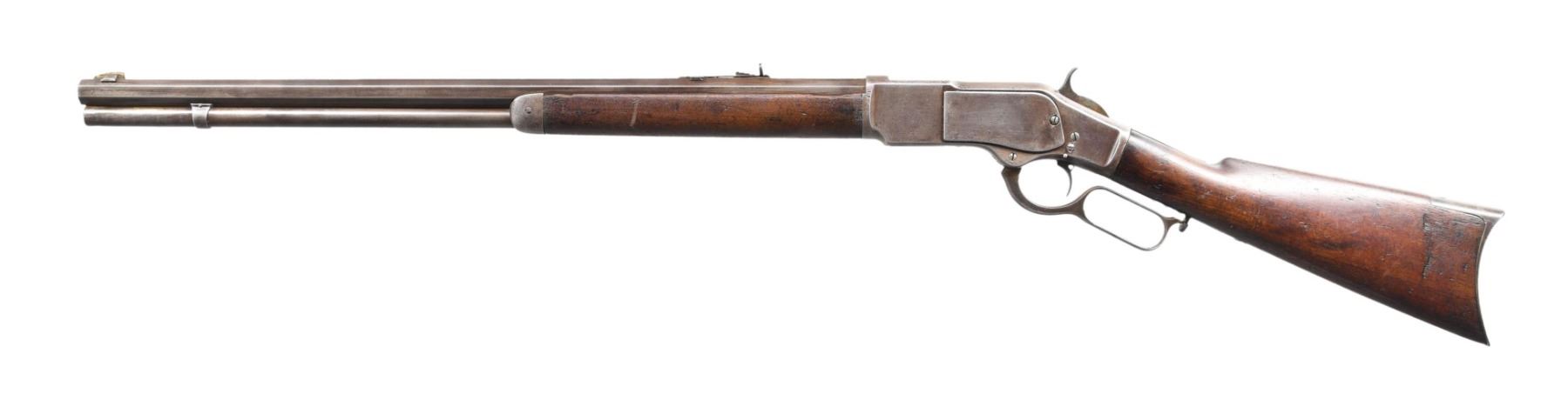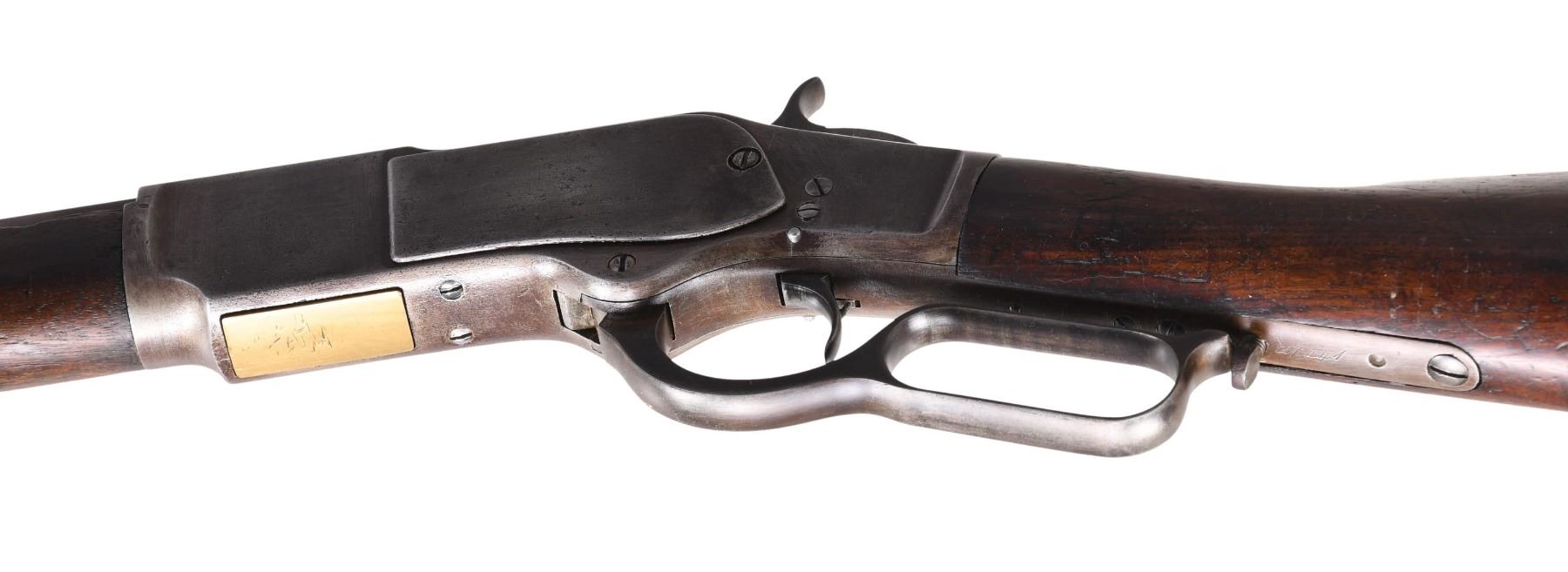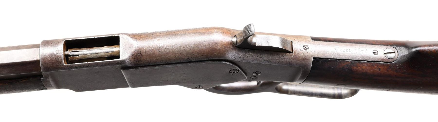 RIFLE. Cal. 44 WCF. S# 27441. Bbl. 24" octagon. Rocky mountain front sight w/ German silver blade & sporting rear sight. Full length mag. The scarce open top 1873s are found between S# 27,000 & 28,000. They were produced during the patent infringement period as were the open-top 1876s. Features include bushed firing pin, pinned single set trigger & early style loading latch. Walnut forearm & straight grip stock w/ crescent steel buttplate. UNATTACHED ACCESSORIES: Cody Firearms Museum letter stating the following information, "Type: Rifle / Barrel Type: Octagon / Trigger: Set / Received in warehouse on December 31, 1877 / Shipped from warehouse on May 01, 1878, Order number 11690." CONDITION: metal has faded to a light gray-brown showing areas of light pitting & small dents. Wood has dark worn appearance w/ numerous scratches, marks & heavy gouges. Forearm is missing chips along the bbl. channel. Action & trigger have good function. Dark pitted bore retaining largely intact rifling. PROVENANCE: From the lifelong collection of Jerry Senter. (01-24824/DS). ANTIQUE. $2,500-4,000.