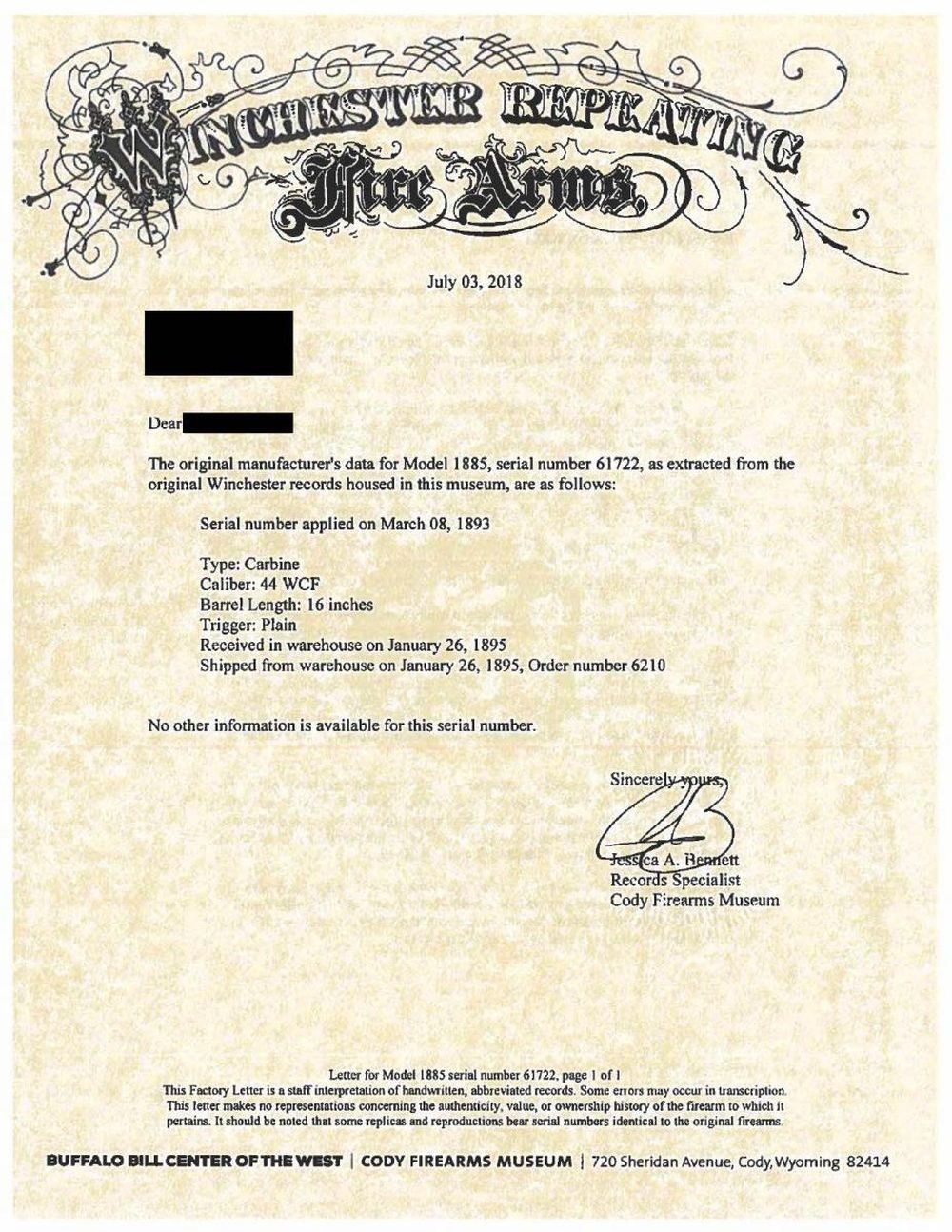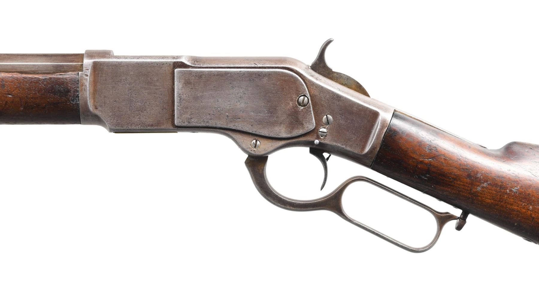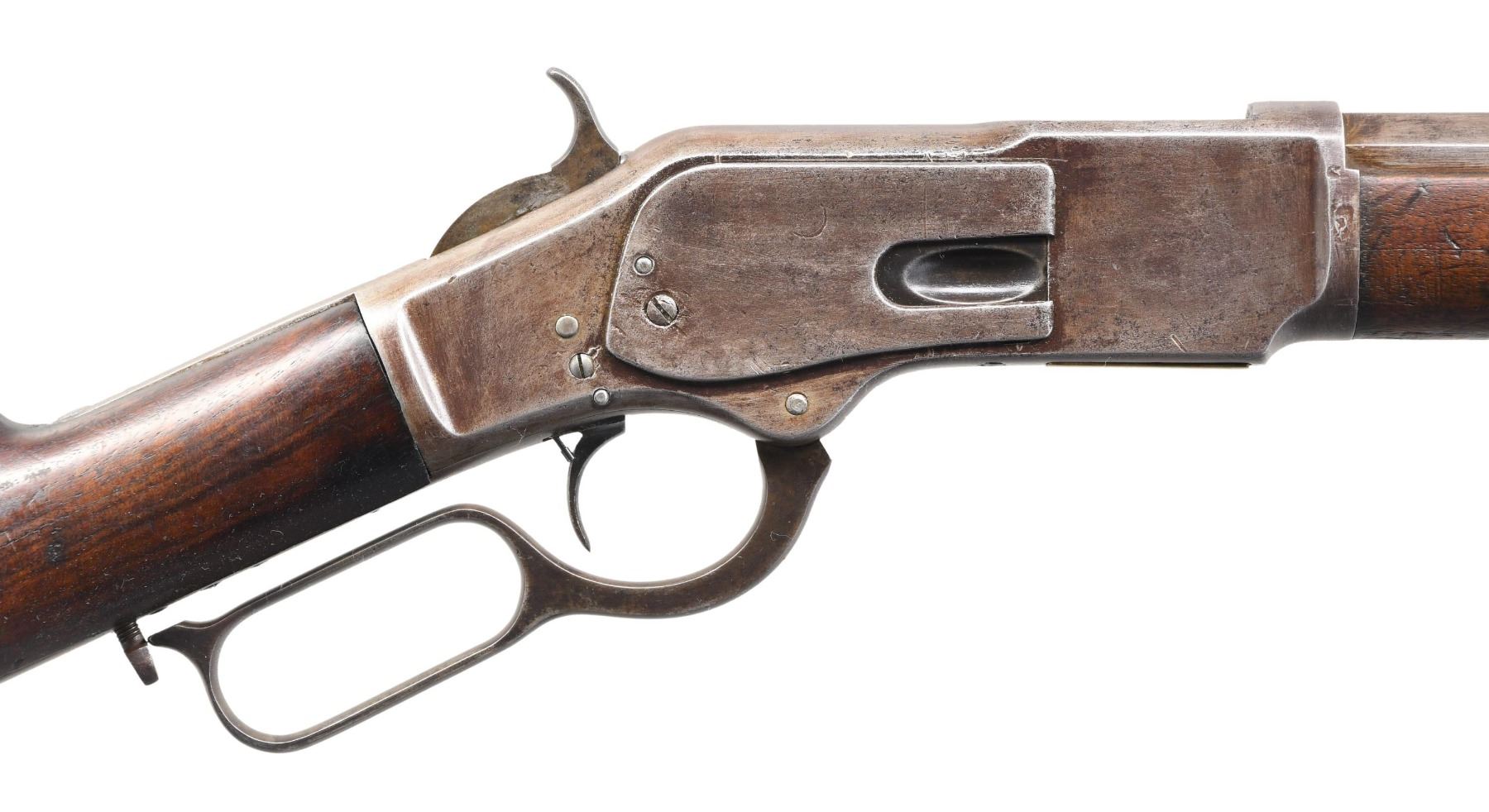 RIFLE. Cal. 44 WCF. S# 27441. Bbl. 24" octagon. Rocky mountain front sight w/ German silver blade & sporting rear sight. Full length mag. The scarce open top 1873s are found between S# 27,000 & 28,000. They were produced during the patent infringement period as were the open-top 1876s. Features include bushed firing pin, pinned single set trigger & early style loading latch. Walnut forearm & straight grip stock w/ crescent steel buttplate. UNATTACHED ACCESSORIES: Cody Firearms Museum letter stating the following information, "Type: Rifle / Barrel Type: Octagon / Trigger: Set / Received in warehouse on December 31, 1877 / Shipped from warehouse on May 01, 1878, Order number 11690." CONDITION: metal has faded to a light gray-brown showing areas of light pitting & small dents. Wood has dark worn appearance w/ numerous scratches, marks & heavy gouges. Forearm is missing chips along the bbl. channel. Action & trigger have good function. Dark pitted bore retaining largely intact rifling. PROVENANCE: From the lifelong collection of Jerry Senter. (01-24824/DS). ANTIQUE. $2,500-4,000.