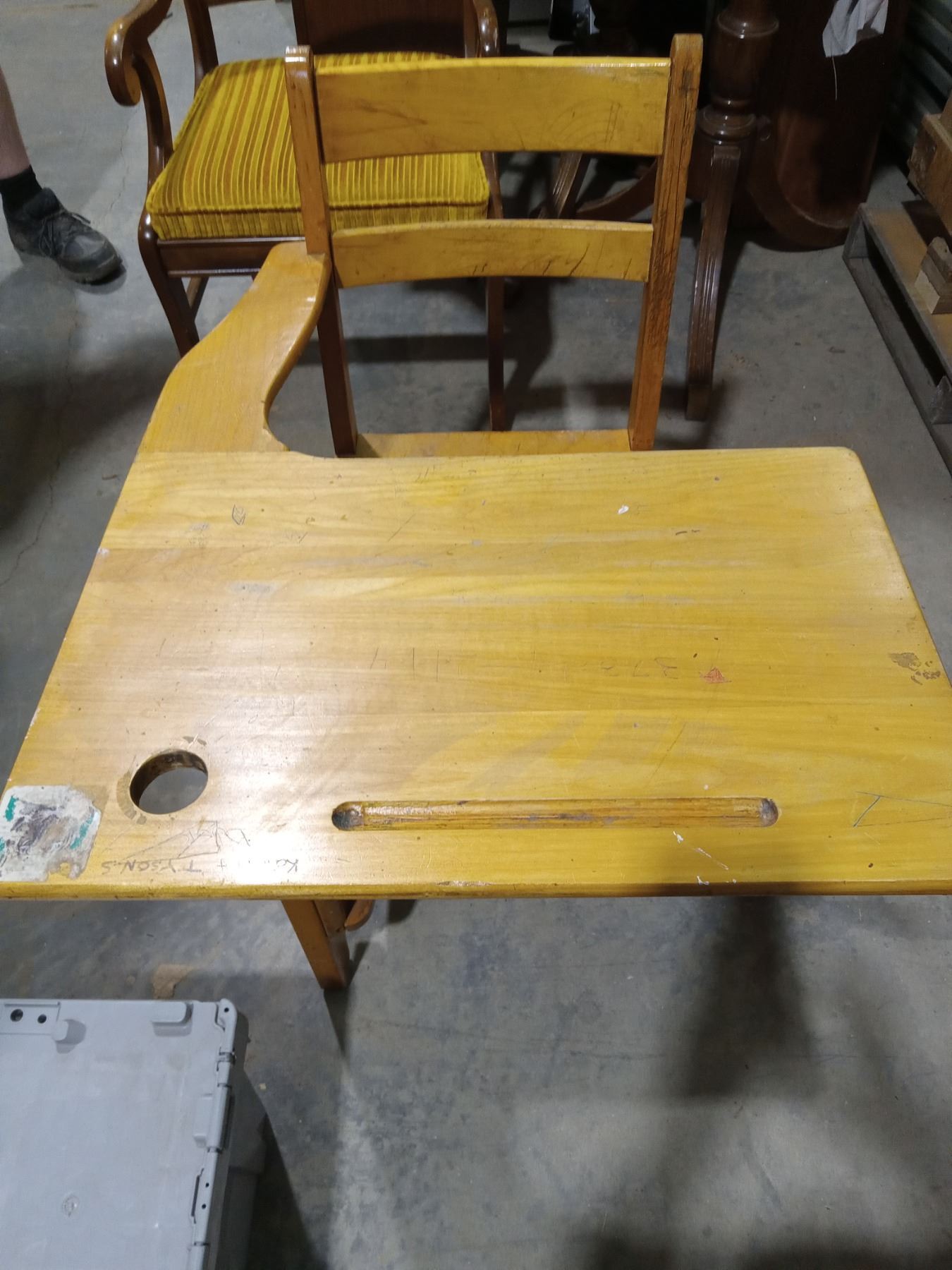 VINTAGE ANTIQUE SOLID WOOD SCHOOL DESK w/ INK WELL HOLE & DRAWERED SEAT.