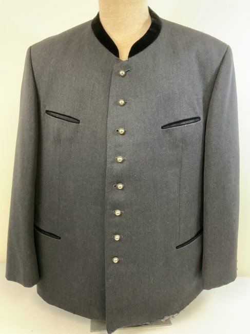 VINTAGE GERMAN BAVARIAN TRACHTEN JACKET . HIGH QUALITY GRAY WOOL JACKET. LARGE SIZE. LEFT BOTTOM SIDE ON THE FRONT HAS A DAMAGE CUT LIKE TEAR . NICELY LINED INSIDE WITH TAYLOR LABEL. INITIALS "AH' HAND EMBROIDERED INSIDE .