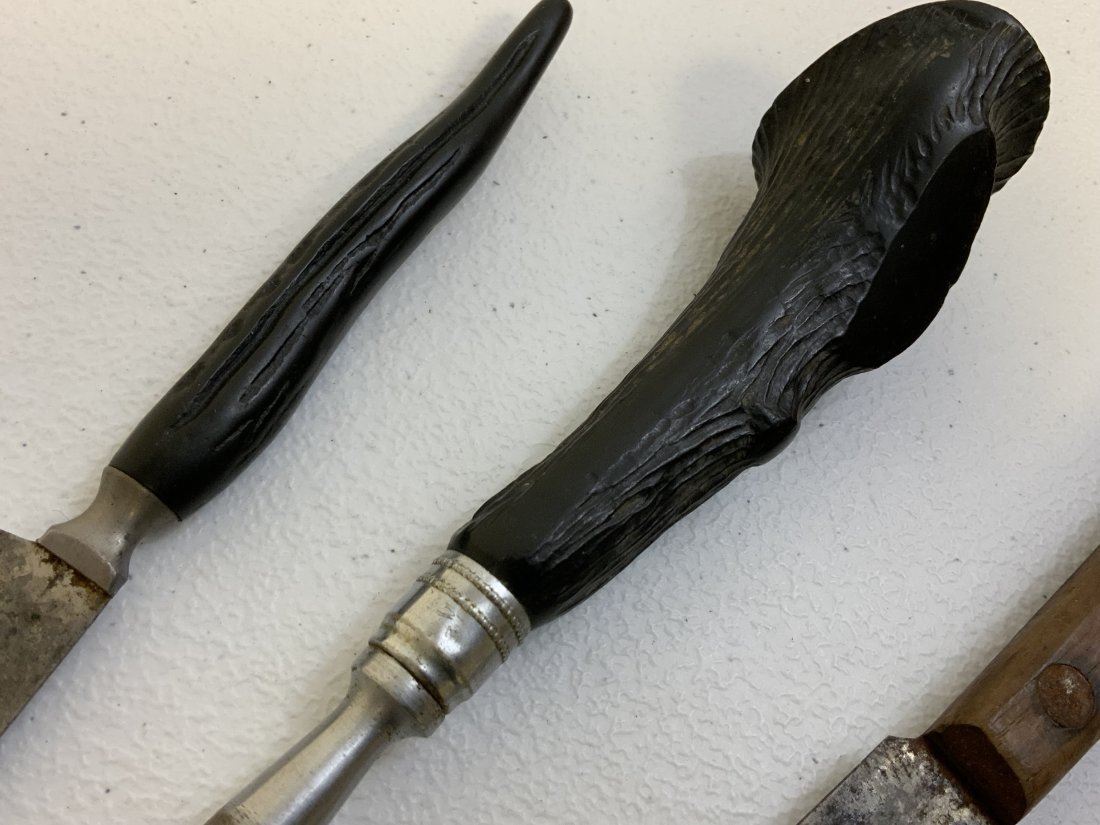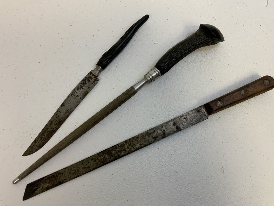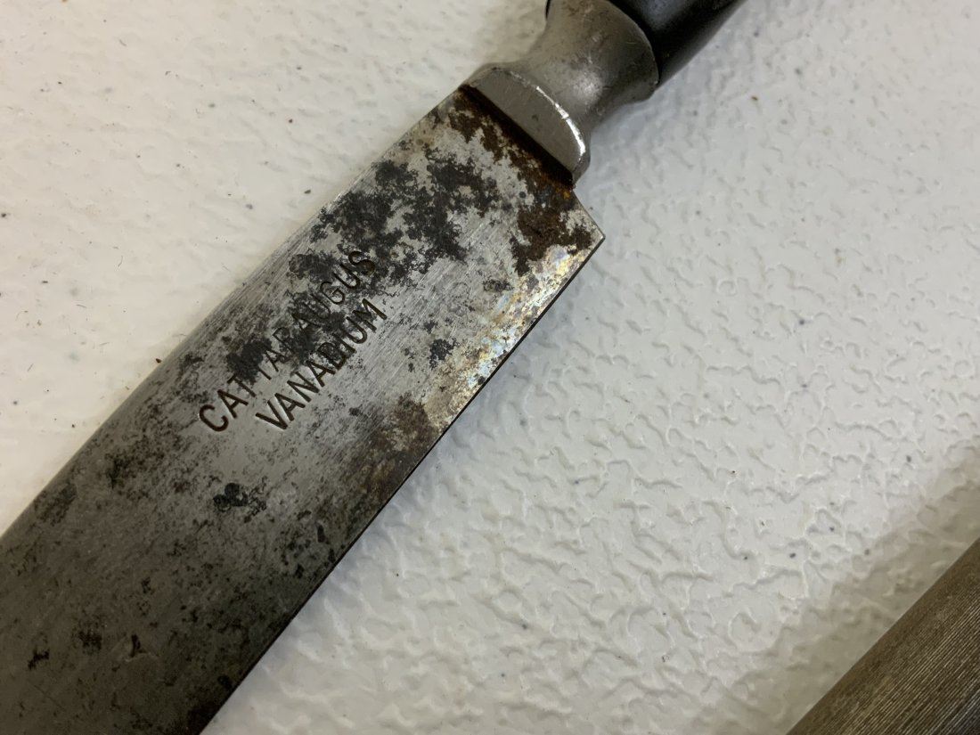 VINTAGE KNIVES AND SHARPENING TOOL . CATTARAUGUS VANADIUM MARKED ON ONE OF THE KNIVES BLADE . SHOWS AGE AND WEAR .