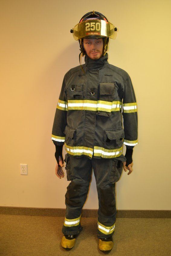 VINTAGE ORIGINAL FIREFIGHTER FULL SUIT WITH BOOTS .AUBURN , INDIANA . HELMET AND MANIKIN ARE NOT INCLUDED.