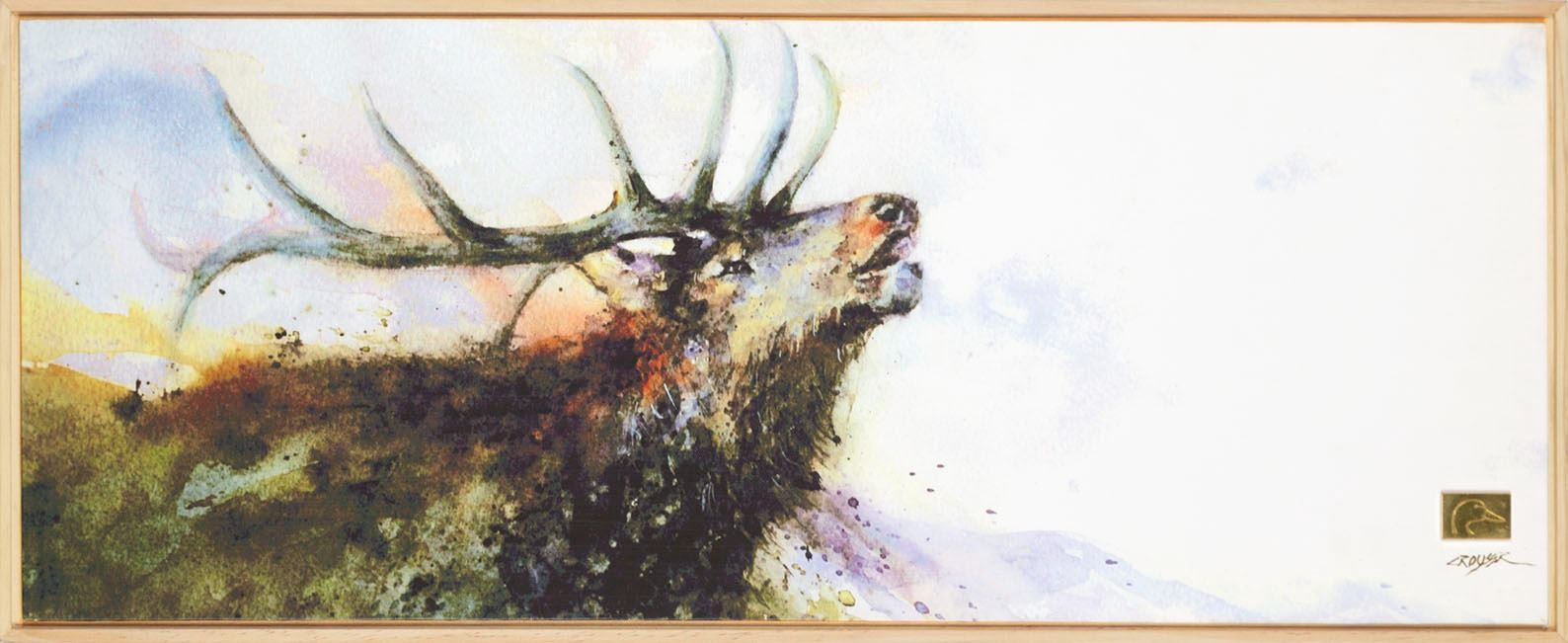 Dean Crouse was born and raised in Oregon and his love of fishing, camping and the outdoors can be found in the expressions of his art. Valley Call is a framed canvas giclee of a bugling elk and features a brass DU logo medallion and the printed artist’s signature. The canvas is floated in a shadowbox style wooden ash frame. In a consecutively hand numbered Certificate of Authenticity. Overall dimensions are 12”x 30”