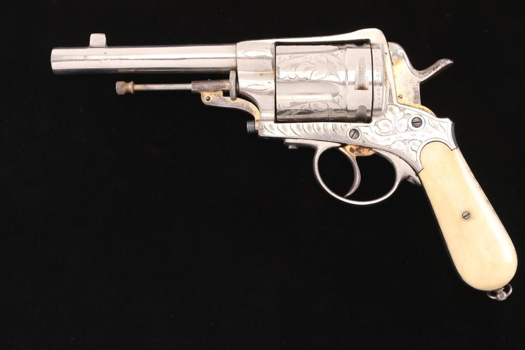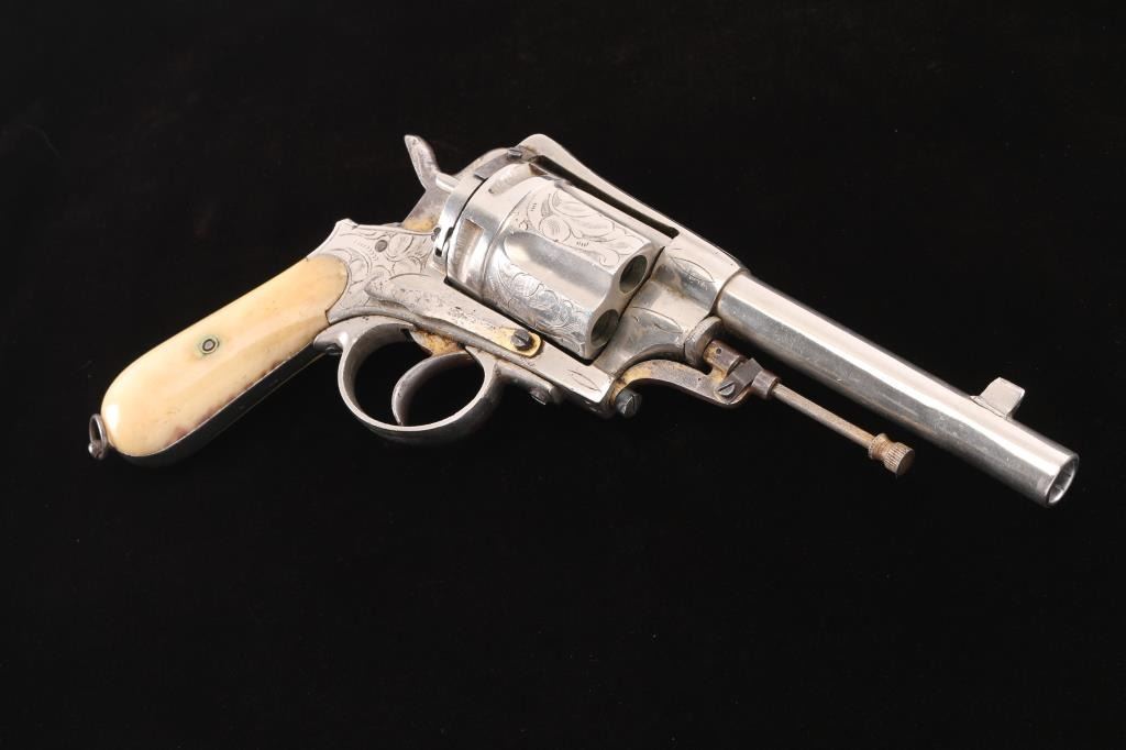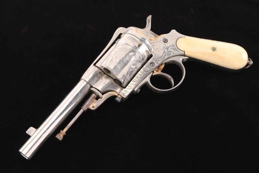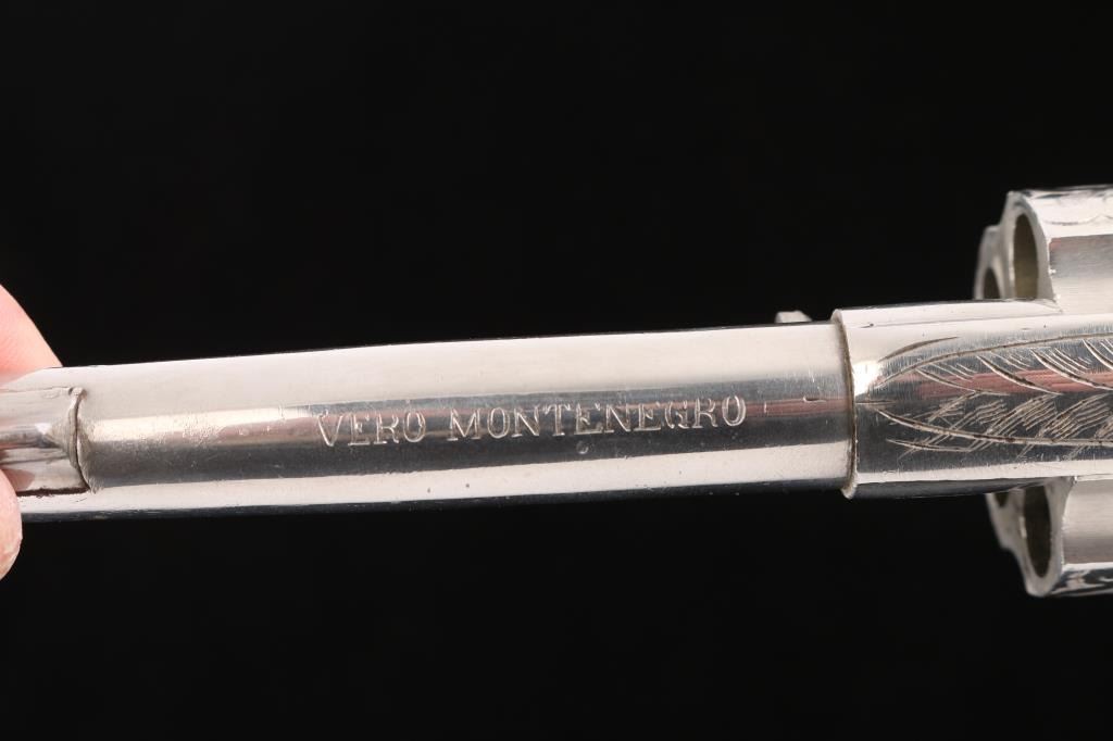 Montenegrin. Antique Vero Montenegro marked Gasser Style Revolver, manufactured in Europe circa the 1880s. A Montenegro revolver is basically a large frame double action revolver chambered for the 11mm cartridge and primarily made in Austria, Belgium, and Spain. These were developed by Leopold and Johann Gasser of Vienna, Austria but made by numerous small Belgian, Spanish and Austrian firms. Unmarked except for "30" on the cylinder face, loading gate and the underside of frame, 5" barrel, nickel plated, floral engraved, bone grips, small lanyard ring. Bore appears very good, strong rifling, action is smooth with tight lock-up, grips are very good with no chips or cracks, nice patina. Finish is all there, no flaking with minor scratches, edge wear. The only revolver named after a country.NRA Condition-Fine. Antique Firearm.