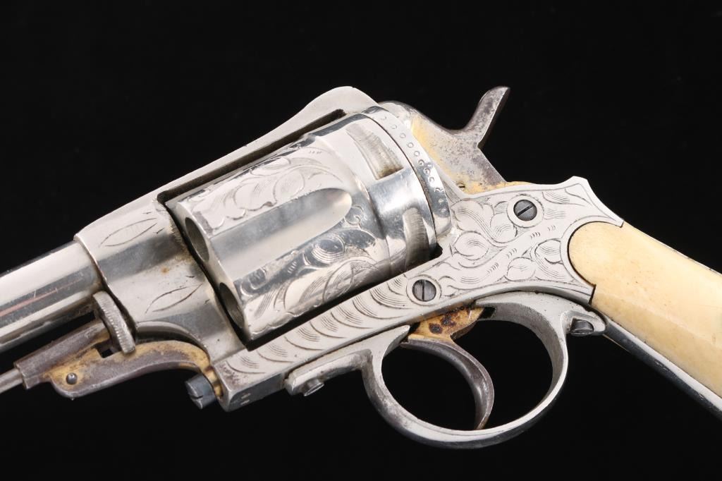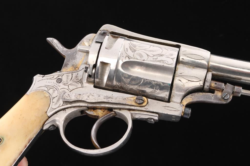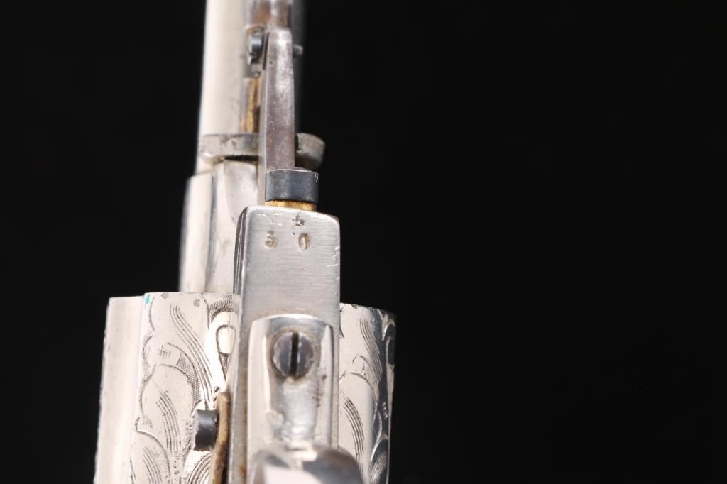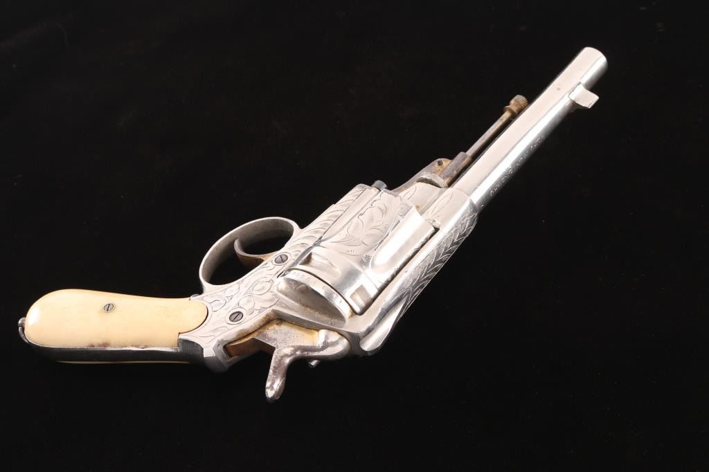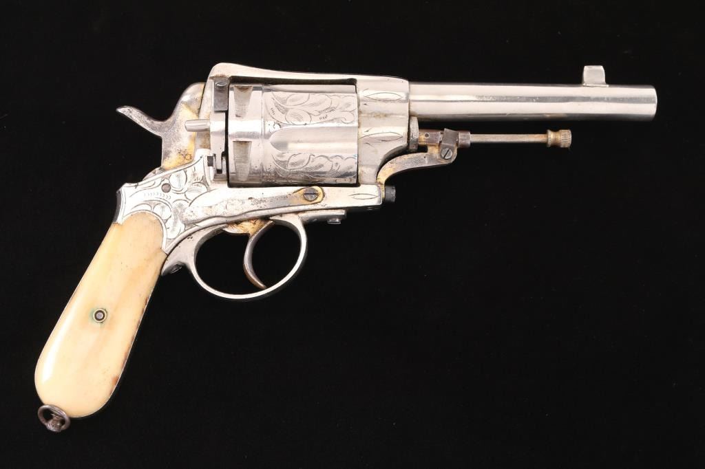 Montenegrin. Antique Vero Montenegro marked Gasser Style Revolver, manufactured in Europe circa the 1880s. A Montenegro revolver is basically a large frame double action revolver chambered for the 11mm cartridge and primarily made in Austria, Belgium, and Spain. These were developed by Leopold and Johann Gasser of Vienna, Austria but made by numerous small Belgian, Spanish and Austrian firms. Unmarked except for "30" on the cylinder face, loading gate and the underside of frame, 5" barrel, nickel plated, floral engraved, bone grips, small lanyard ring. Bore appears very good, strong rifling, action is smooth with tight lock-up, grips are very good with no chips or cracks, nice patina. Finish is all there, no flaking with minor scratches, edge wear. The only revolver named after a country.NRA Condition-Fine. Antique Firearm.