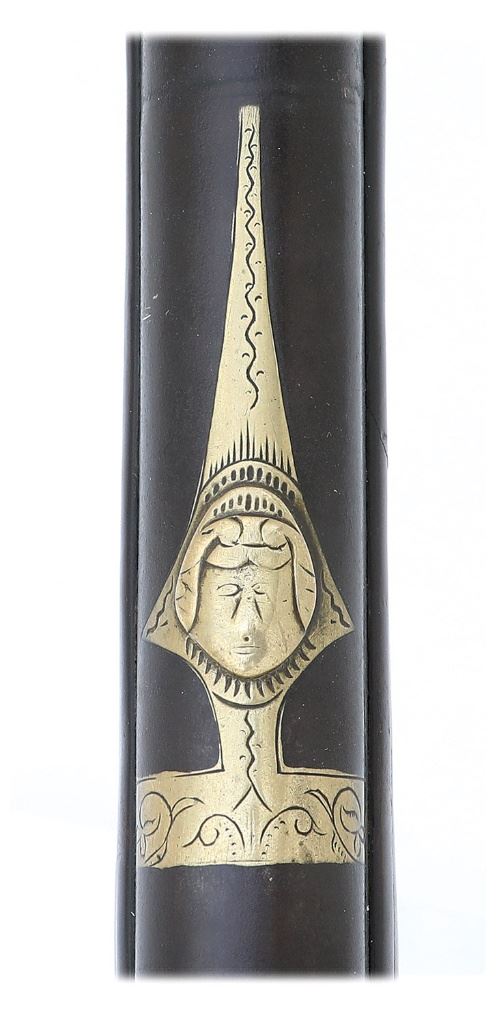 About .75 cal., 51 1/2'' round barrel with an oxidized bore. This is a very handsome and attractive club butt fowler, following very closely the contours and construction of the French ''buccaneer'' guns issued by the French Navy for topsail firing. The barrel itself is an overall very pleasing smooth plum brown patina showing light incise engraving with medial rings at the breech, a brass banded appliqué about a 12'' forward with light incise engraving and a raised chiseled face, much of the detail lost to the years due to the soft nature of the brass, with dual medial rings ahead of this. Nearer the muzzle we find a simple scant brass blade front sight and there is actually a seam about 8 1/2'' from the muzzle which can be detected, however it appears original in every respect to the gun and not an example of ''stretching'' as the interior is seamless and exhibits the same oxidation its full-length, and a very close inspection of the stock shows absolutely no evidence of it being stretched. The gun is a later percussion conversion by the drum and nipple method and features a T. Ketland & Co. lock with a gunsmith-made percussion hammer, the plate fitting the inletting of the stock very well. This example has the oft-seen brass nose plate about 5'' in length with small medials, it being somewhat loose, its retaining pin not present. There are four simple ramrod thimbles and a simple tailpipe while the triggerguard has a fleur-de-lis front extension and beveled edges with very light incise engraving. There is a flat sideplate which is lightly engraved and the heavy brass buttplate has a slightly ornate tang with light incise engraving as well. The stock itself appears to be a tight grained maple or other hardwood with a rich tobacco-russet color and blackened soot and grime from the years within the recesses, adding to the extremely honest untouched character of the arm. There are of course the expected light dings and handling marks here and there, with a few small chips or cracks along the barrel channel. Both flats have light islands with scallop shell carving to the rear of the tang and very French deep comb flutes with a light incise groove carved. There is a silver oval monogram plate atop the wrist neatly engraved ''SB'' and there is an antique ramrod included which is likely a replacement. The arm is strikingly similar to examples seen in Flintlock Fowlers The First Guns Made in America © Grinslade 2005, in the chapter on club butt fowlers. While the stock appears very much to be Yankee wood, the balance of the arm is very French in its in character, especially the applied face atop the barrel, it is very possibly a Yankee restock utilizing the same stock design as the original parent musket. An extremely attractive and honest club butt musket measuring 67'' overall length. (3D11739-95) {ANTIQUE} [Former Peter Tillou Collection] (4000/6000)