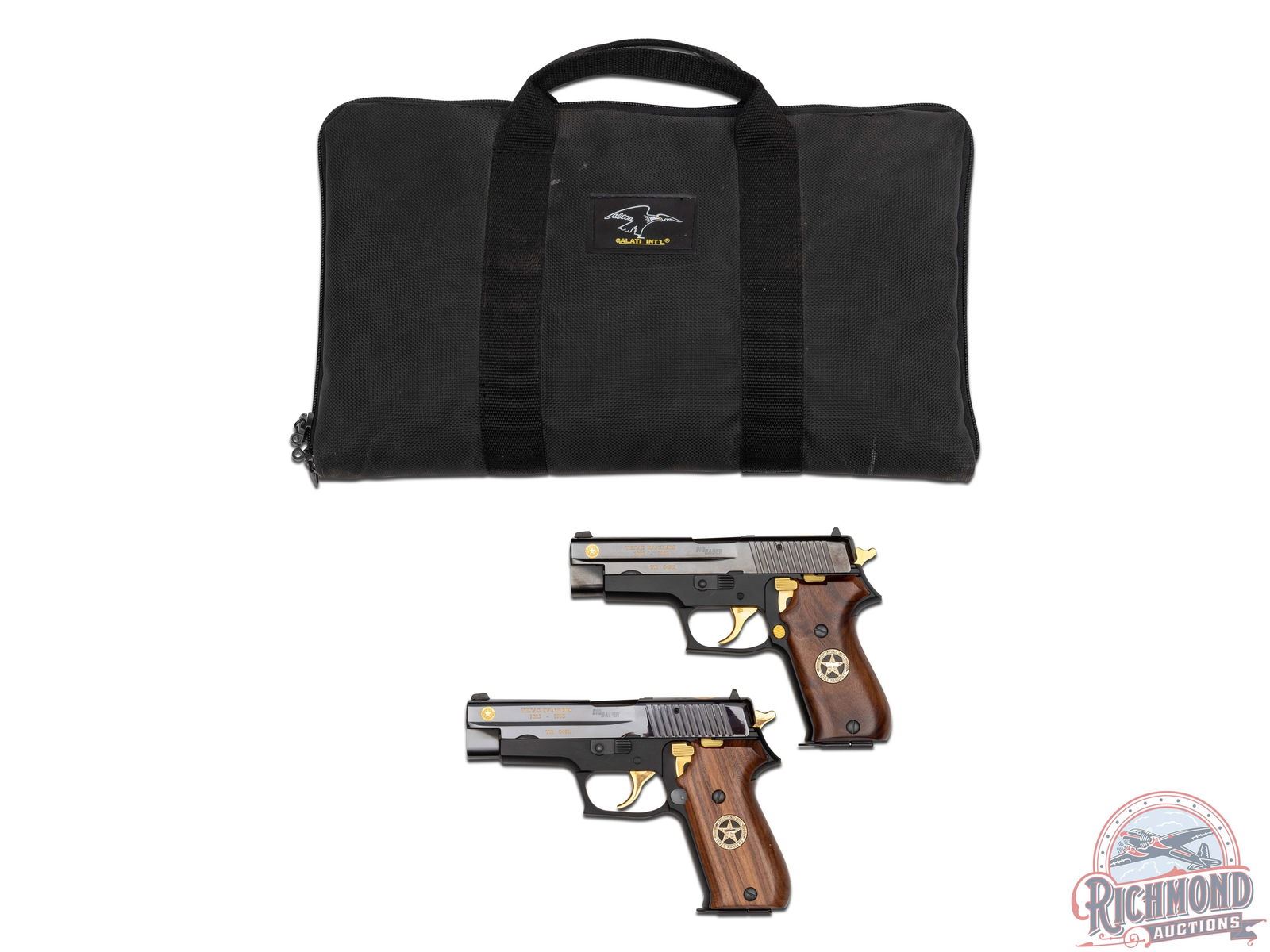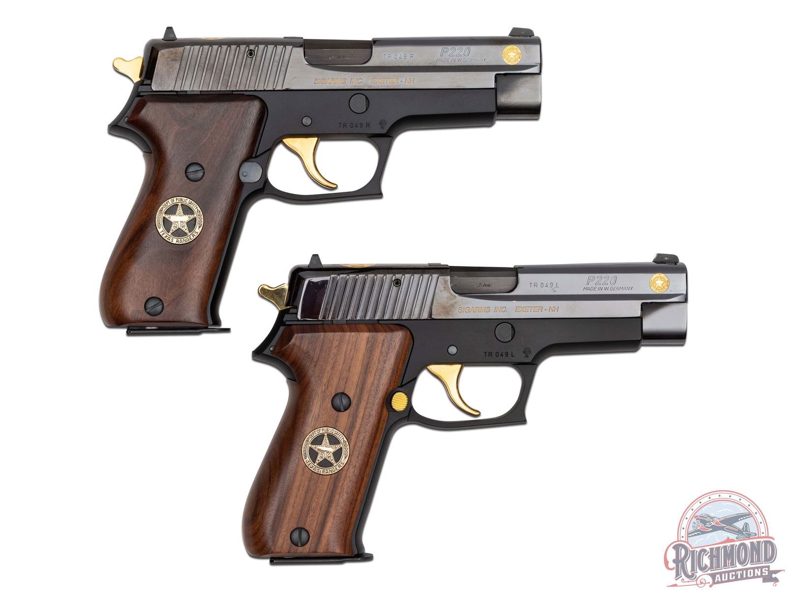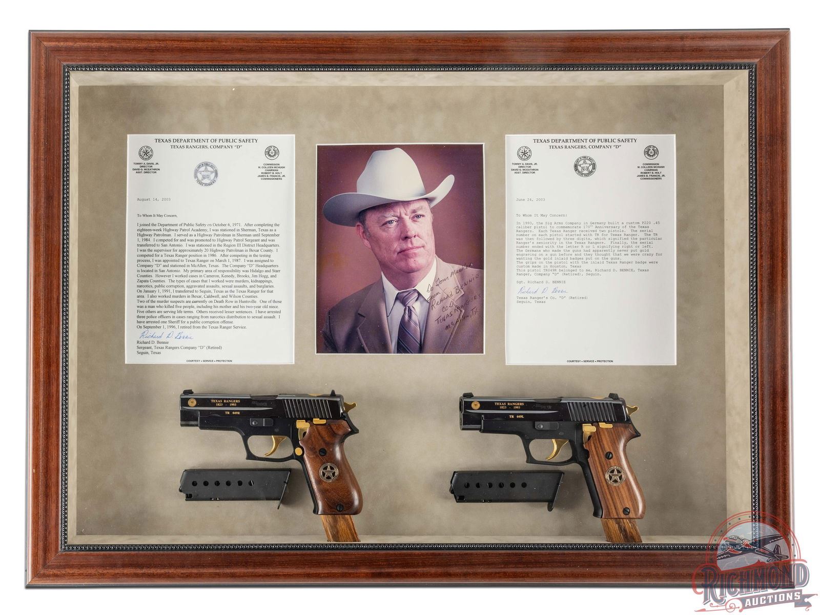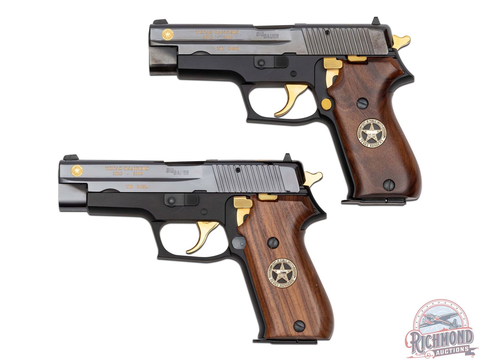 These matching pair of pistols were manufactured in 1993 by Sig Arms in Germany to commemorate the 170 years of the Texas Rangers. TR in the serial number signifies Texas Rangers, number 049 which signifies the seniority of the ranger it was presented to and followed by L or R for left and right. This gorgeous pair features 4-1/2" barrels in high polished blue slides, white highlighted rear notch sight and white dot front sight. Gold inlaid Dept. of Public Safety Texas Rangers insignia adorns the left and right end of the slide near the muzzle and on the top rear of the slide. Right side of the slide and frame have matching serial numbers stamped. Left side of the slide is stamped in gold lettering "TEXAS RANGERS / 1823-1993" as well the serial number. Each accented with a gold-plated hammer, trigger, magazine release, decocker and slide stop. Houston, TX USA made walnut smooth grips with a gold inlaid Texas Rangers Star insignia inlaid on both sides. This gorgeous set was presented to the late Sargent Ranger Richard Bennie. Mr. Bennie's provenance, history and photograph are carefully matted and framed in the pistol display case. Dark wood frame display with glass front measures 32" x 24". CALIBER: 45 ACP. S/N: TR049L & TR049R. FFL STATUS: Modern.
