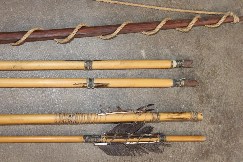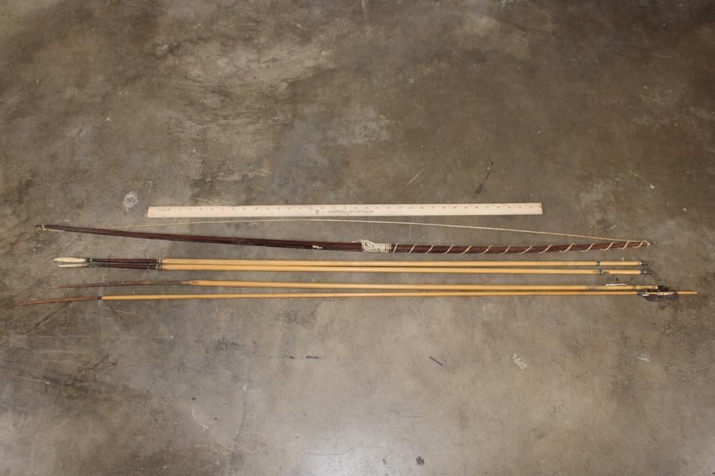 Very Old Indigenous African TRIBAL BOW. It has 4 Arrows, 2 are made with Bone Points and 2 are made with Wood Points. The Bow measures 56" Long. The longest arrow measures 60" Long. AFRICAN HUNTING ARTIFACTS