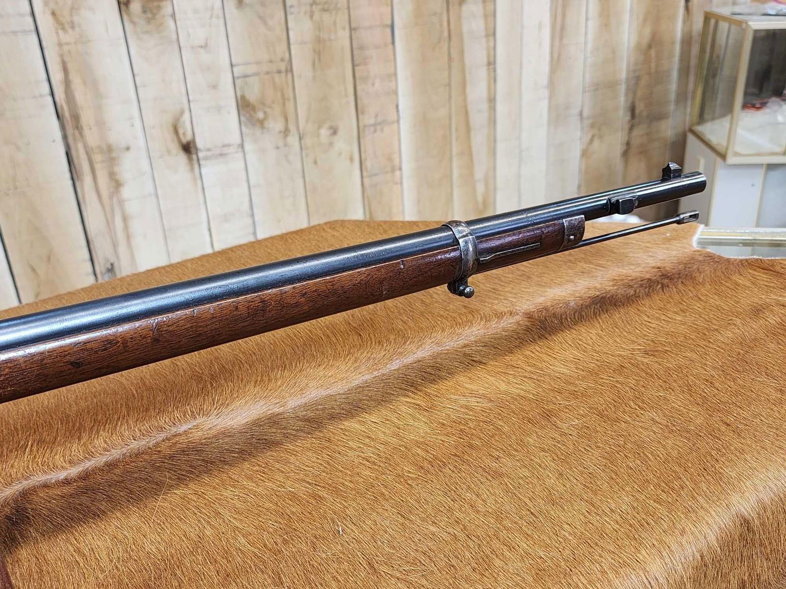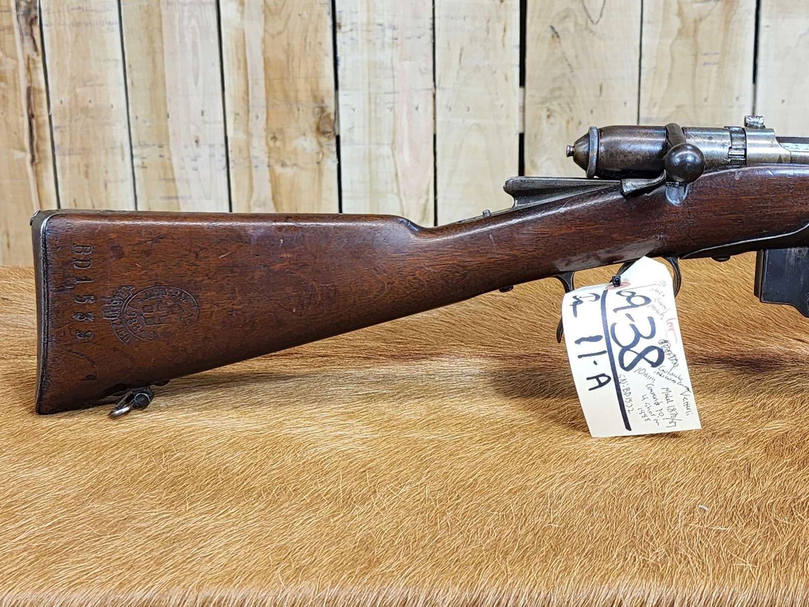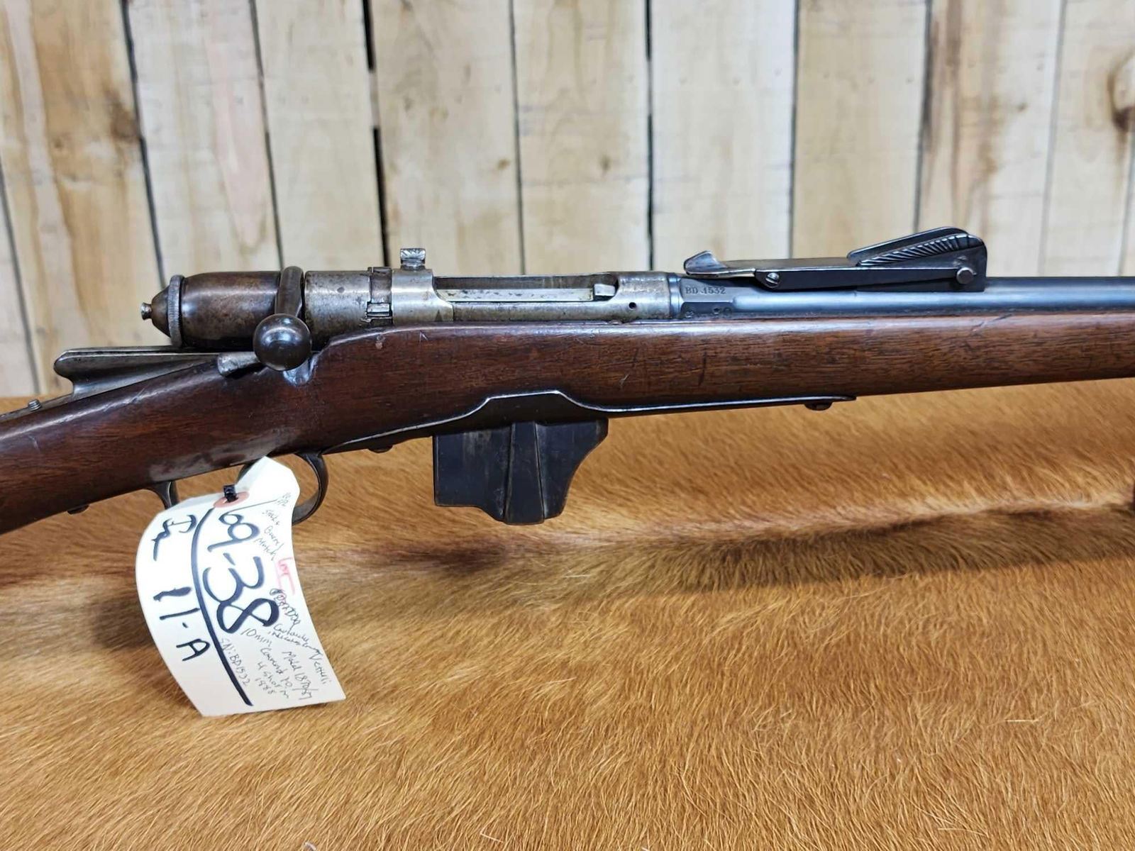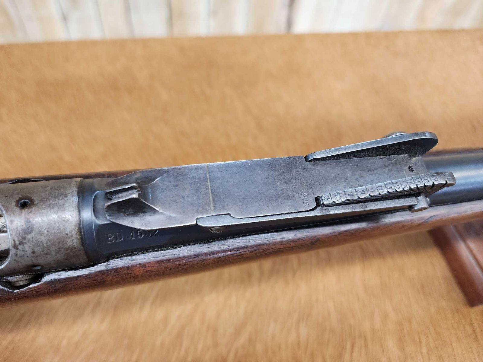 69.38 Possibly Mfg 1874 numbers matching on stock barrel according to the cartouche on the stock this gun was converted from a single Shot to a 4 shot repeater in 1888 interesting piece this is an antique gun no ffl required shiny bore good rifling action seems crisp this gun was converted about 137 years ago SN BD1532