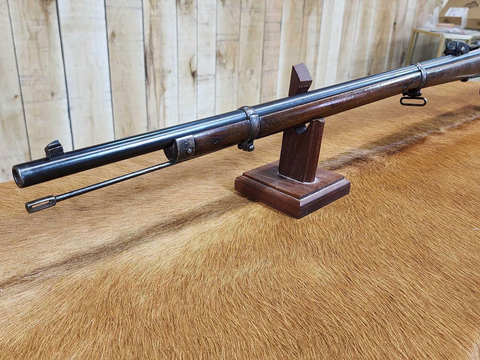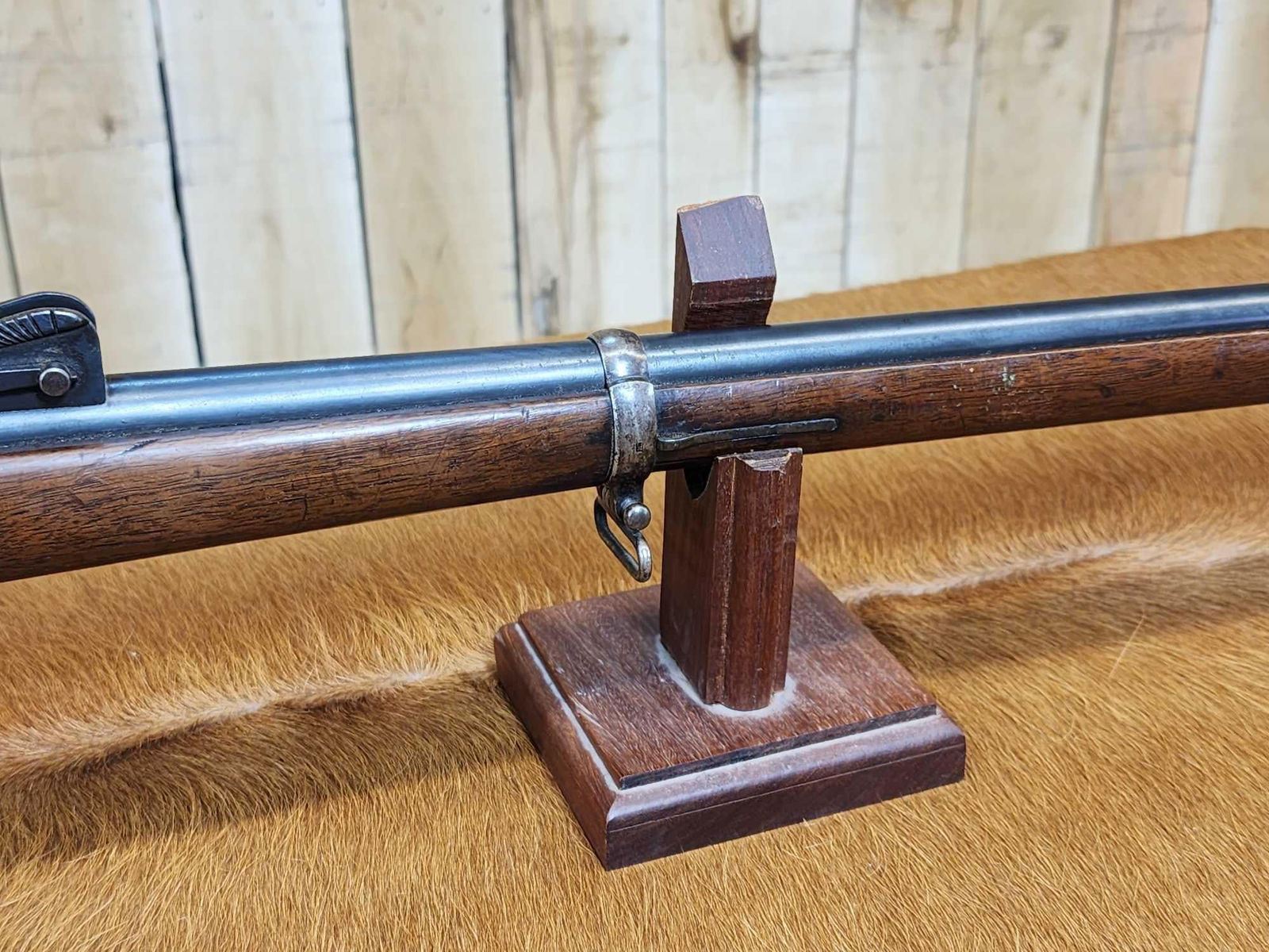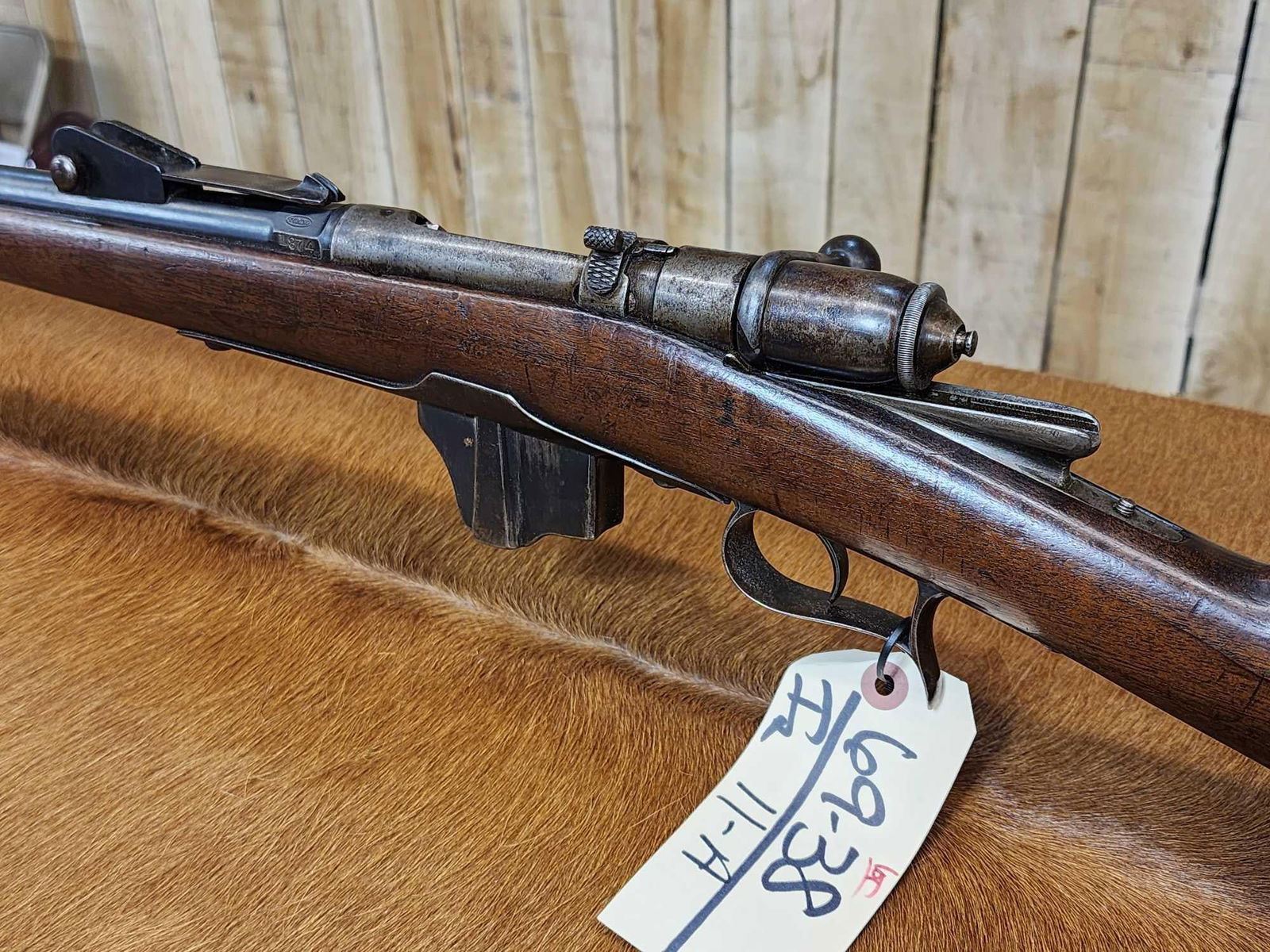69.38 Possibly Mfg 1874 numbers matching on stock barrel according to the cartouche on the stock this gun was converted from a single Shot to a 4 shot repeater in 1888 interesting piece this is an antique gun no ffl required shiny bore good rifling action seems crisp this gun was converted about 137 years ago SN BD1532