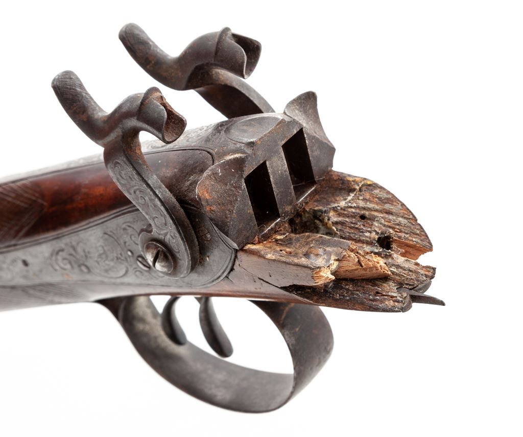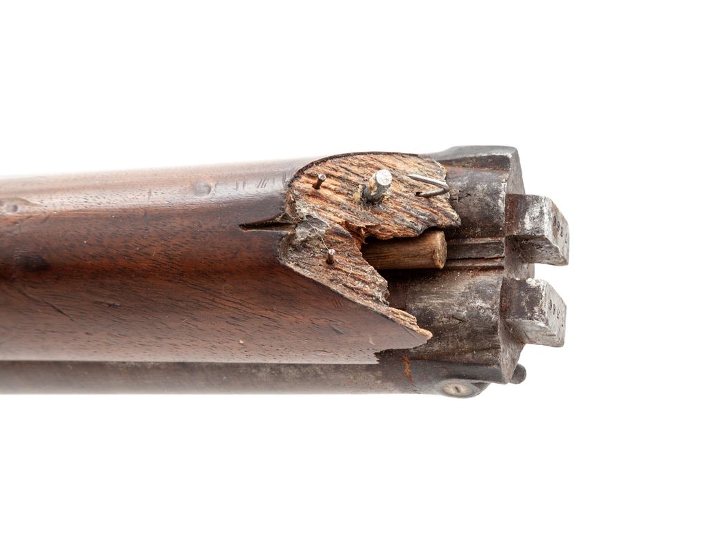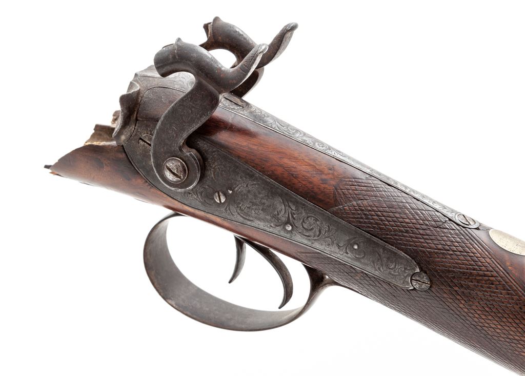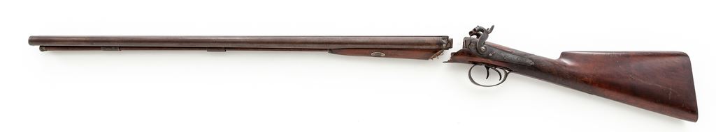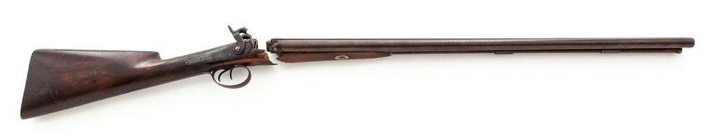 Victorian Era English Percussion Side-by-Side Shotgun, NVSN, 12 ga., 30'' barrels, rib marked ''R. Udall, Edmonton'', fine twist Damascus barrels, lightly engraved back locks, with double gold band near percussion nipples. Edmonton in this case is a borough of London. Condition is fair, the stock having been broken just forward of lock assembly, showing several old repairs. Once repaired, a nice representative piece from a scarce maker. Est.: $250-$400. (Antique)